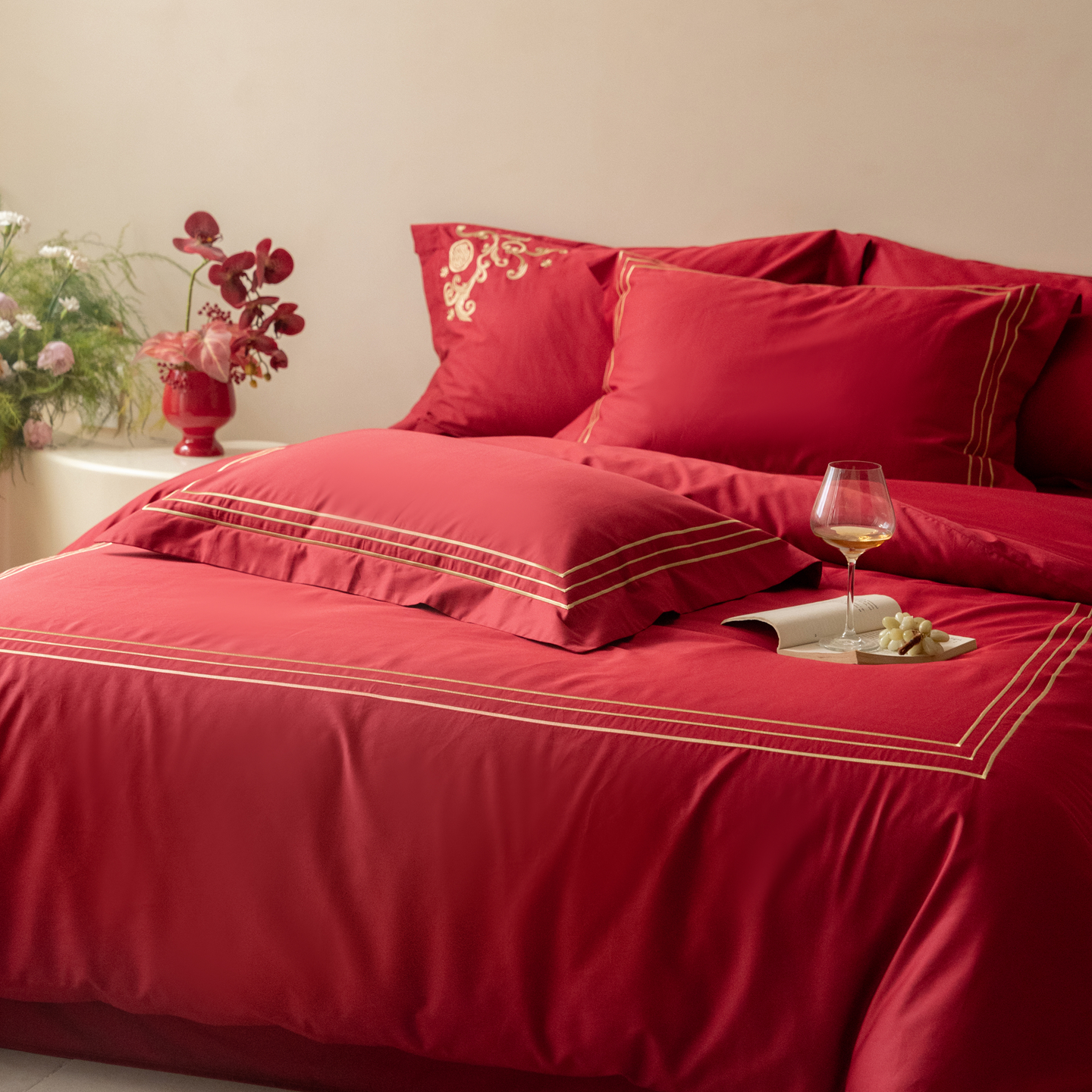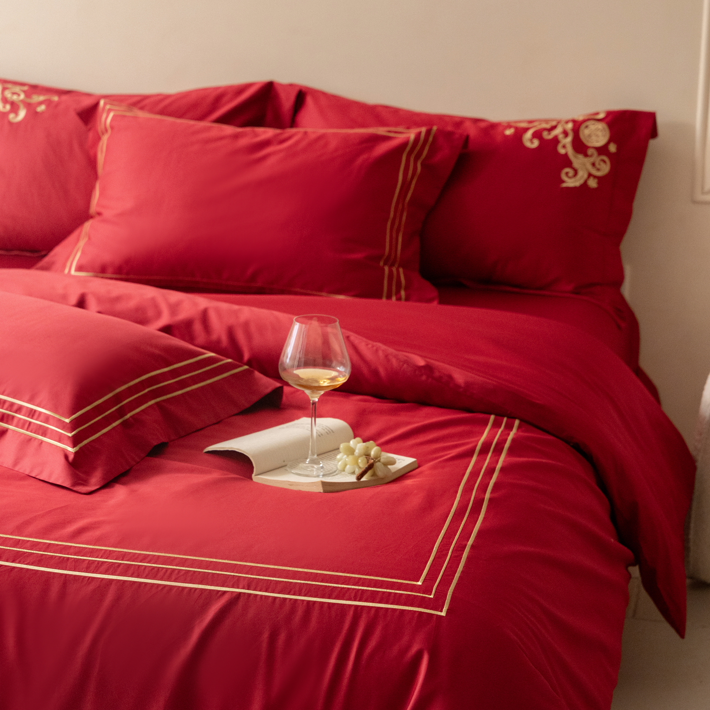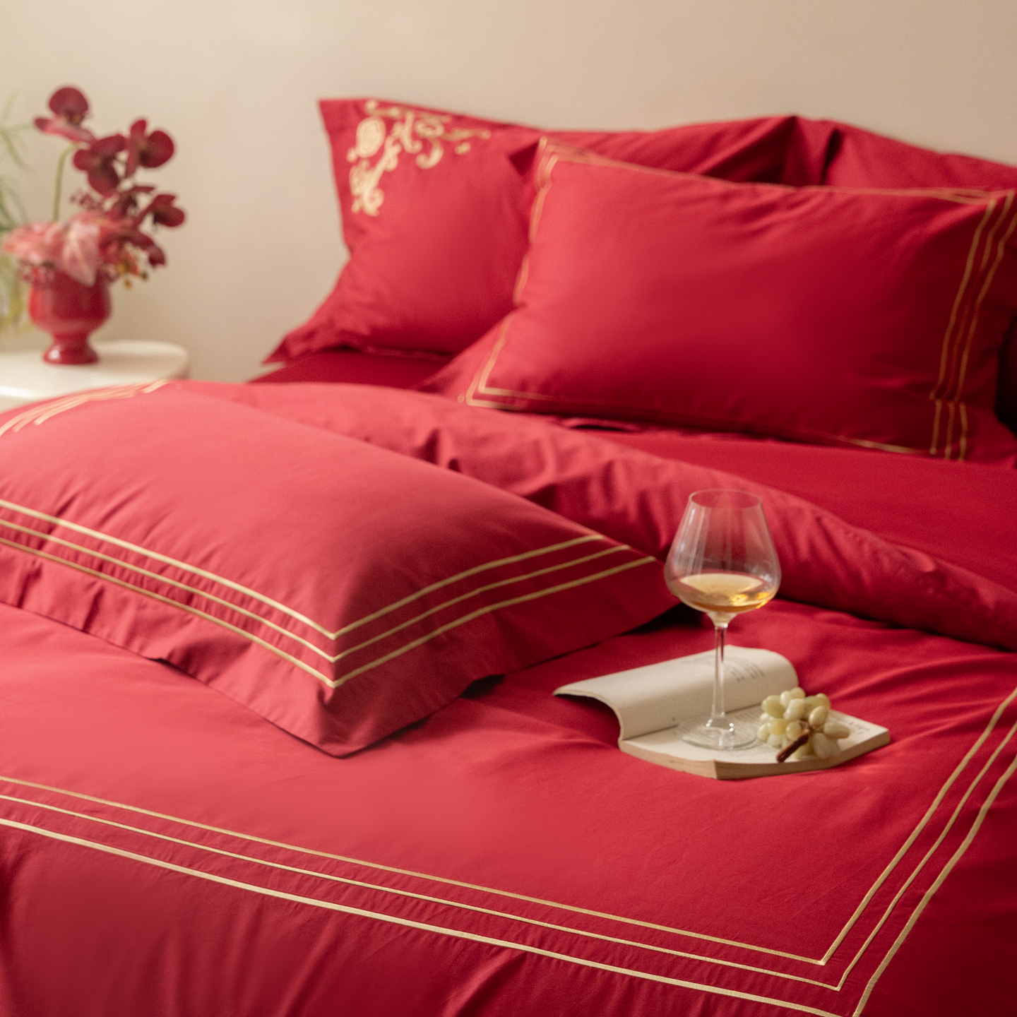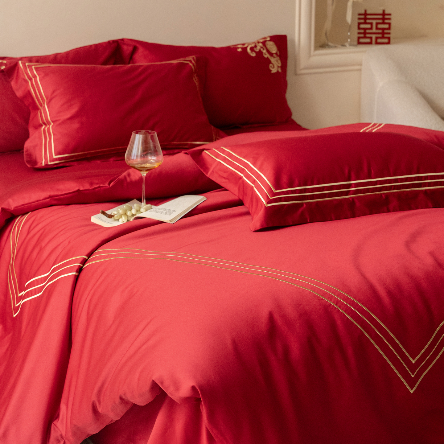 (总)安力森/诚臻酒店用品 2026新款结婚被套四件套婚庆纯棉全棉红色被套床单床上用品床笠月光欢喜刺绣
