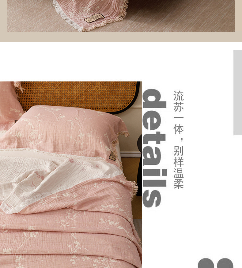 • 91家纺网 家纺一手货源 找家纺 朴尔家纺-毛巾被 2026新款全棉60s精细纱流苏花边四层纱布毛巾被 樱花恋