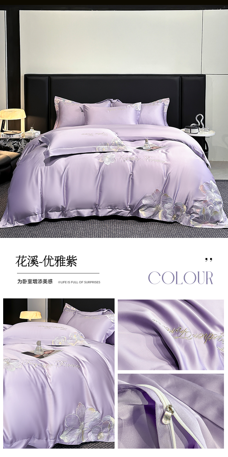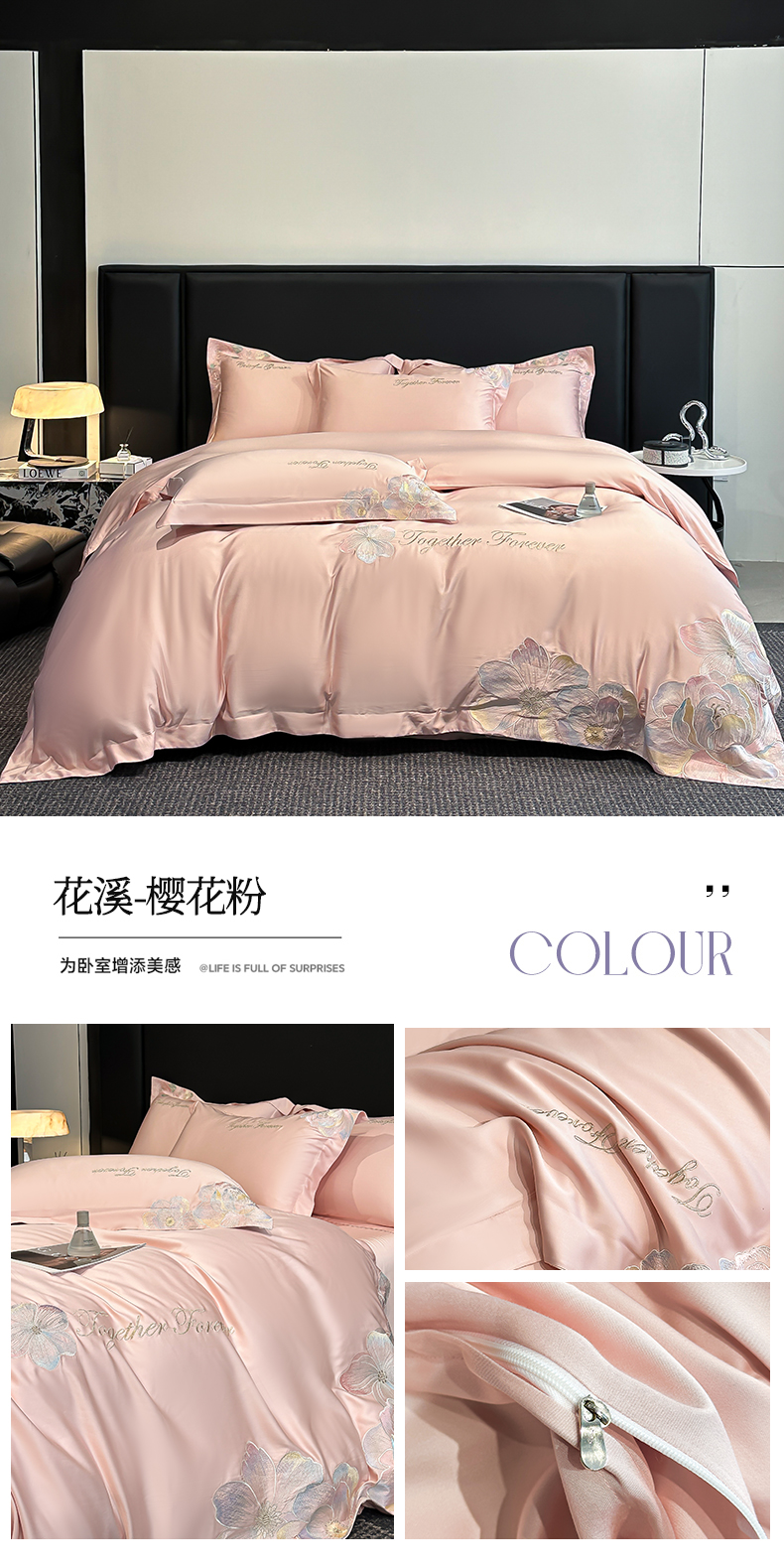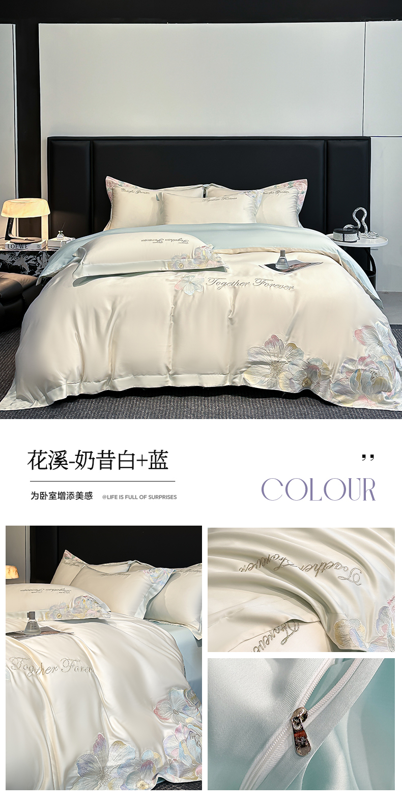 (总)润锦云 2026新款高支高密刺绣四件套-花溪系列,花溪-奶昔白+粉,花溪-奶昔白+蓝,花溪-奶昔白+紫,花溪-天空蓝,花溪-樱花粉,花溪-优雅紫