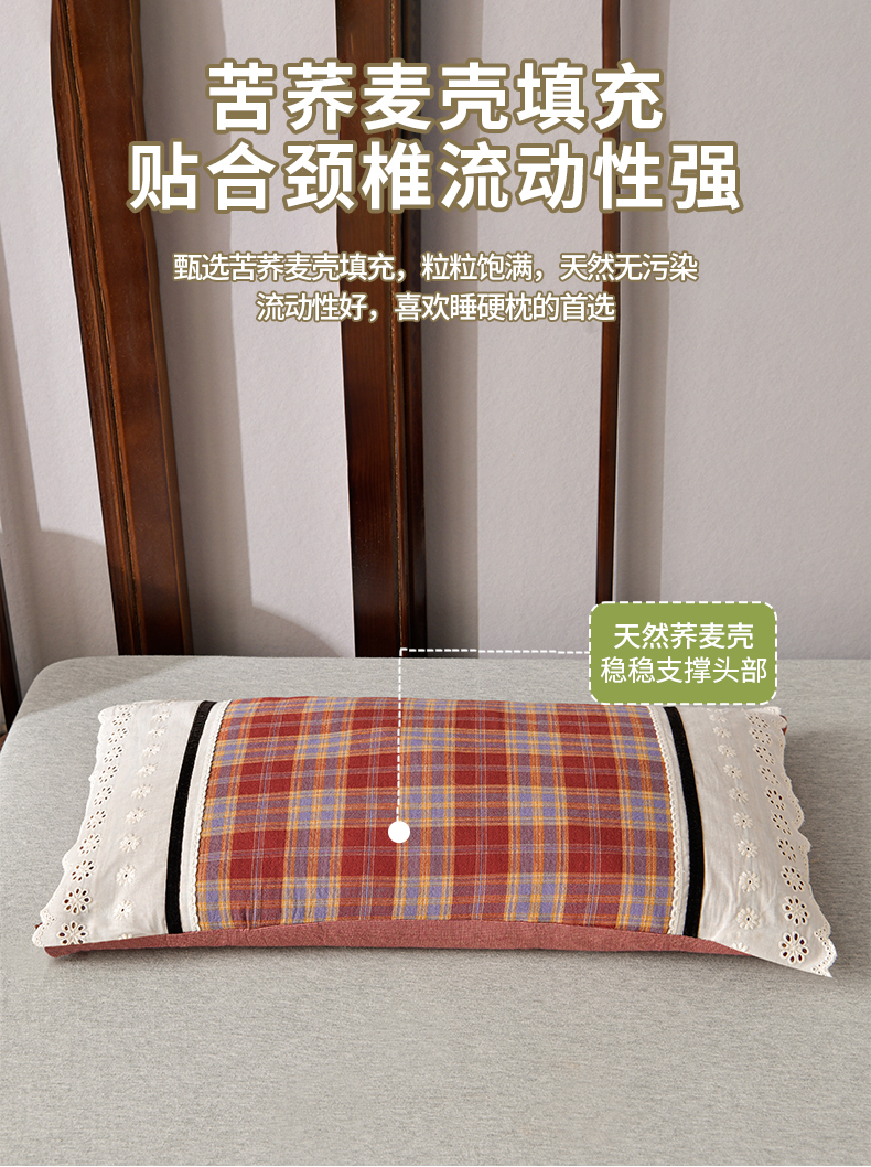 商品名称:小桃姐家纺 2025新款花边全棉纯棉双层纱荞麦枕枕芯枕头 咖小格