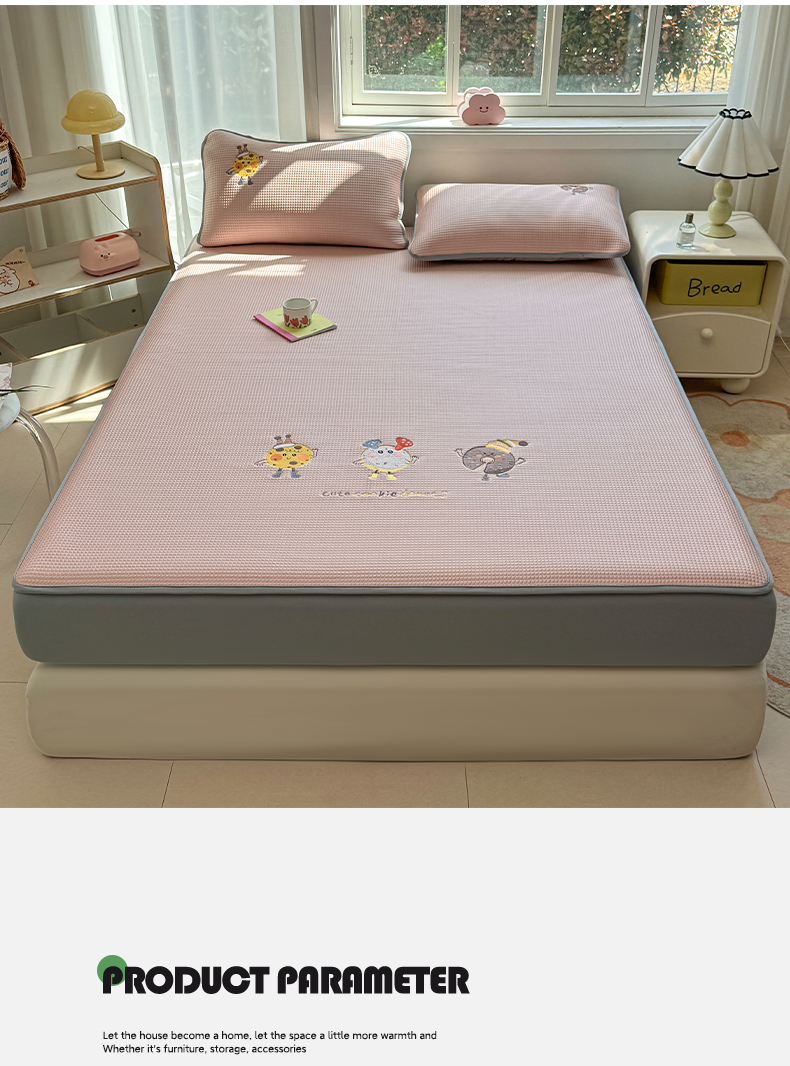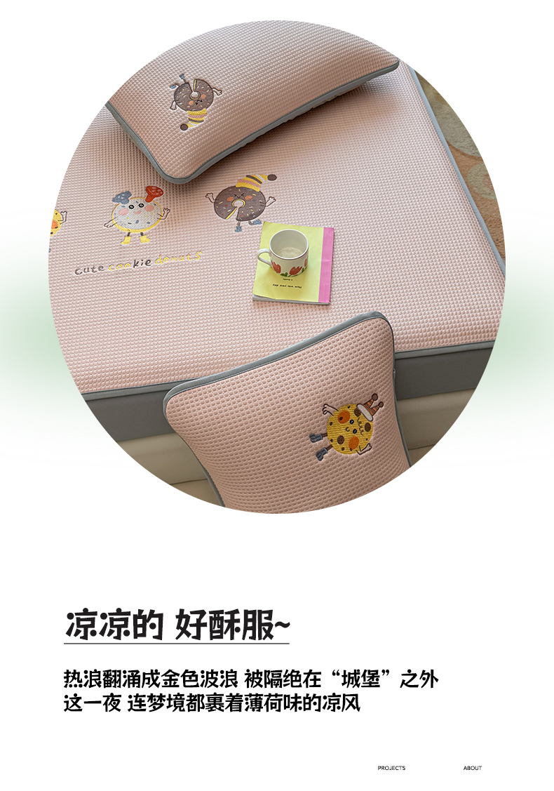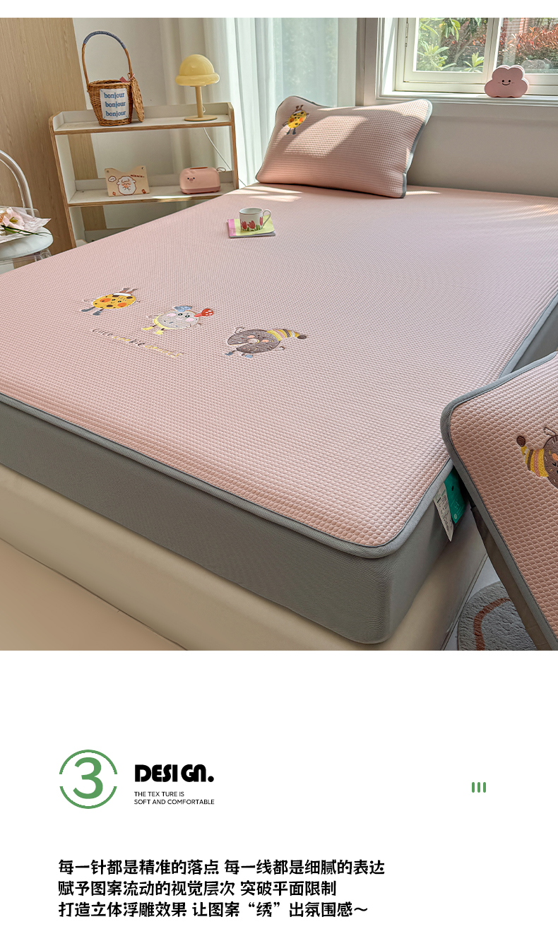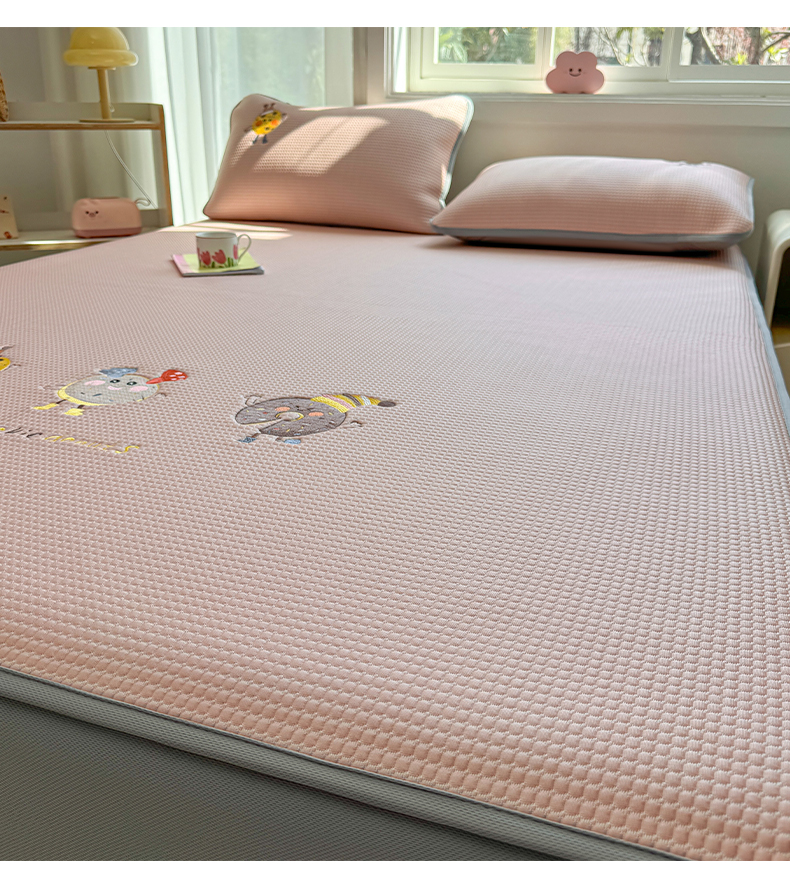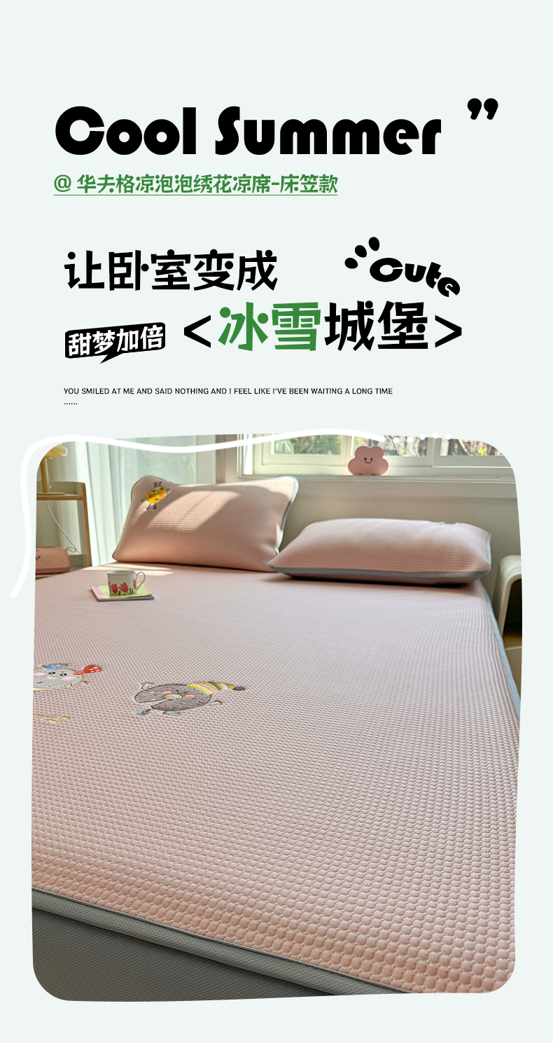 商品名称:凯罗 2026新款华夫格凉泡泡绣花凉席席子-床笠款 乐享狂嗨-粉