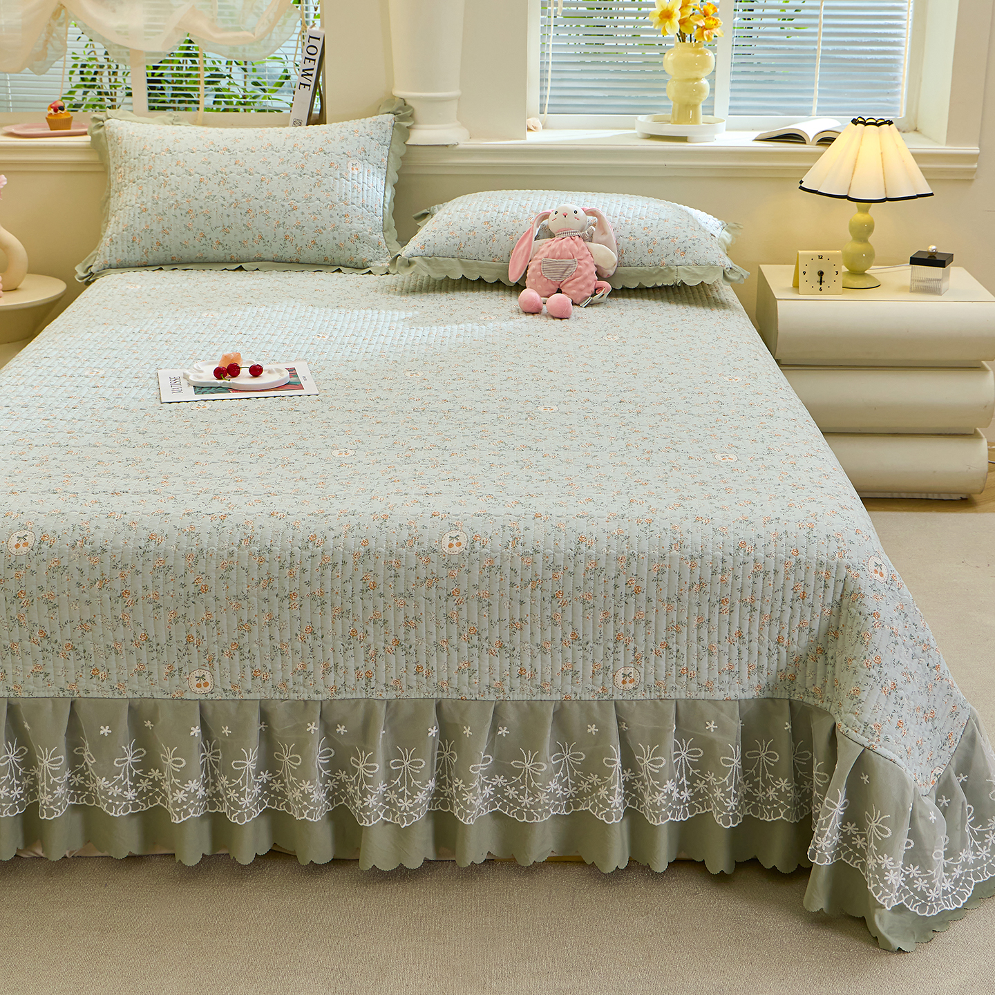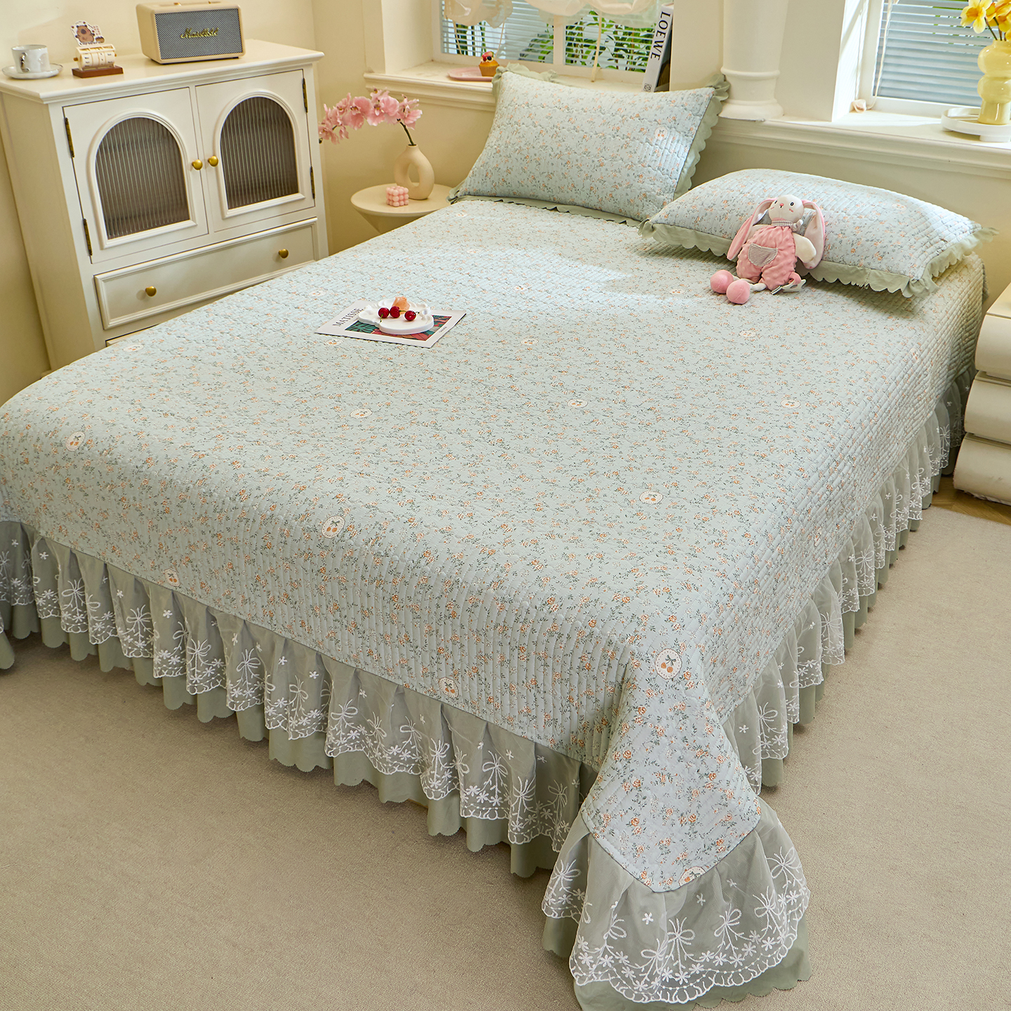 • 91家纺网 家纺一手货源 找家纺 彩亿家纺 2026新款A类古法水洗仿棉蕾丝床盖三件套 爱心格