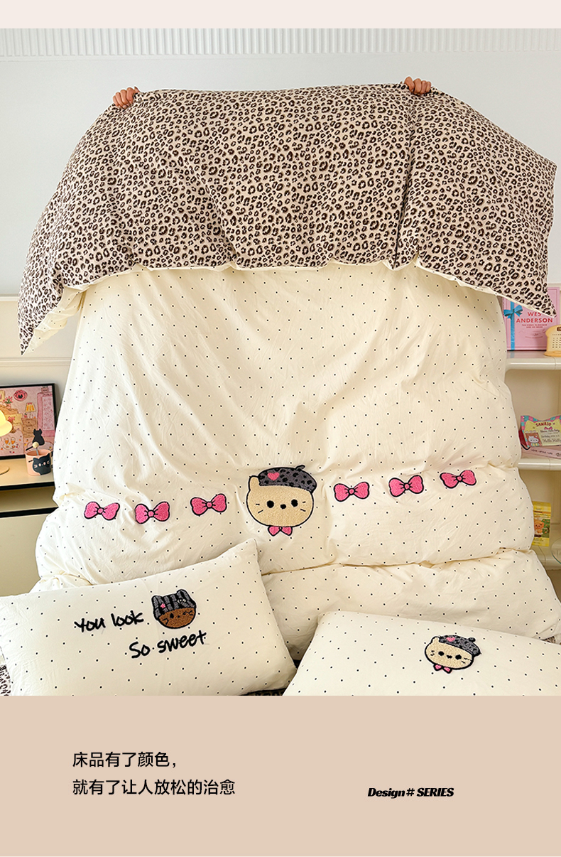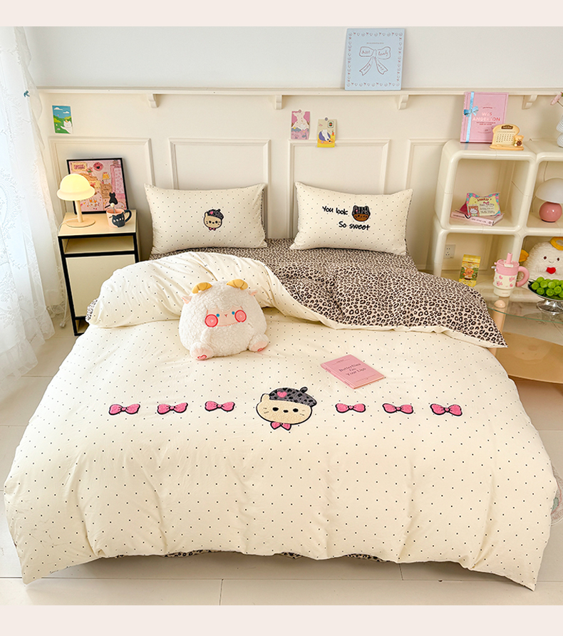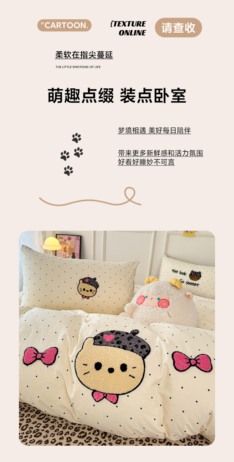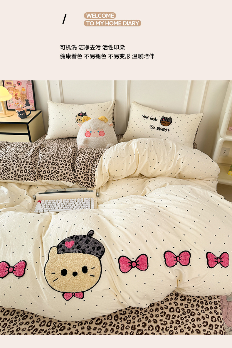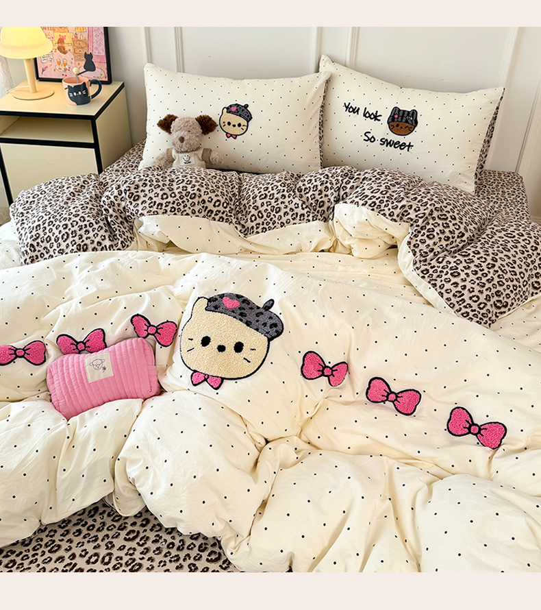当前位置: 91家纺网 > 商品网购 > 床品套件 > 四件套 > 毛巾绣四件套 > 三朵家纺 2026春夏新款云柔棉水洗棉毛巾绣四件套 蝴蝶结小猫-豹纹