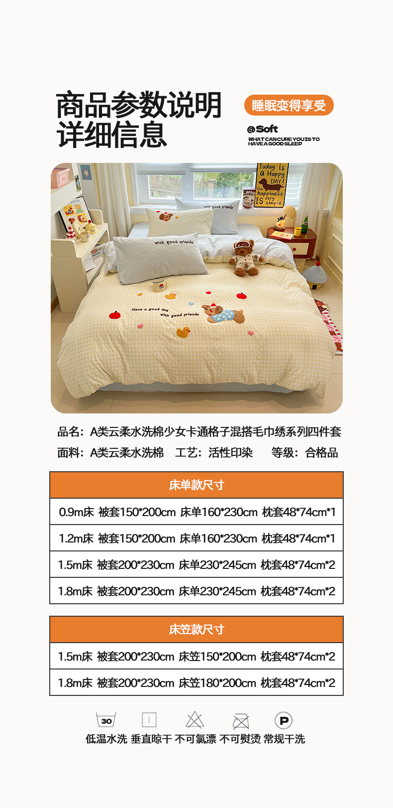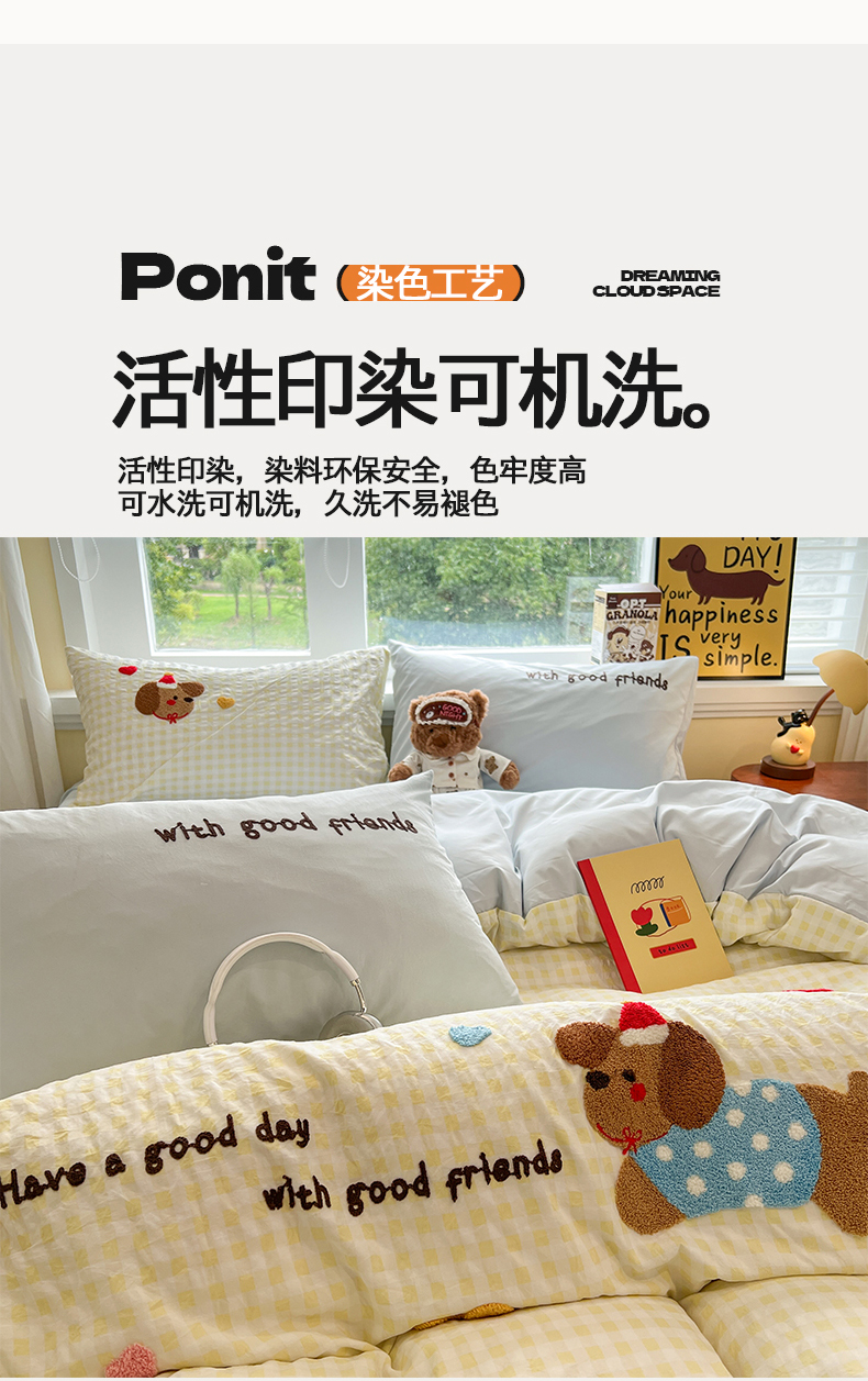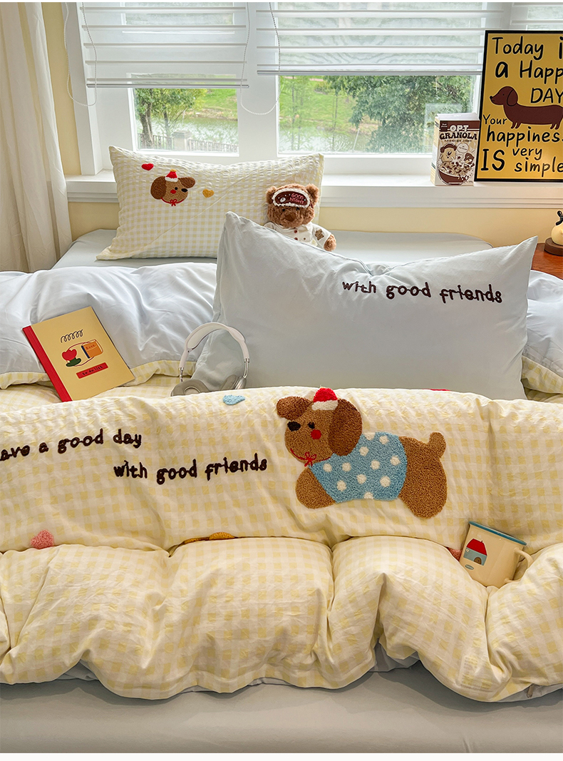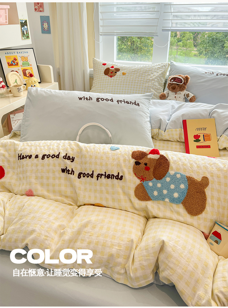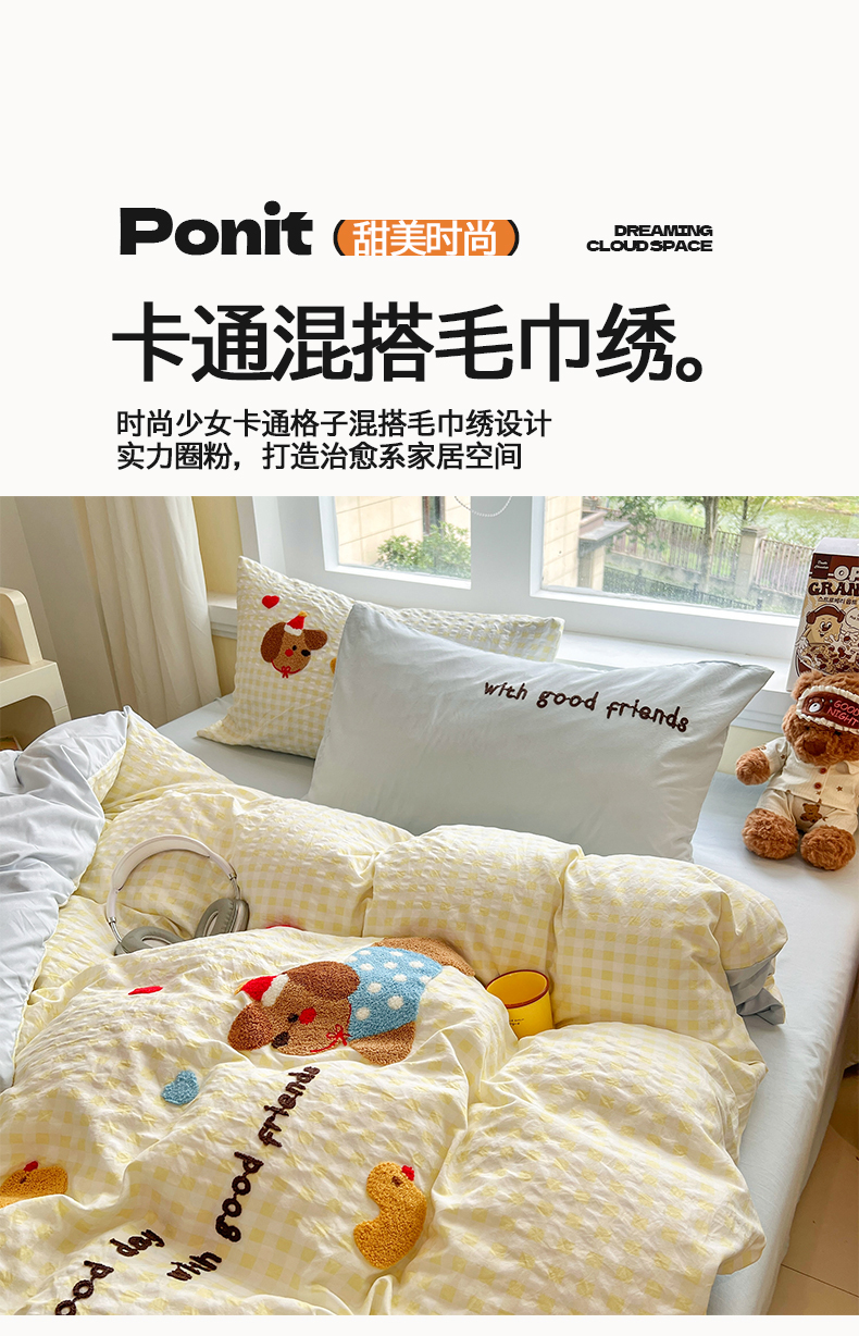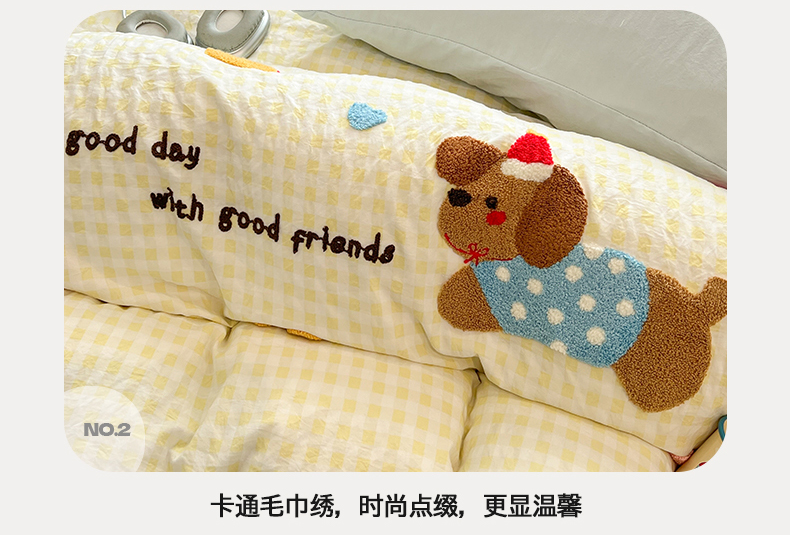 当前位置: 91家纺网 > 商品网购 > 床品套件 > 四件套 > 毛巾绣四件套 > 桃心家居 2026新款A类亲肤舒适软糯云柔水洗棉少女卡通格子混搭毛巾绣水洗棉系列四件套 云柔水洗棉-毛巾绣美好小腊肠