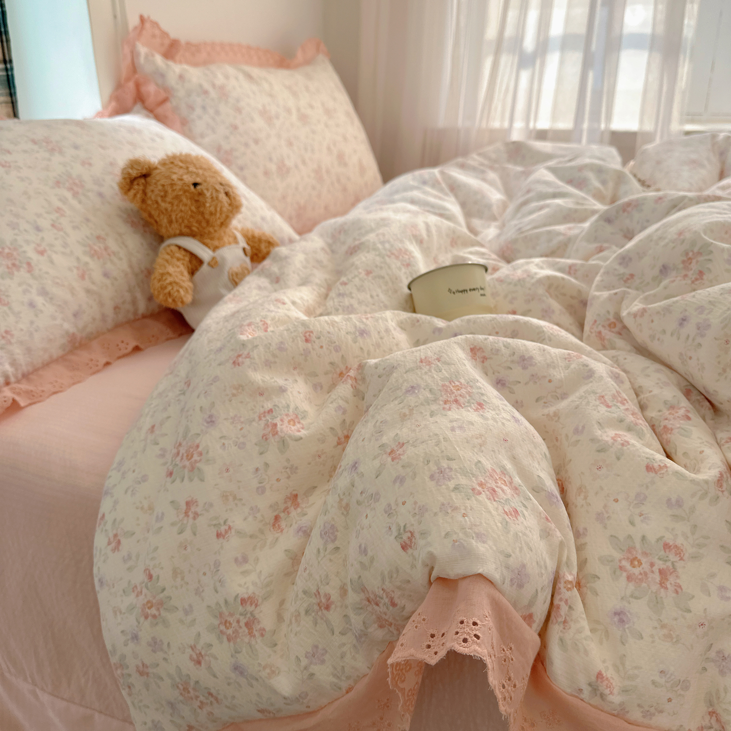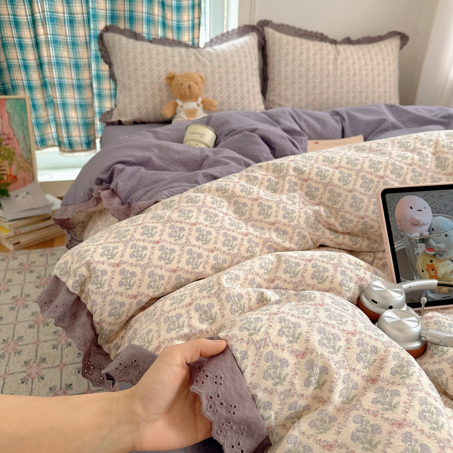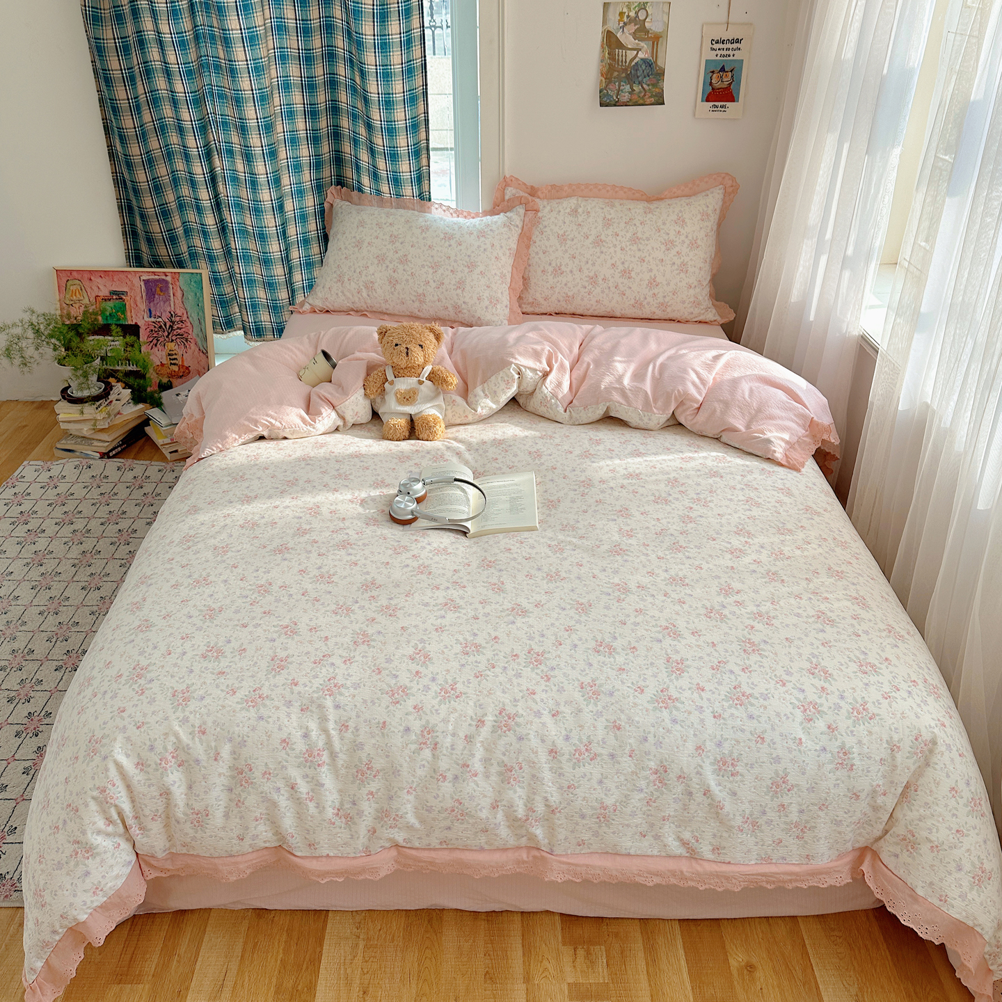 商品名称:一比一家纺 2026新款彩色花边木棉皱皱纱四件套 甜心格格