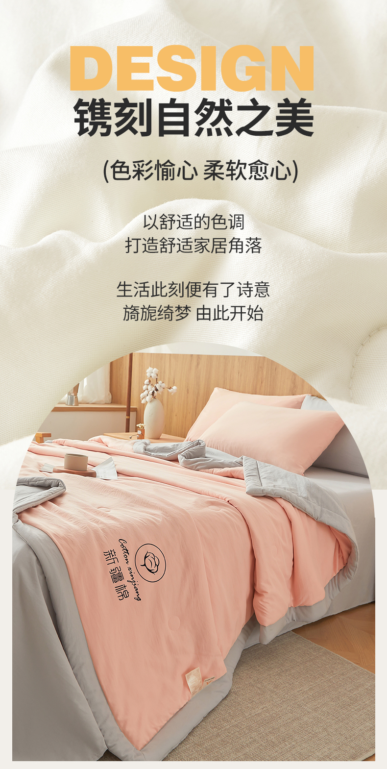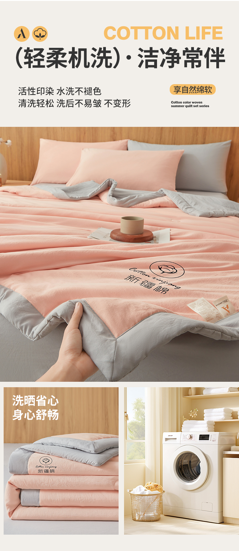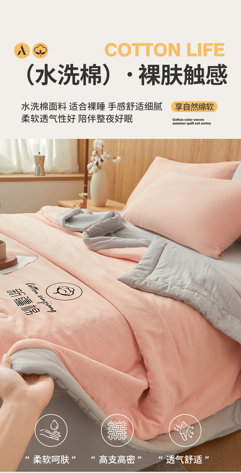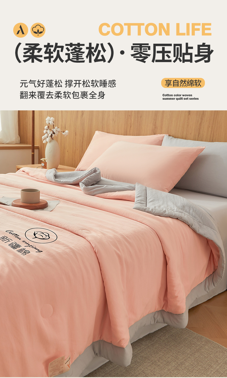 商品名称:晓时候 2026春夏新款纯色水洗棉双拼夏被新疆棉花被夏凉被空调被被子被芯-素夏 素夏-粉灰