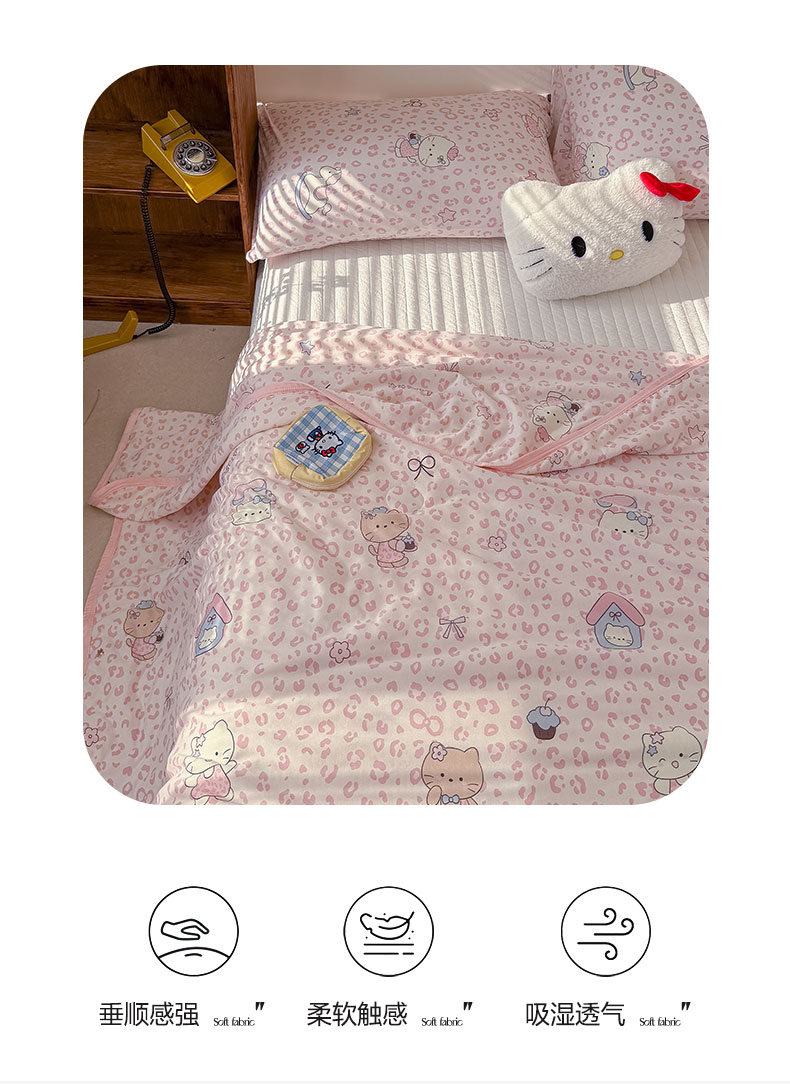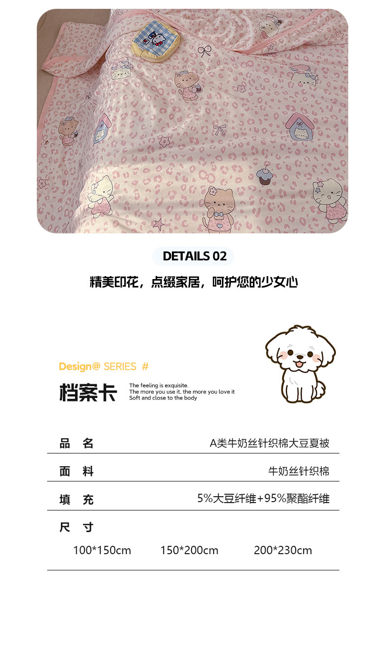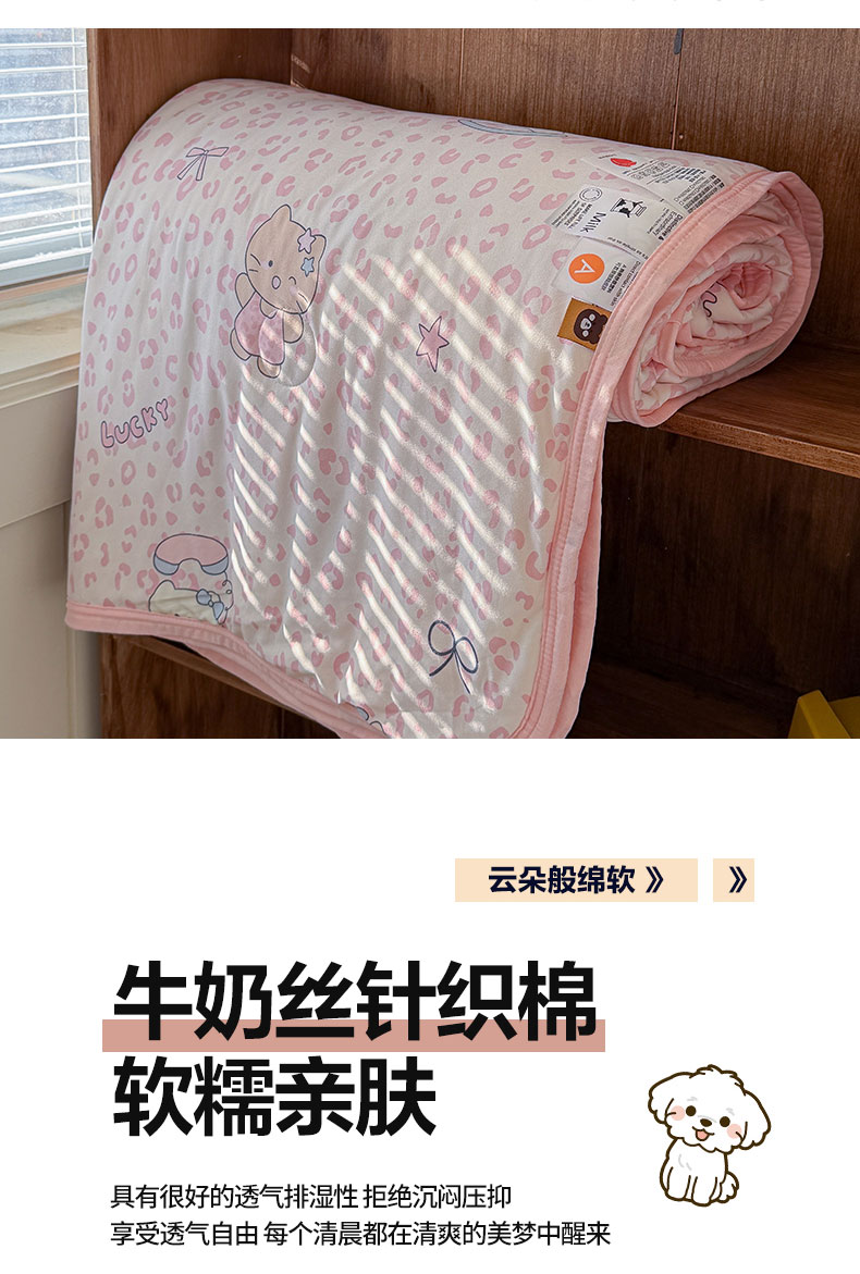商品名称:桃子家居 2026新款A类卡通小清新印花高品质牛奶丝软糯针织棉包边夏被系列 针织棉-甜梦粉猫