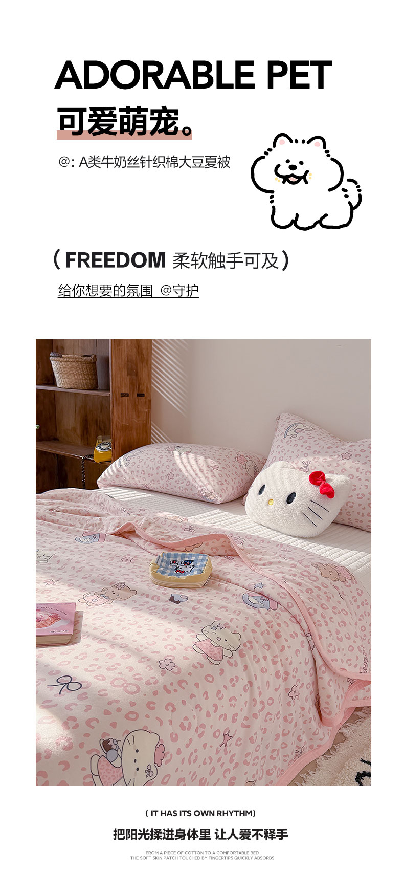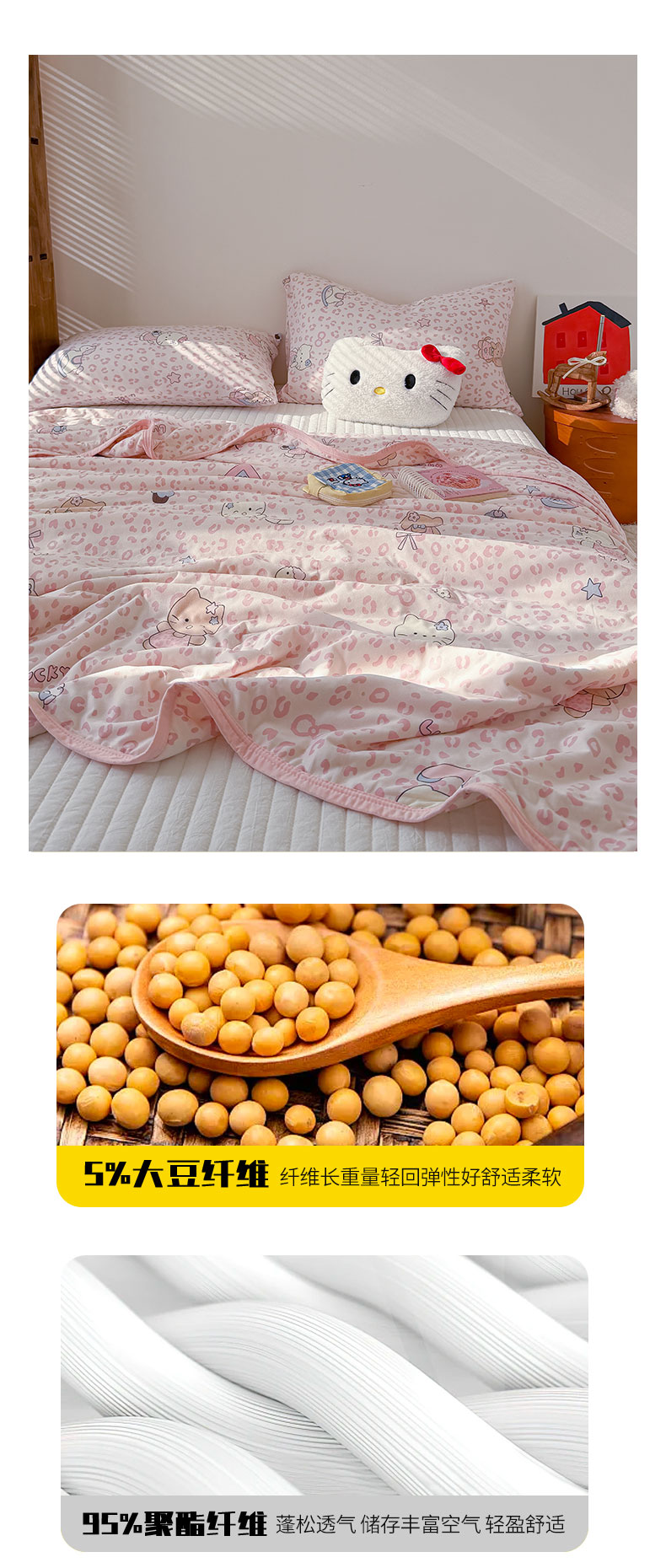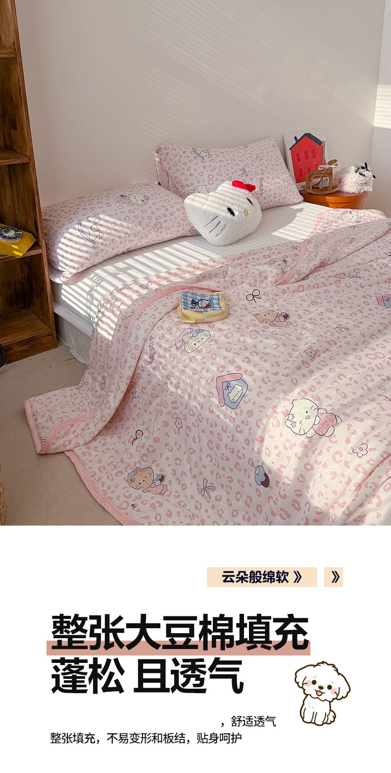 商品名称:桃子家居 2026新款A类卡通小清新印花高品质牛奶丝软糯针织棉包边夏被系列 针织棉-甜梦粉猫