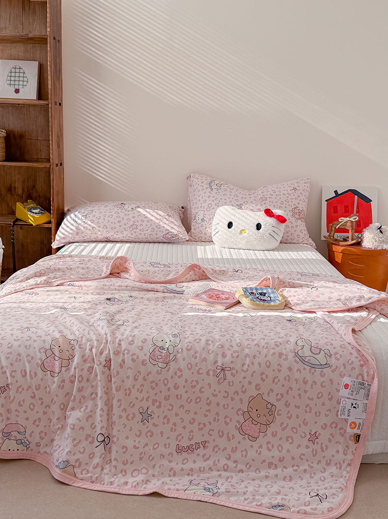 桃子家居 2026新款A类卡通小清新印花高品质牛奶丝软糯针织棉包边夏被系列 针织棉-甜梦粉猫
