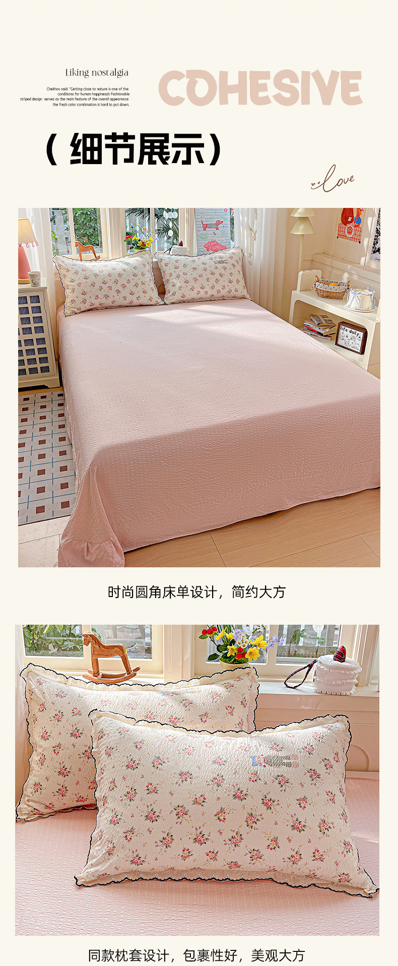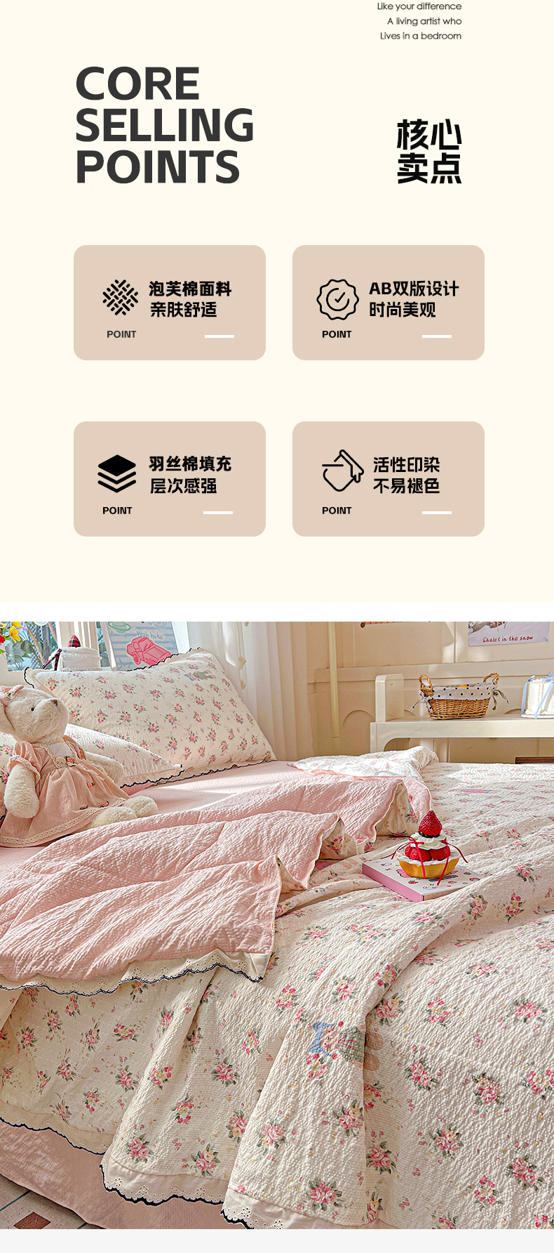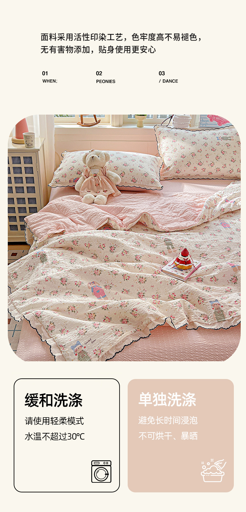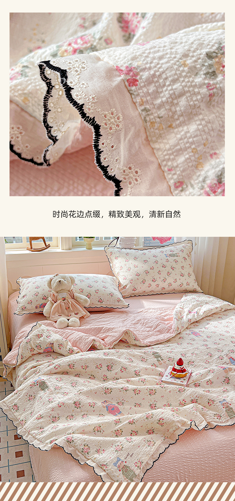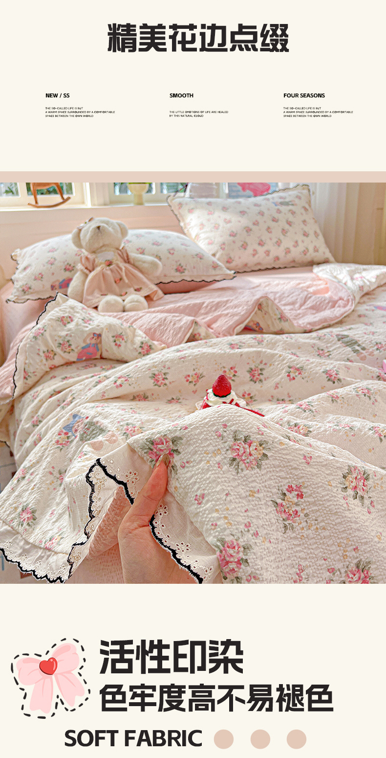 商品名称:禾沐 2026新款云感泡芙纱全棉蕾丝花边款夏被四件套 花丛萌免