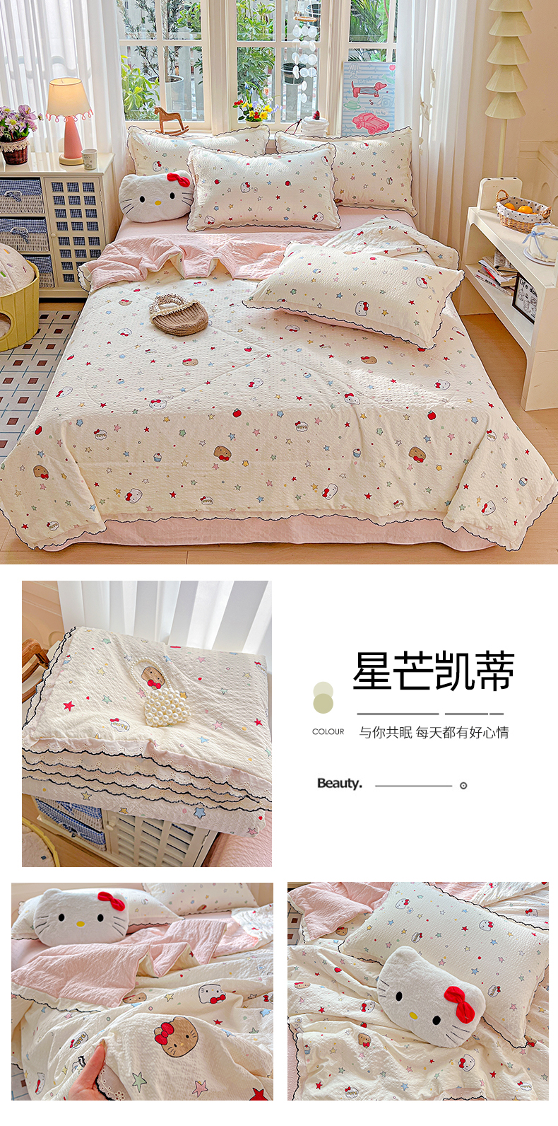 (总)禾沐 2026新款云感泡芙纱全棉蕾丝花边款夏被四件套,波点,花镜人偶,格格心,星芒凯蒂,花丛萌免,莓系花伐,片刻小狗,田园免,只闻花香,格纹熊,花软雾,猫咪集,木马小花团,暖橘枝,蔷薇花,若梦,星星人,胭脂,芋泥花束,悦悦小兔,组合图
