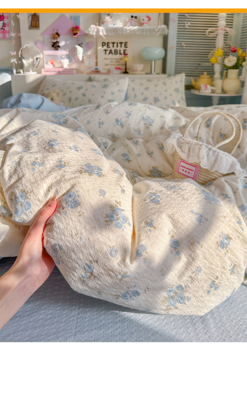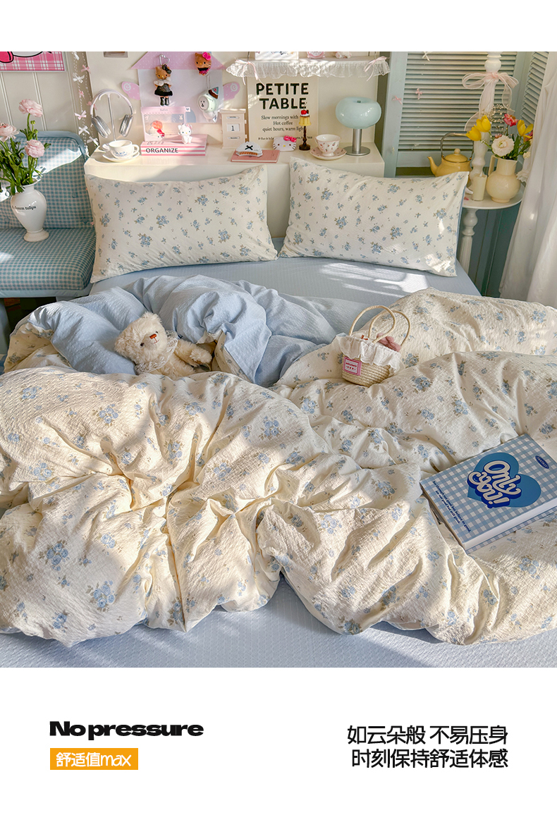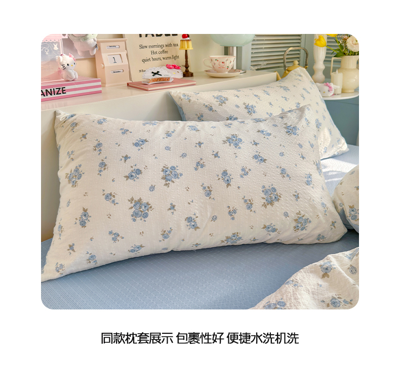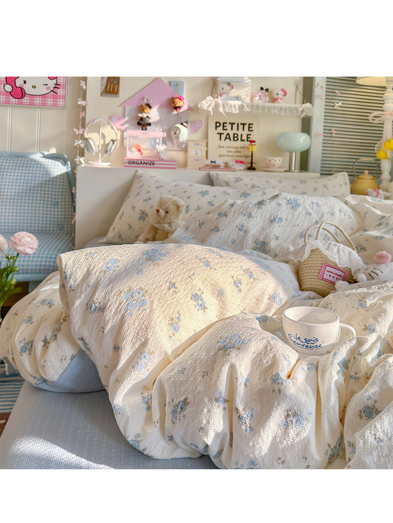 当前位置: 91家纺网 > 商品网购 > 床品套件 > 四件套 > 双层纱四件套 > 铺尚美家纺 2026新款小清新110g高品质直播热卖款A类泡芙棉双层纱四件套 蓝萱