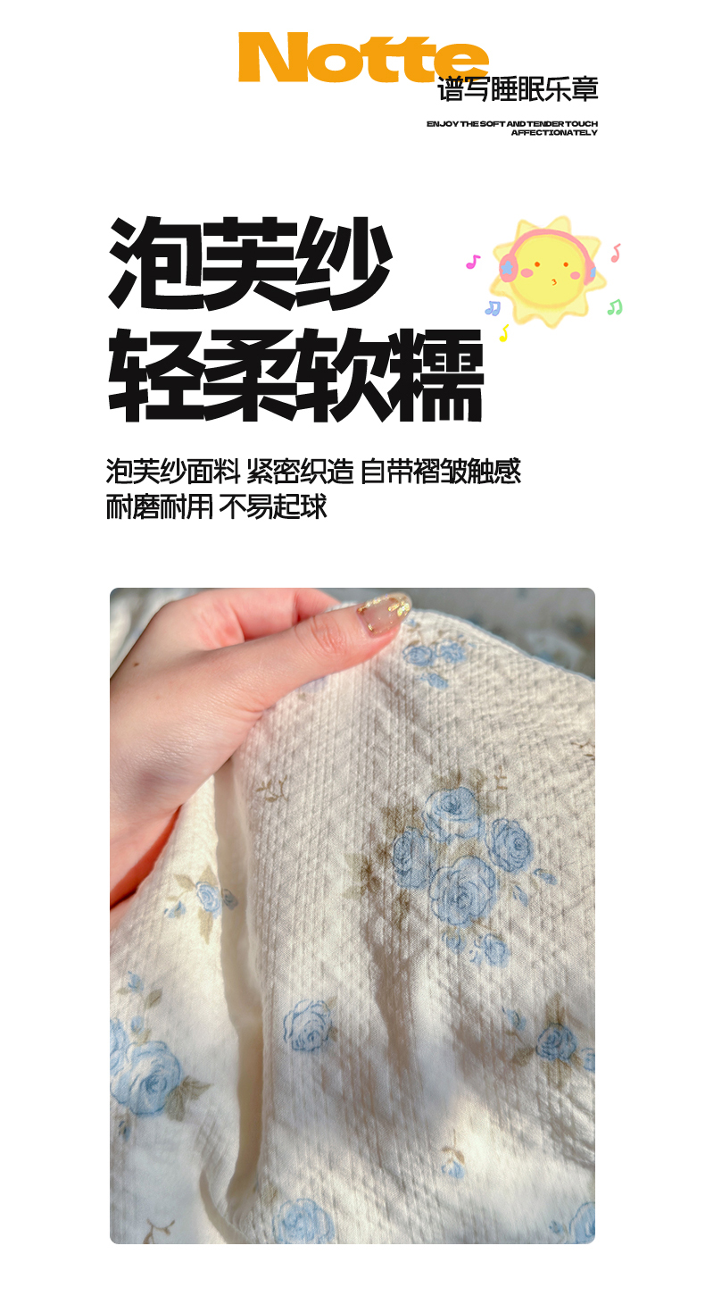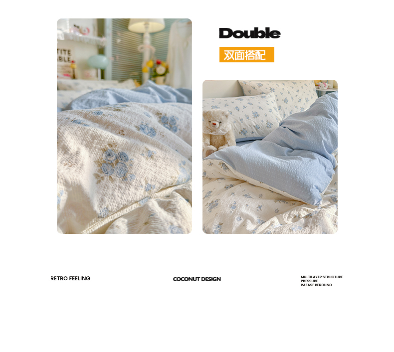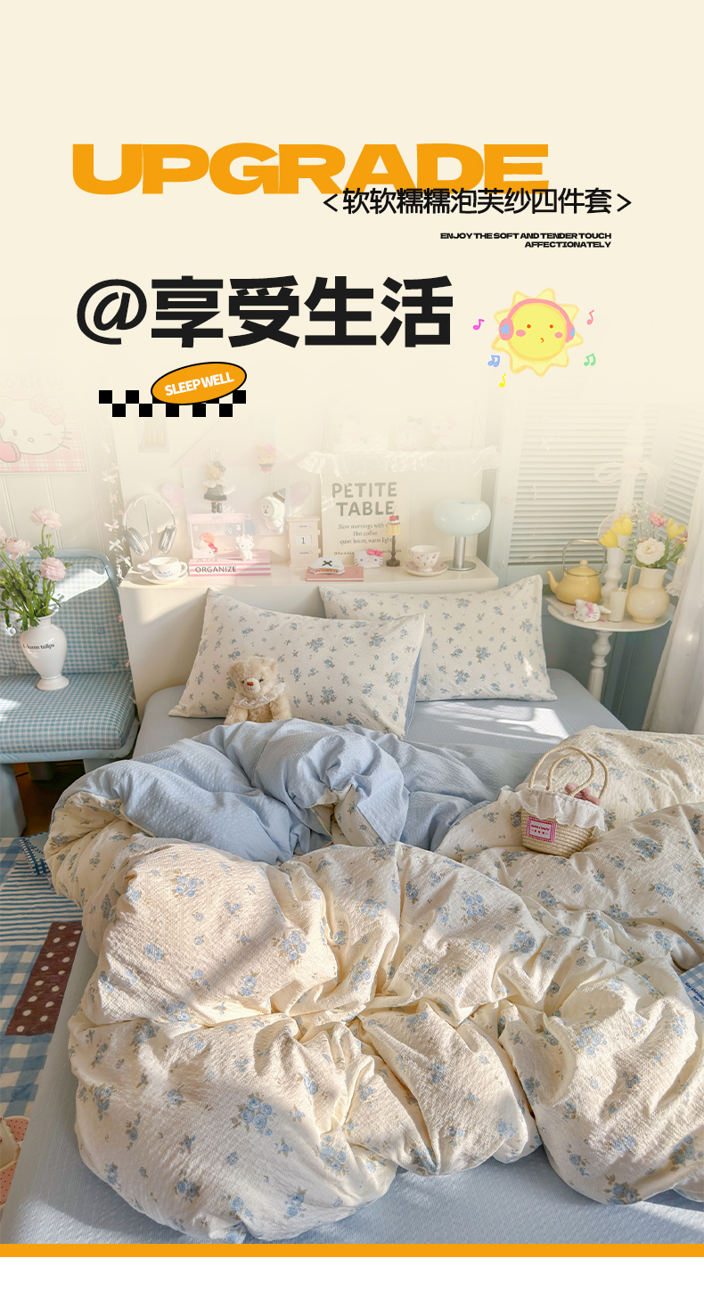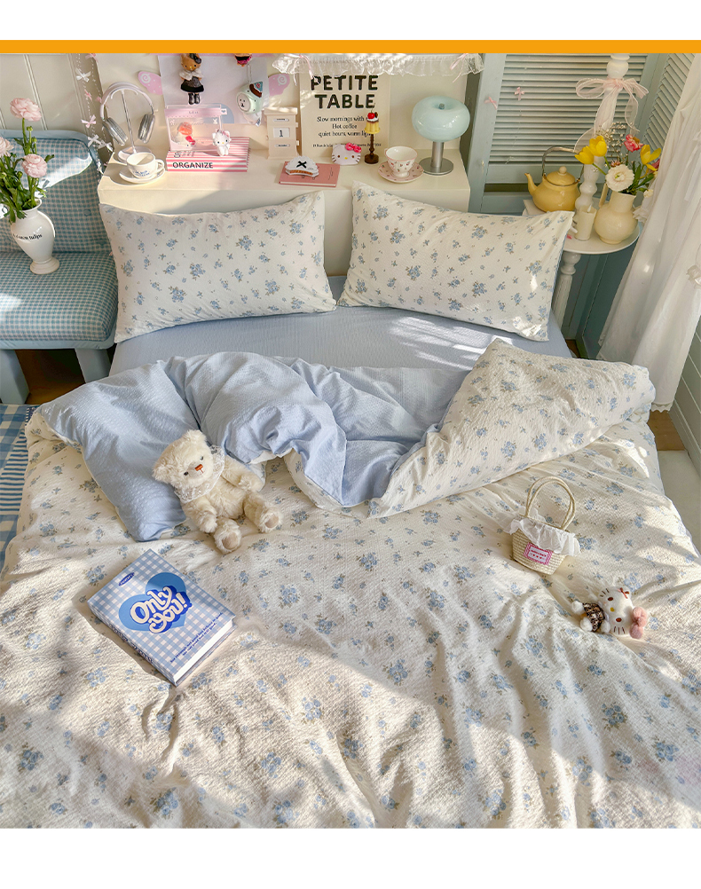 当前位置: 91家纺网 > 商品网购 > 床品套件 > 四件套 > 双层纱四件套 > 铺尚美家纺 2026新款小清新110g高品质直播热卖款A类泡芙棉双层纱四件套 蓝萱