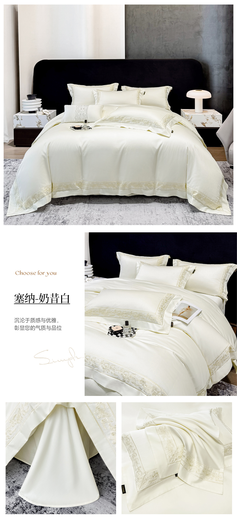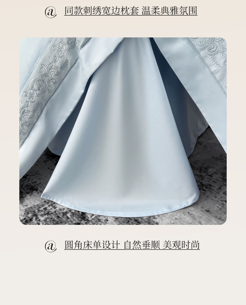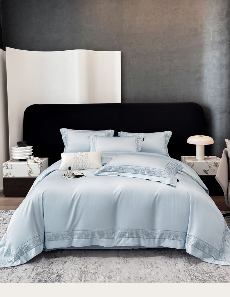 欣宜家纺 2026新品全棉纯棉50x50s埃及贡缎长绒棉刺绣绣花四件套 赛娜-天空蓝