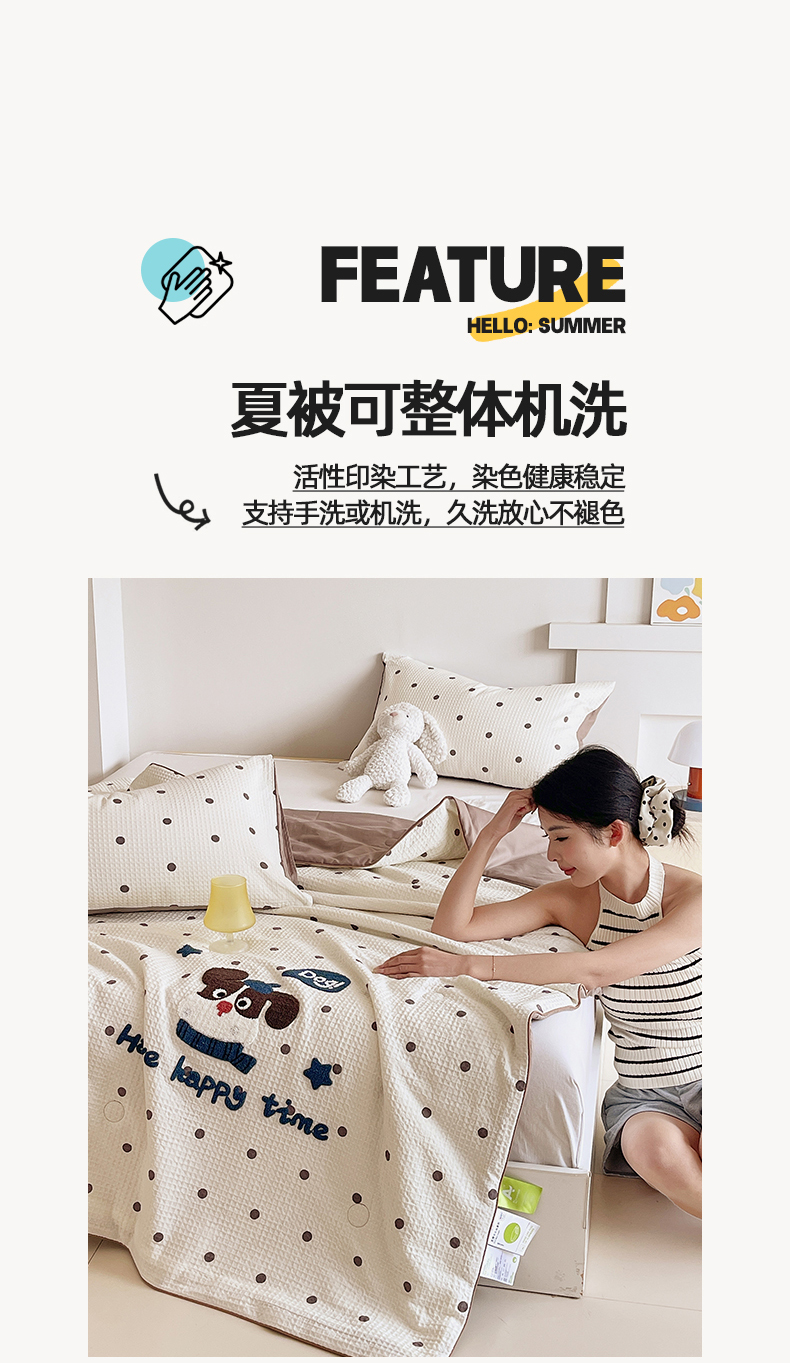 商品名称:莱宁被业 2026新款A类全棉华夫格提花毛巾绣卡通大豆夏被 圆点小狗