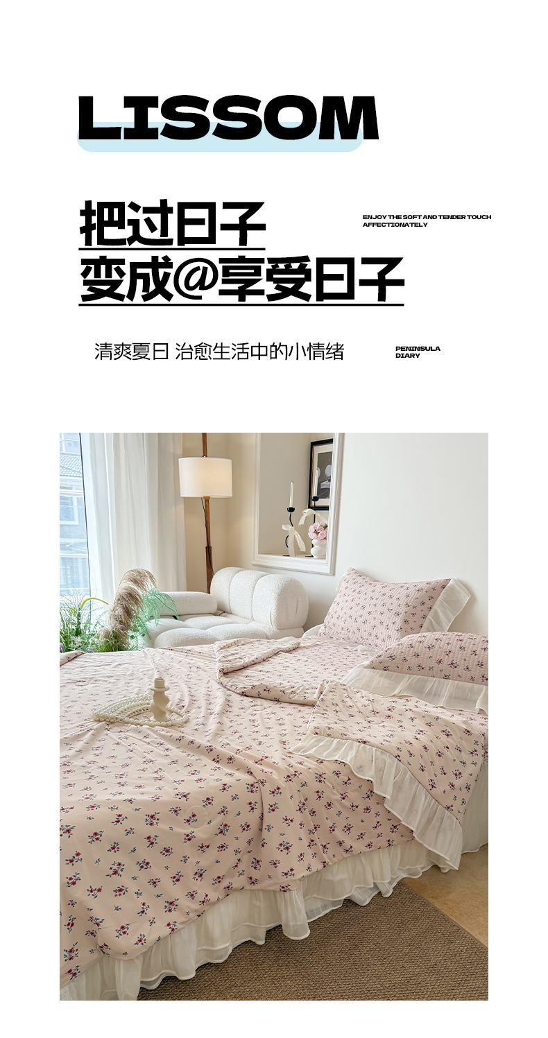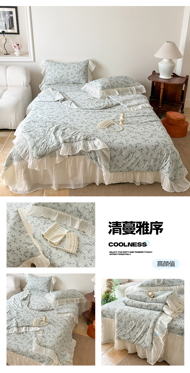 商品名称:吾欢心 2026新款仿锦安法式花边凉感丝床盖款夏凉被四件套软凉席三件套小冰皮空调被 素锦花影