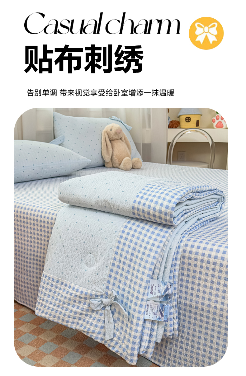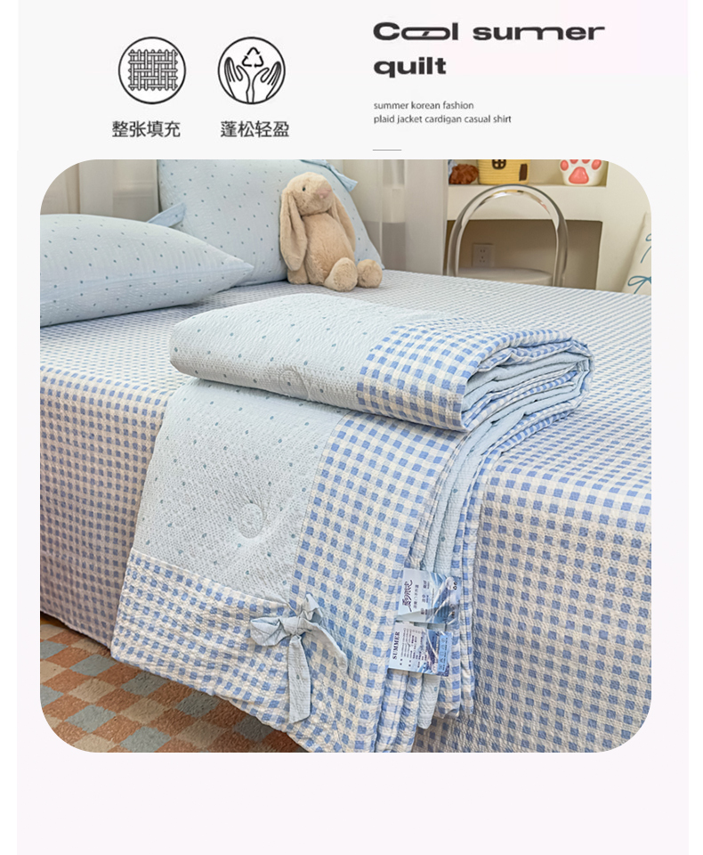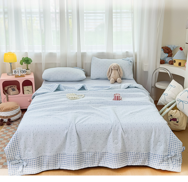 爱彼家纺 2026春夏新款韩式花边泡芙棉床单款夏被夏凉被空调被四件套 海盐蓝波点