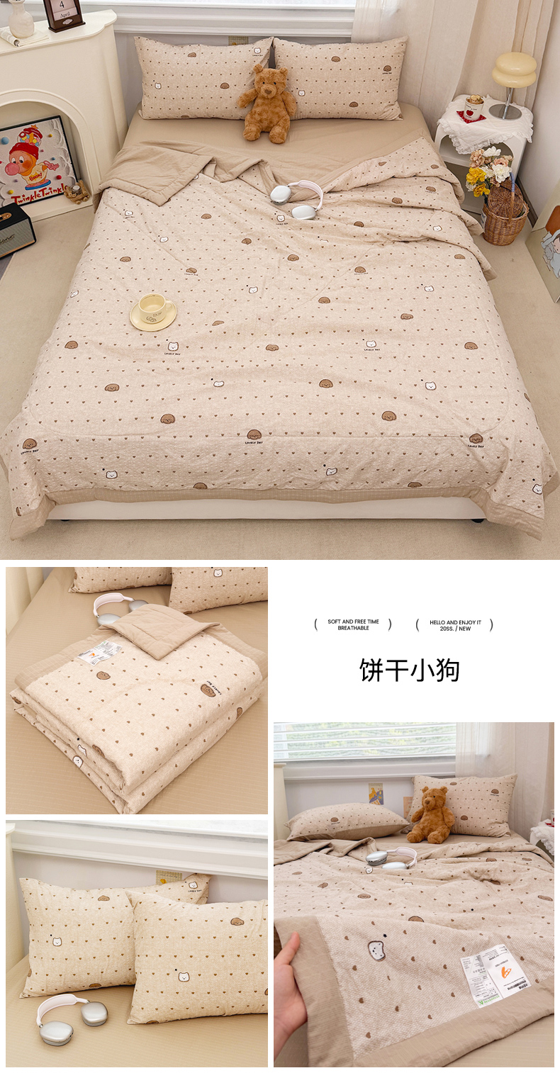 (总)娜朵家纺 2026新款A类泡芙双层纱大豆夏被夏凉被空调被四件套,蓝色豹纹,绵绵狗,小马哒哒,星际小喵,极简几何,黑脸小猫,田园逸趣,线条小狗,饼干小狗,木马摇摇,hello小猫,星梦园