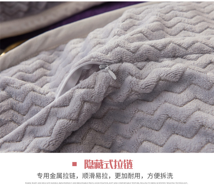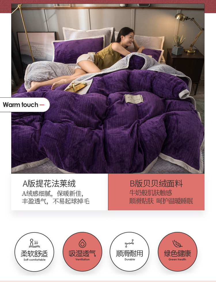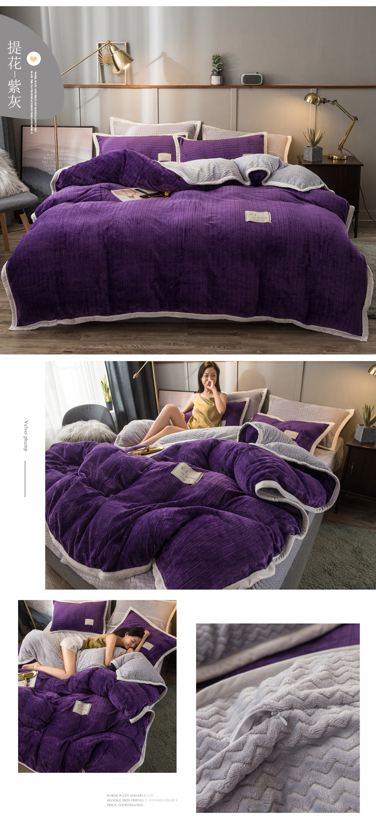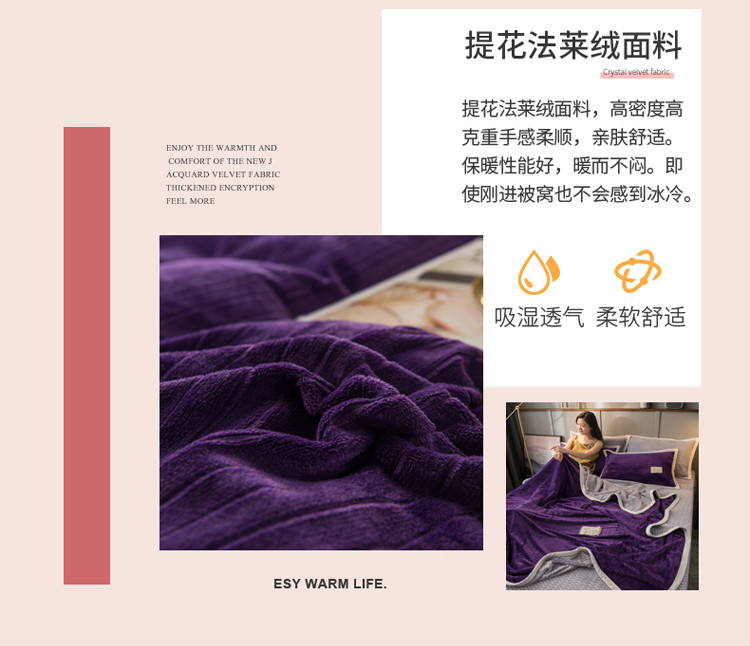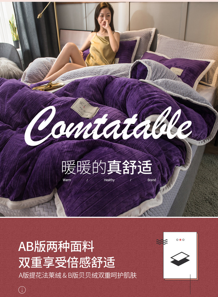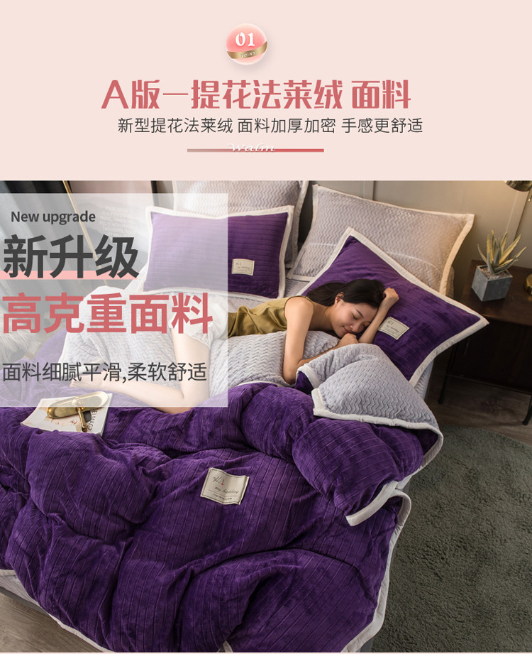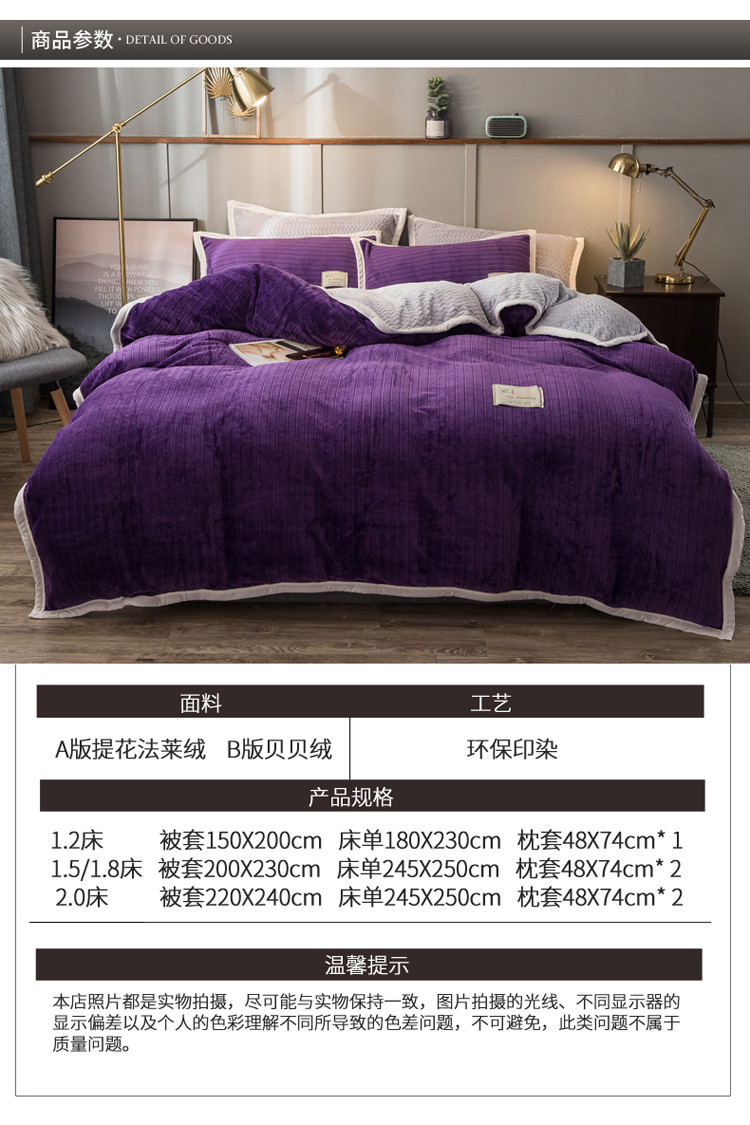 商品名称:欧冠 2019提花法莱绒加贝贝绒加厚四件套 紫灰