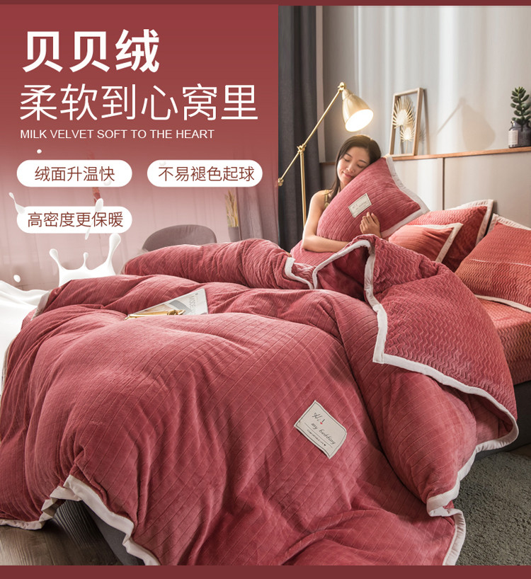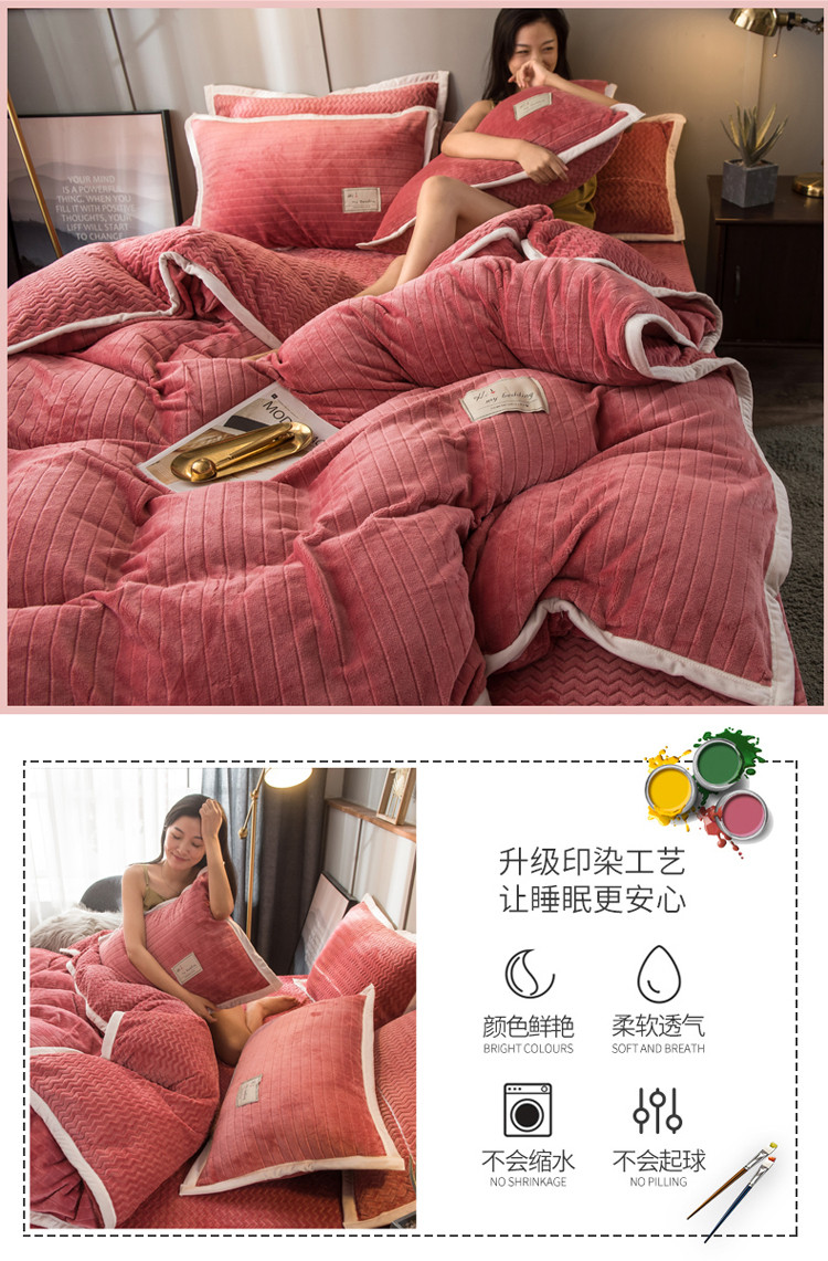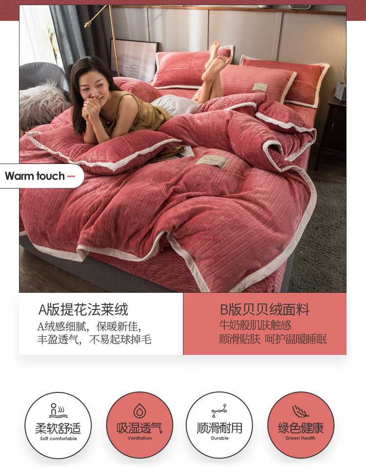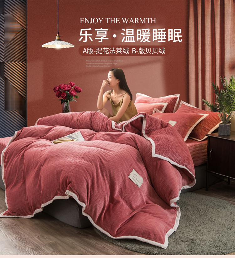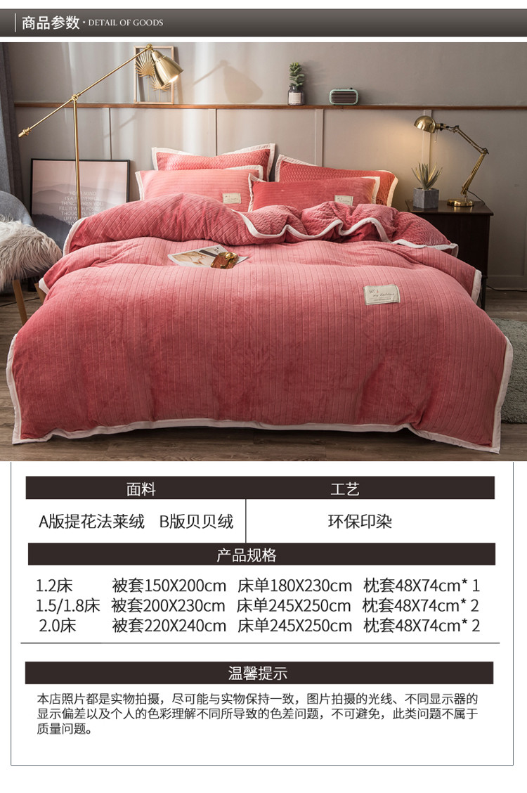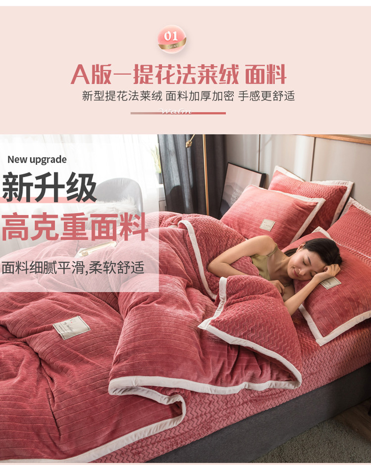 商品名称:欧冠 2019提花法莱绒加贝贝绒加厚四件套 豆沙