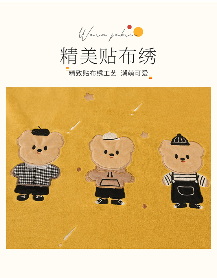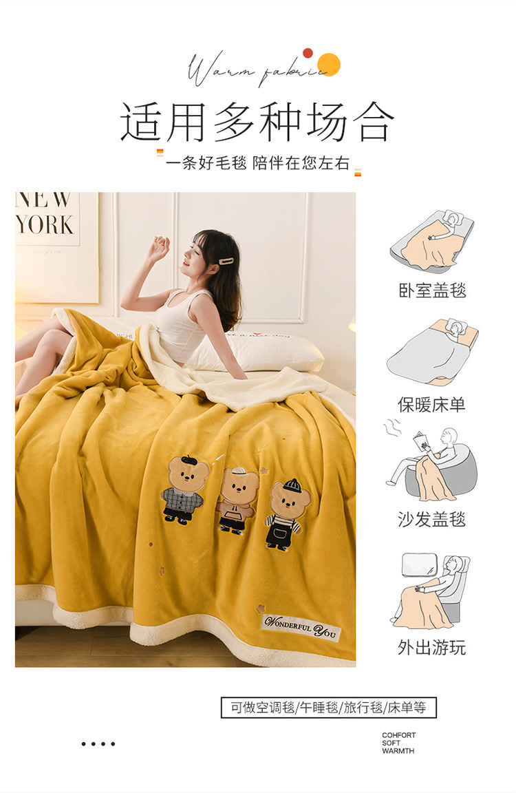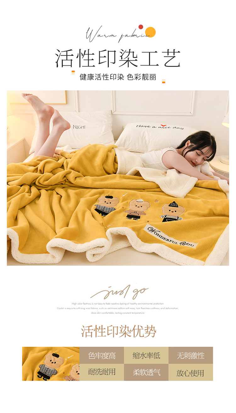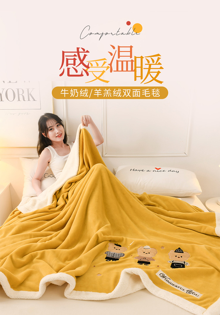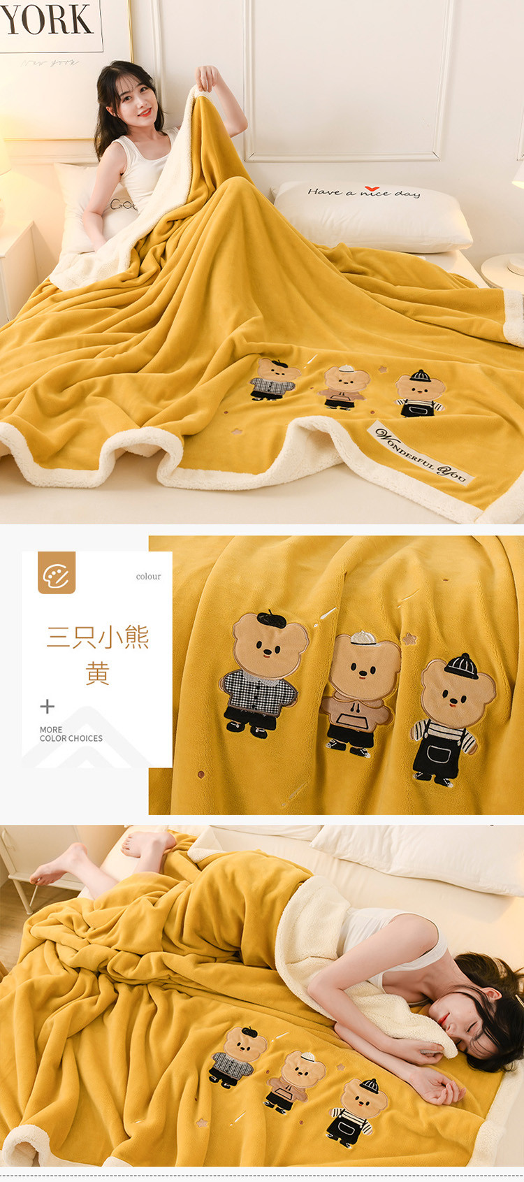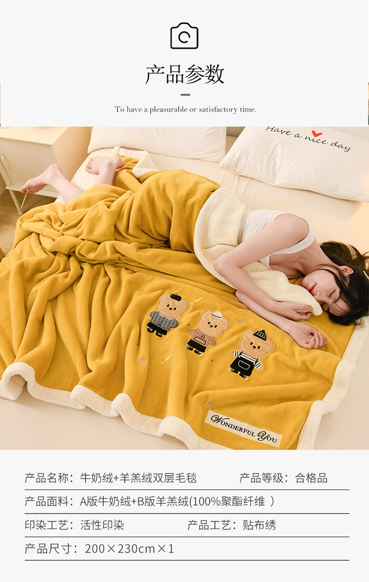 朗莎家纺 2020新款羊羔绒+牛奶绒毛毯 三只小熊-黄