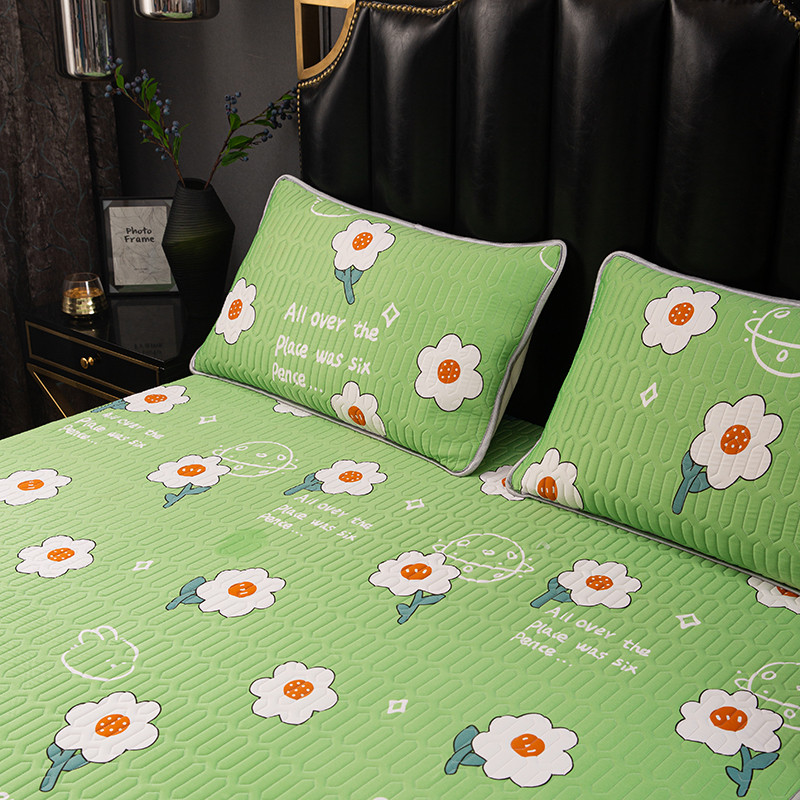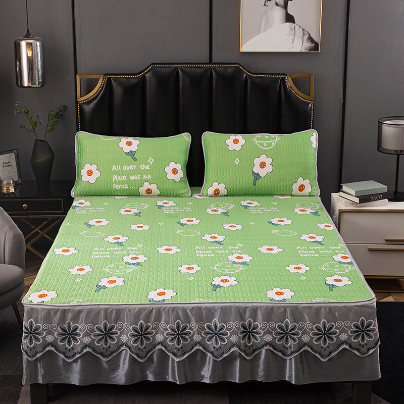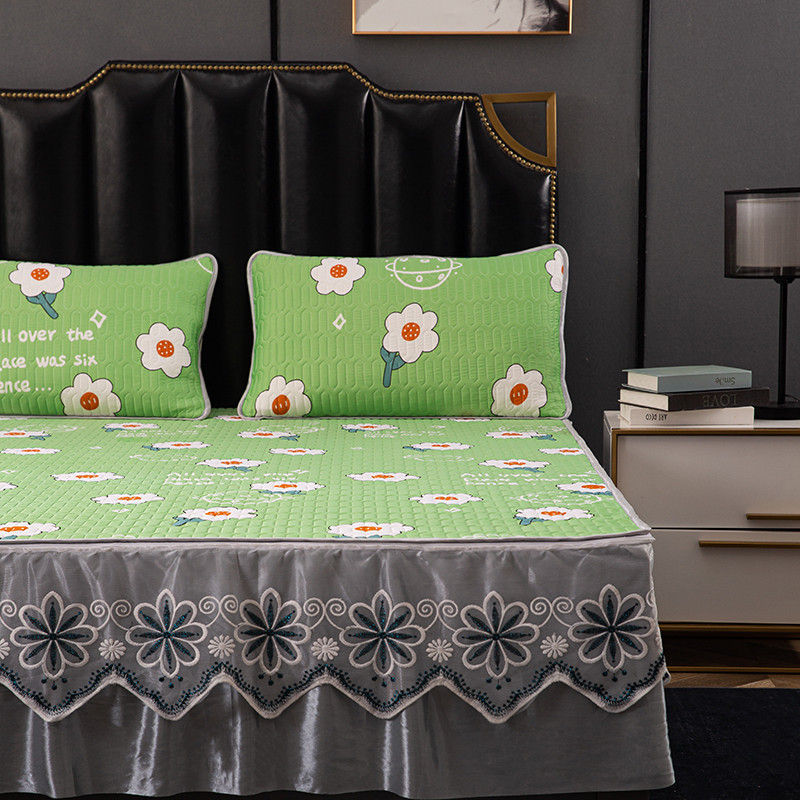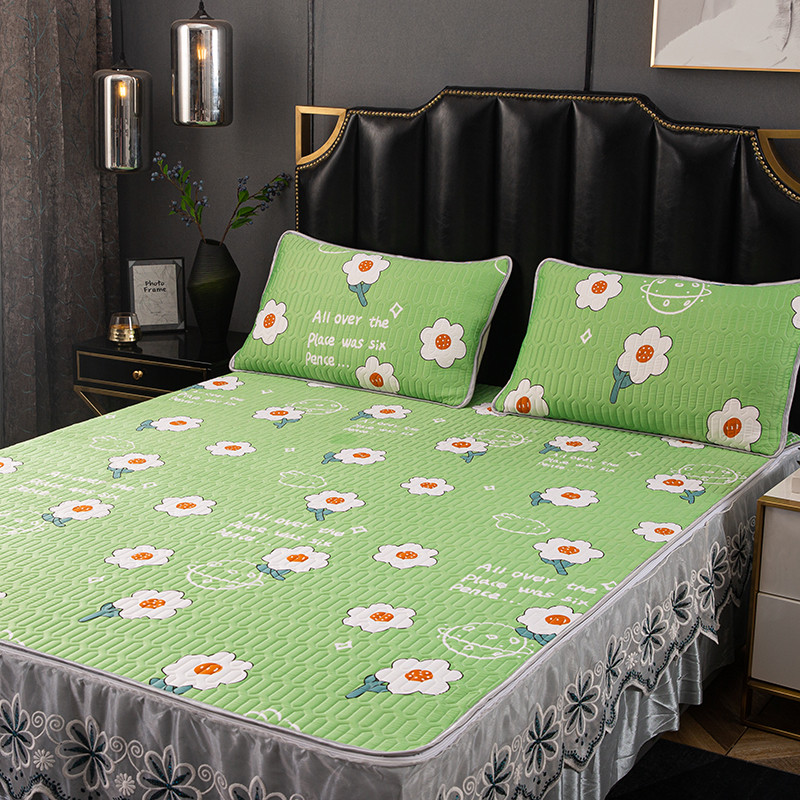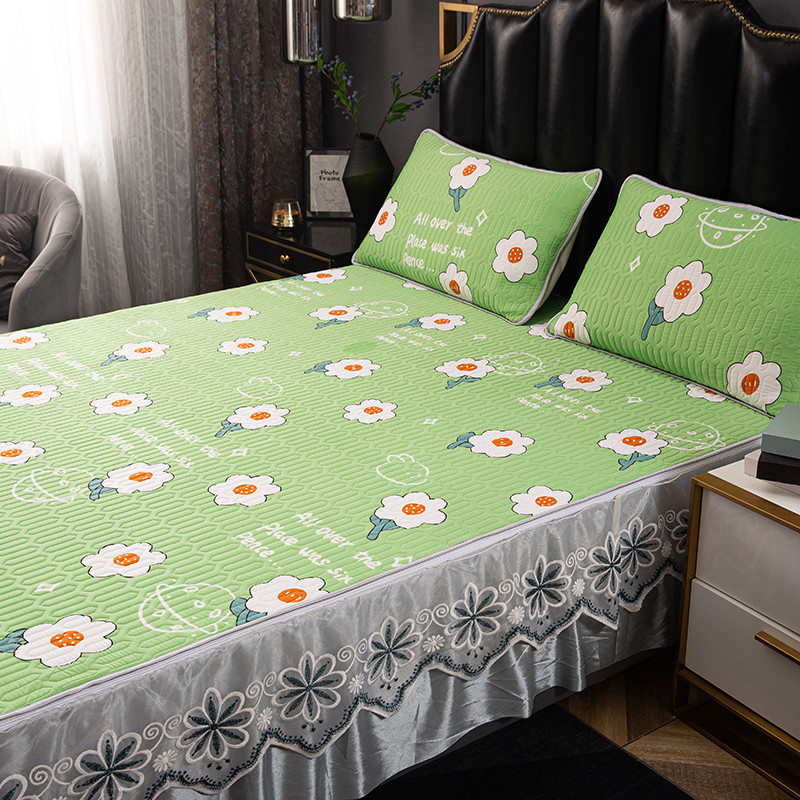 商品名称:纽缦家纺 2021新款凉感丝乳胶凉席可拆卸床裙款三件套 开心花语-绿