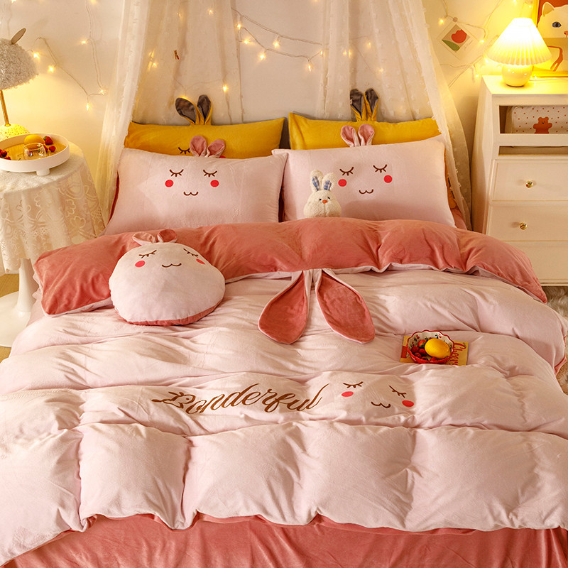 纽缦 2021新款兔耳朵水晶绒床单床笠四件套 兔子 粉豆沙