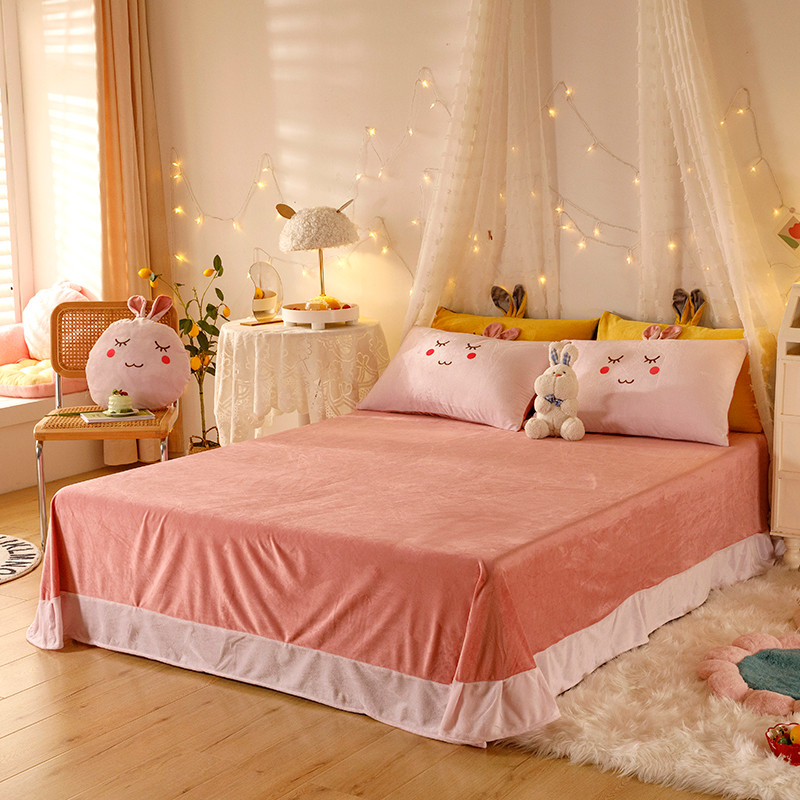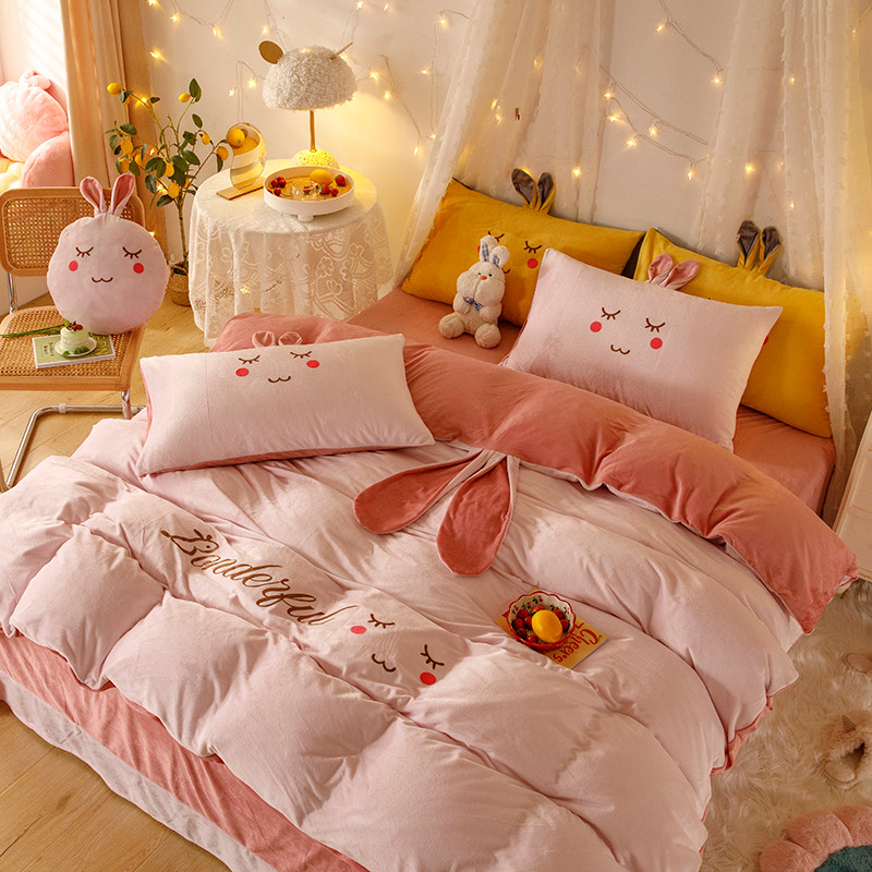 商品名称:纽缦 2021新款兔耳朵水晶绒床单床笠四件套 兔子 粉豆沙