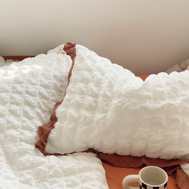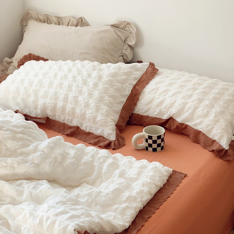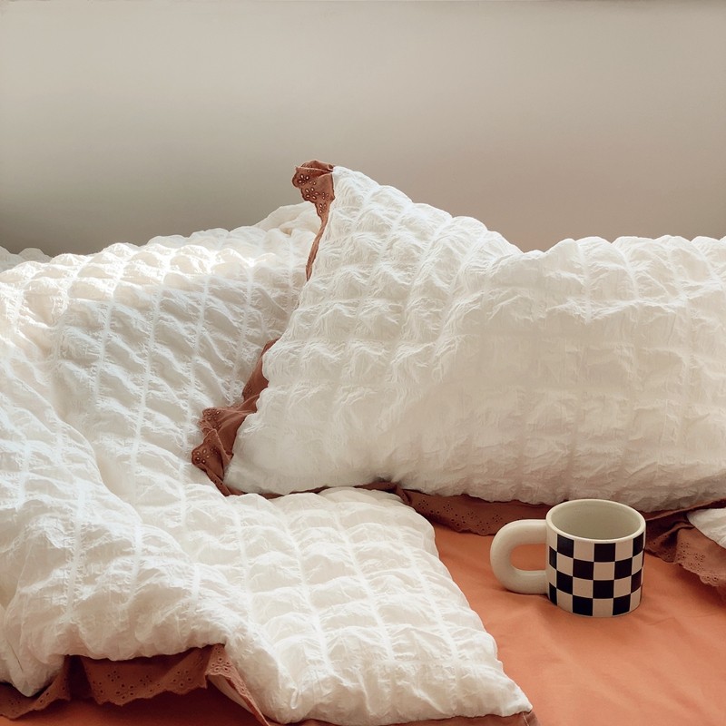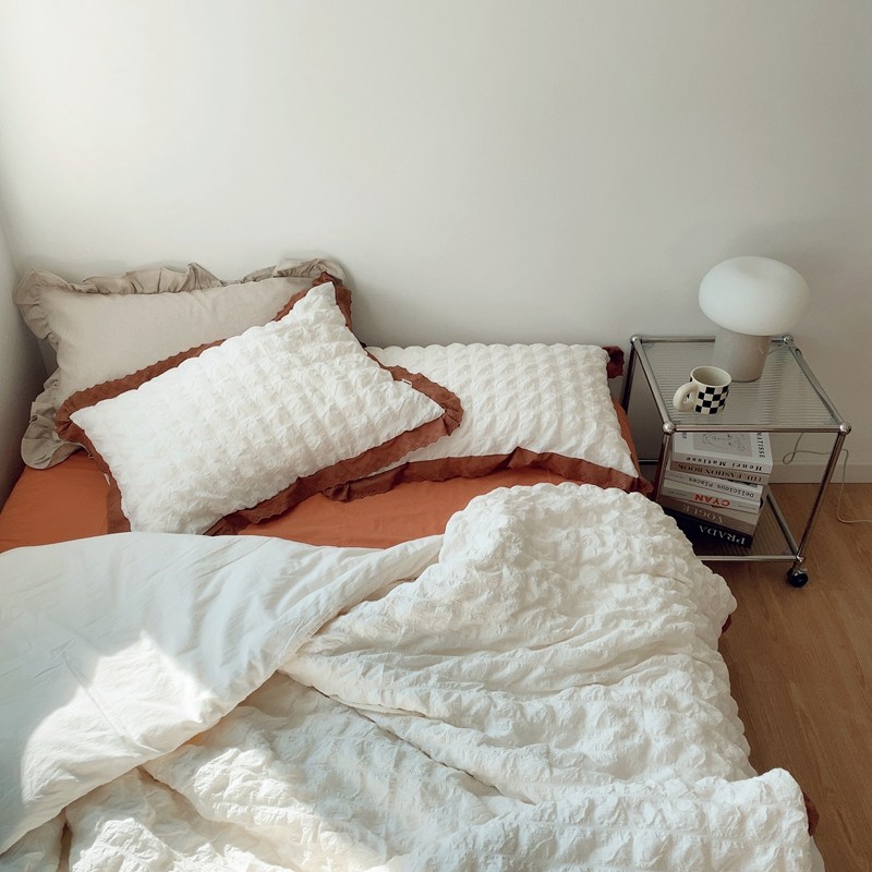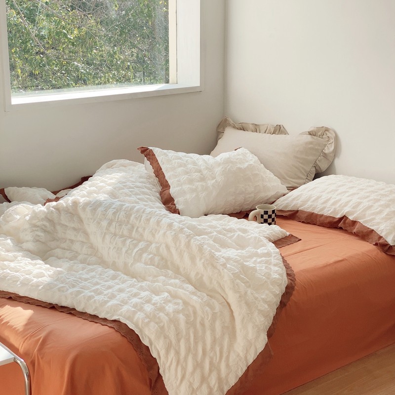 商品名称:桔子家纺 2022春夏新品云朵泡泡纱四件套实拍图 南瓜色