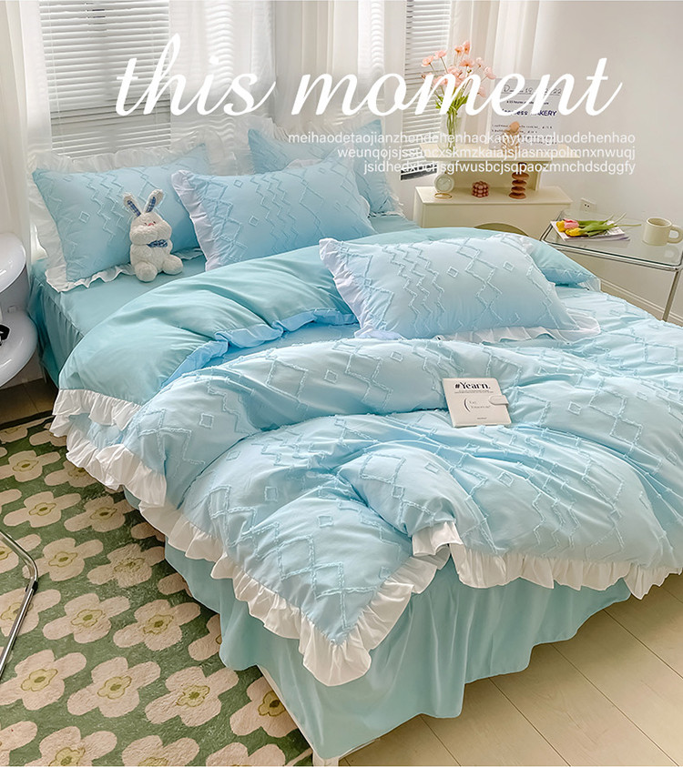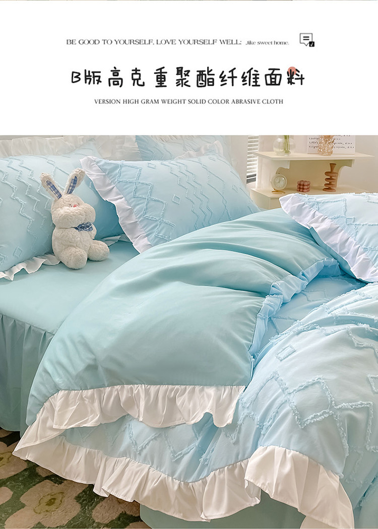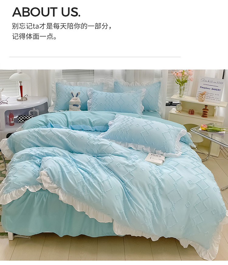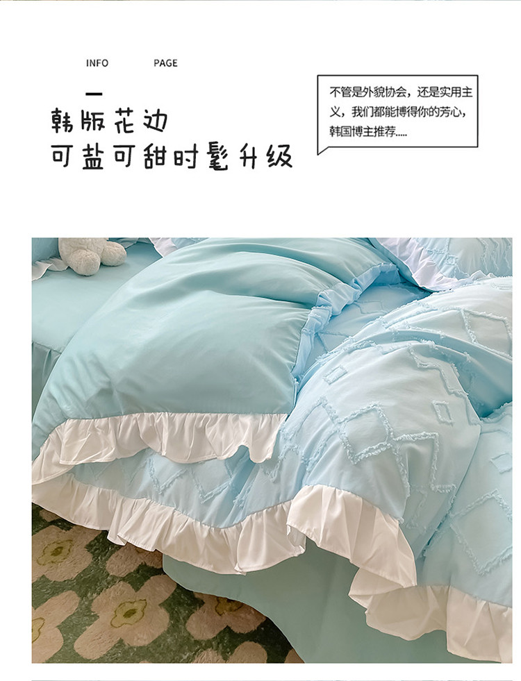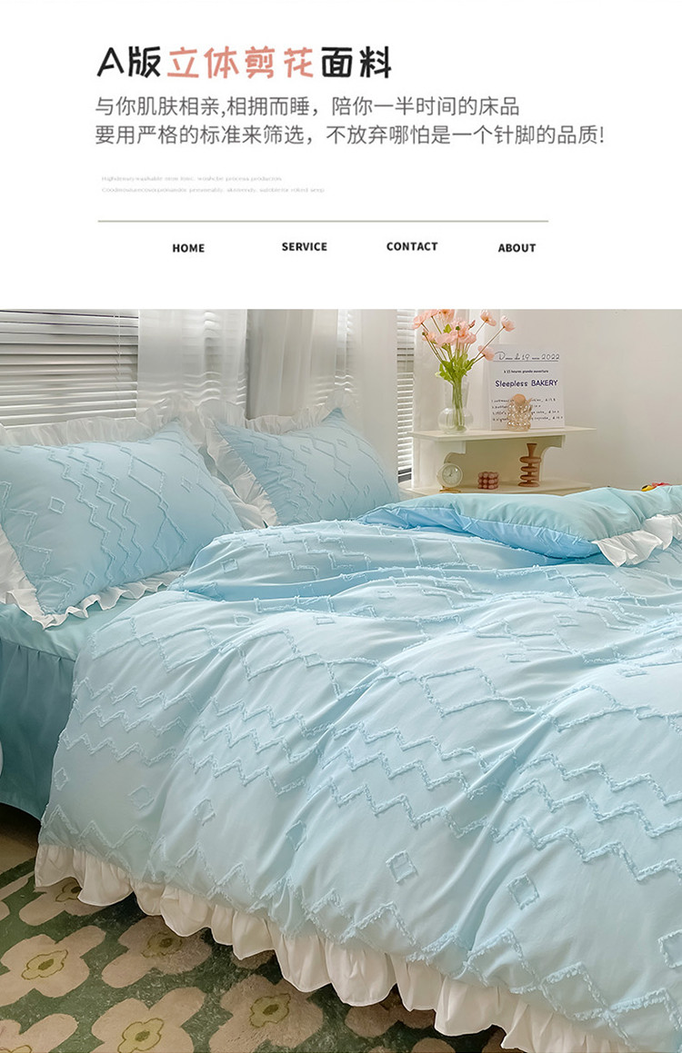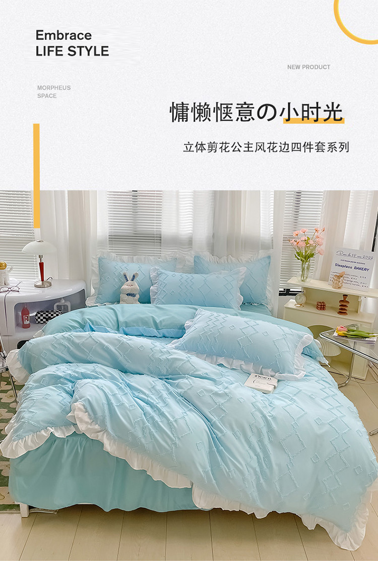 当前位置: 91家纺网 > 商品网购 > 床品套件 > 四件套 > 水洗棉四件套 > 木易家居 2022爆款韩版剪花ins风工艺床单床裙四件套兰色