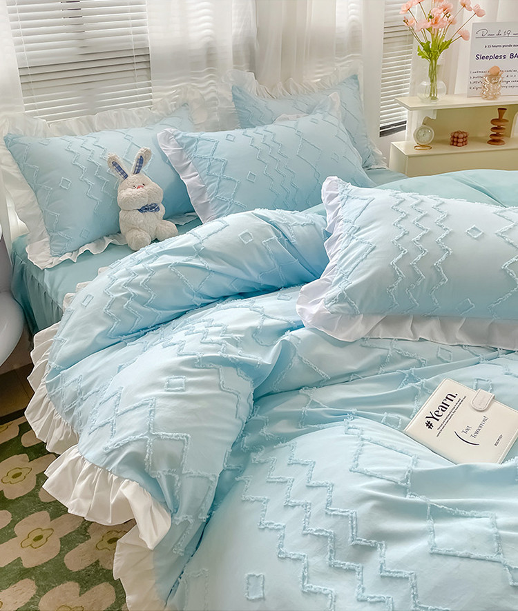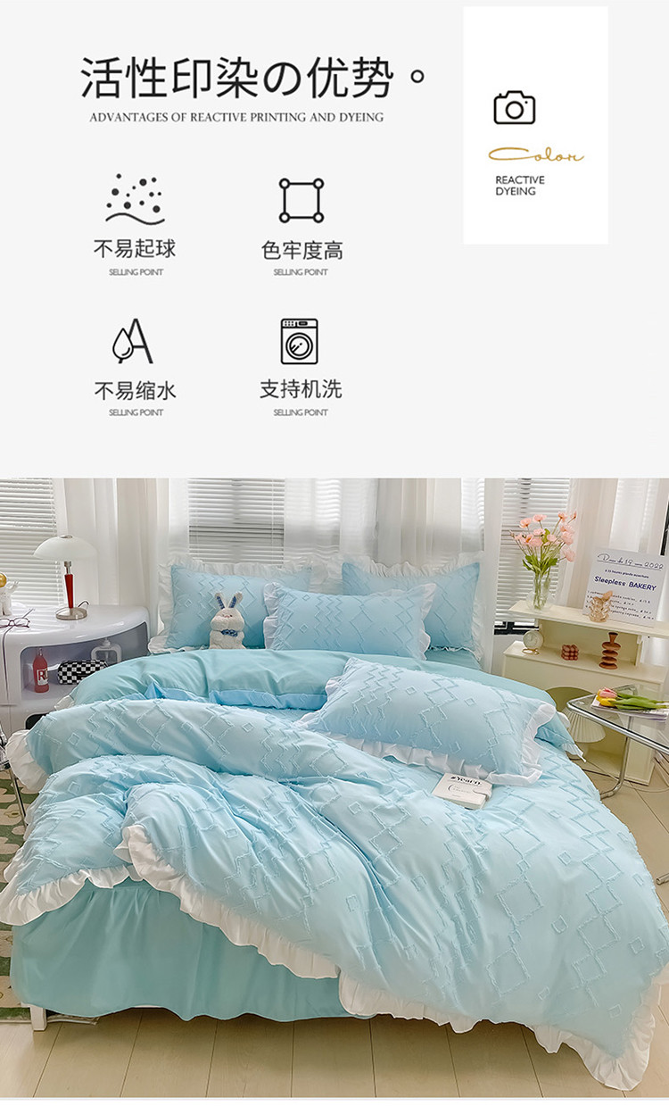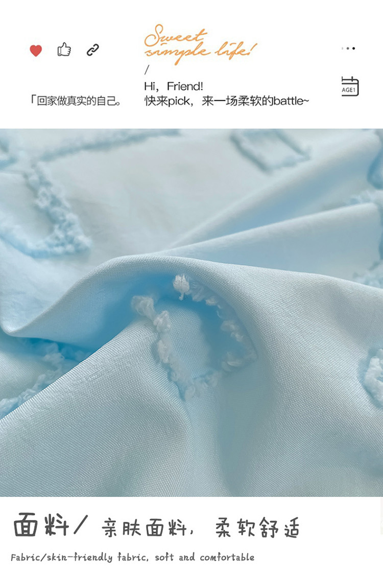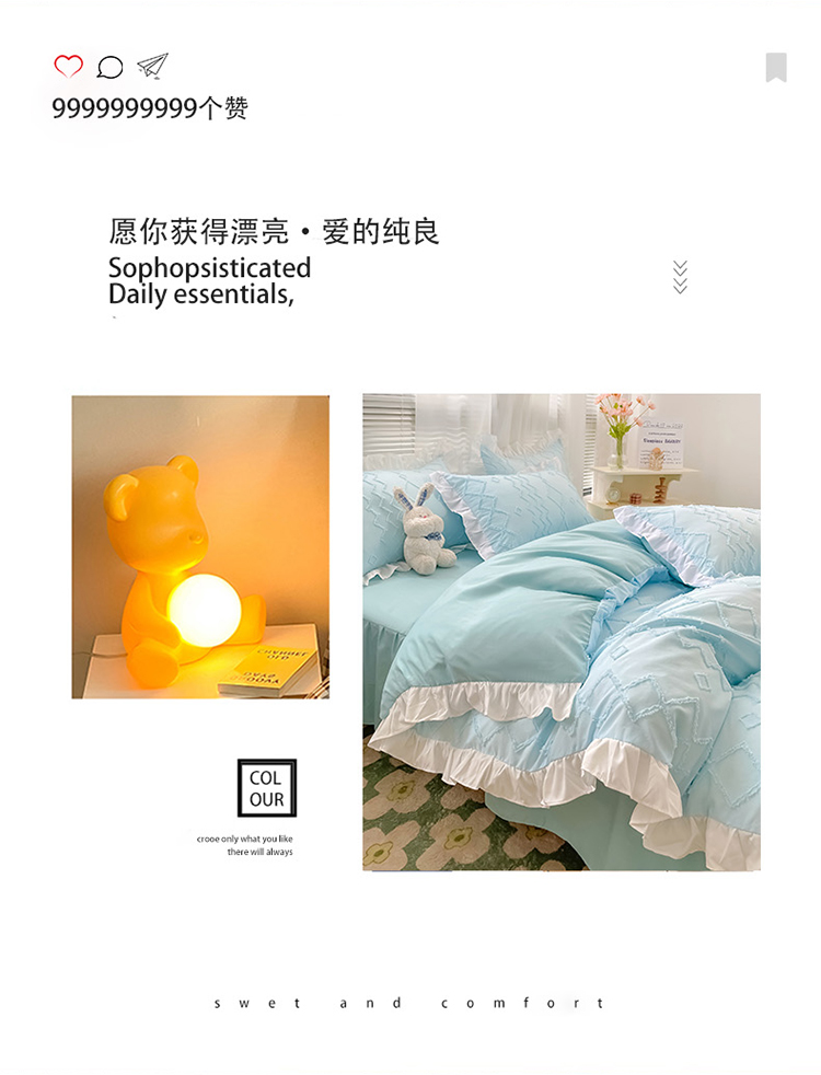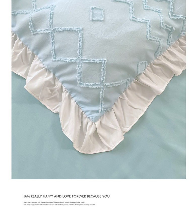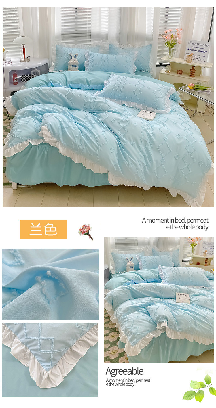 当前位置: 91家纺网 > 商品网购 > 床品套件 > 四件套 > 水洗棉四件套 > 木易家居 2022爆款韩版剪花ins风工艺床单床裙四件套兰色