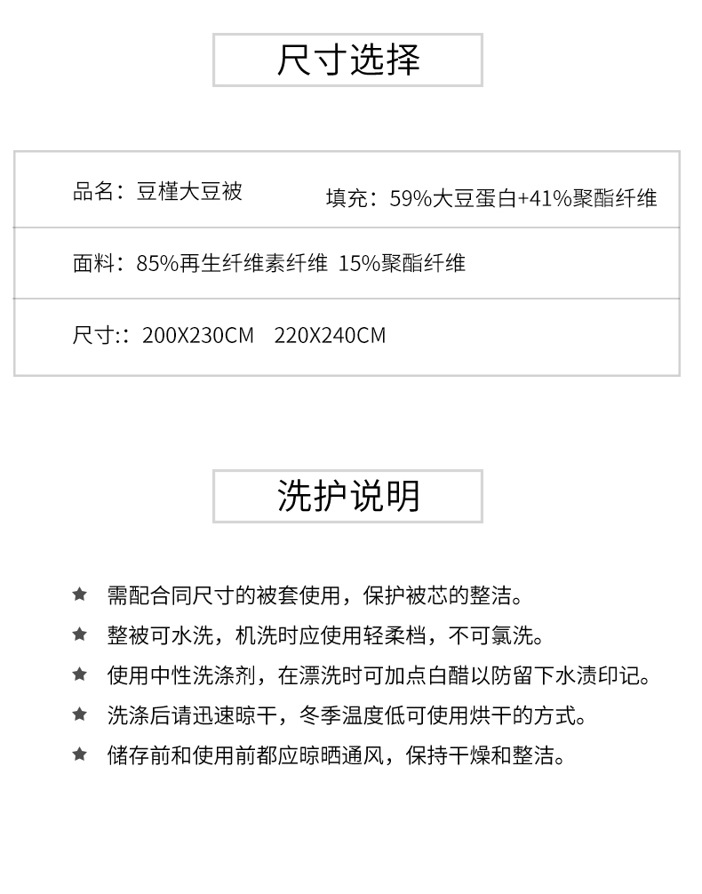 • 填充纤维种类: 大豆蛋白改性聚酯纤维