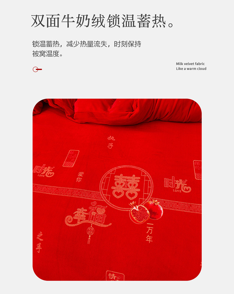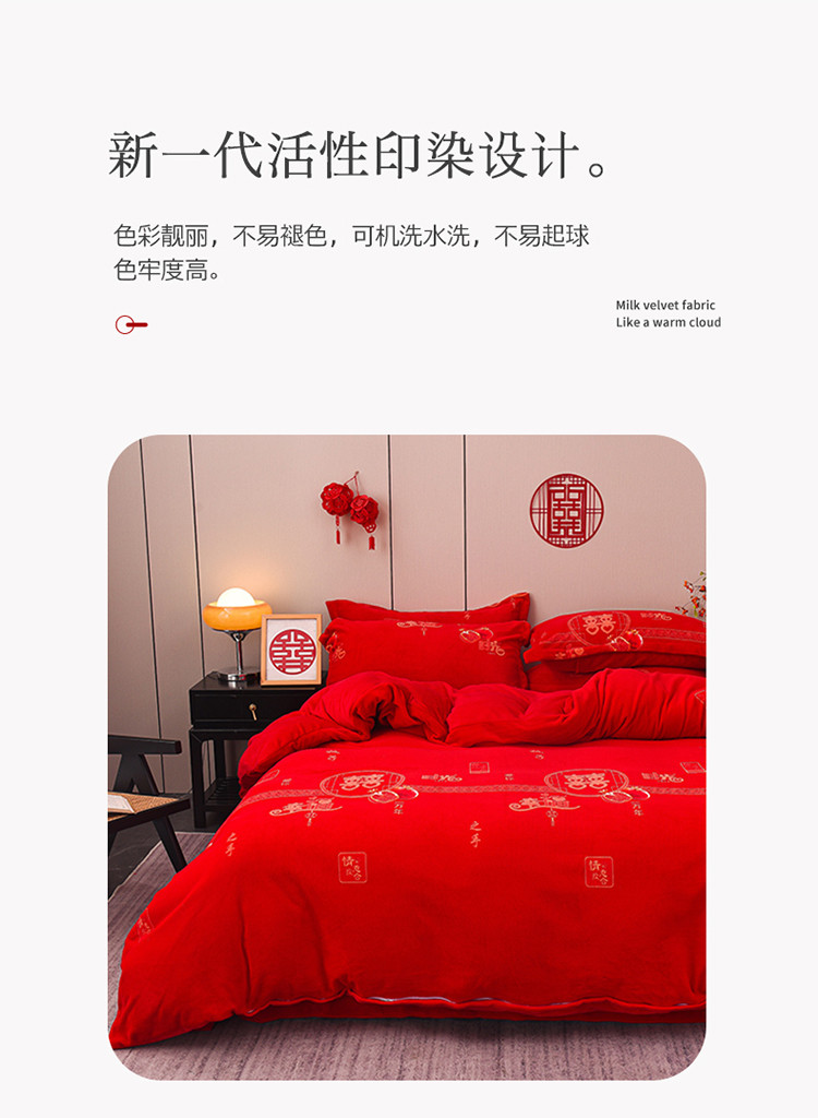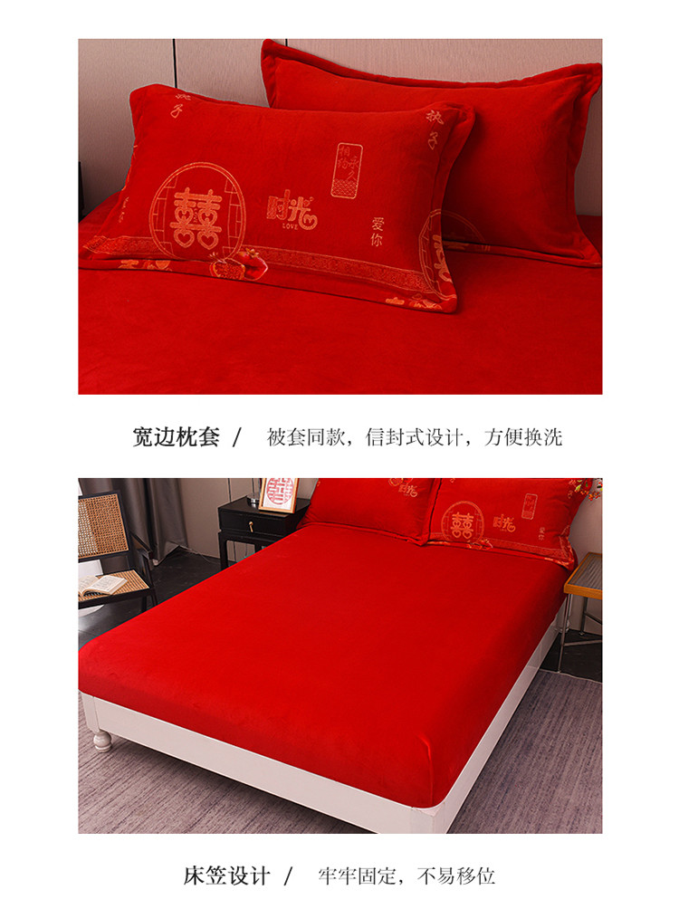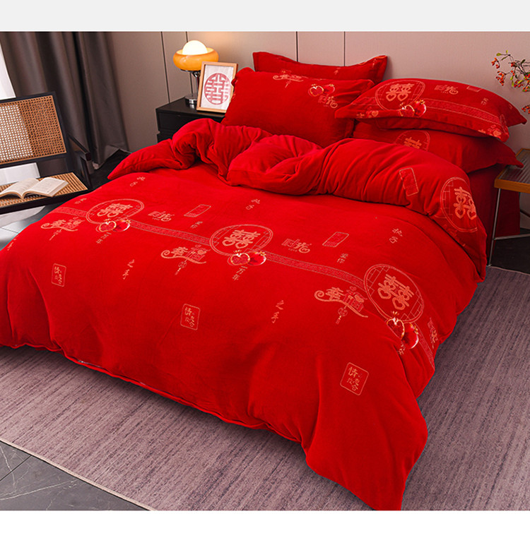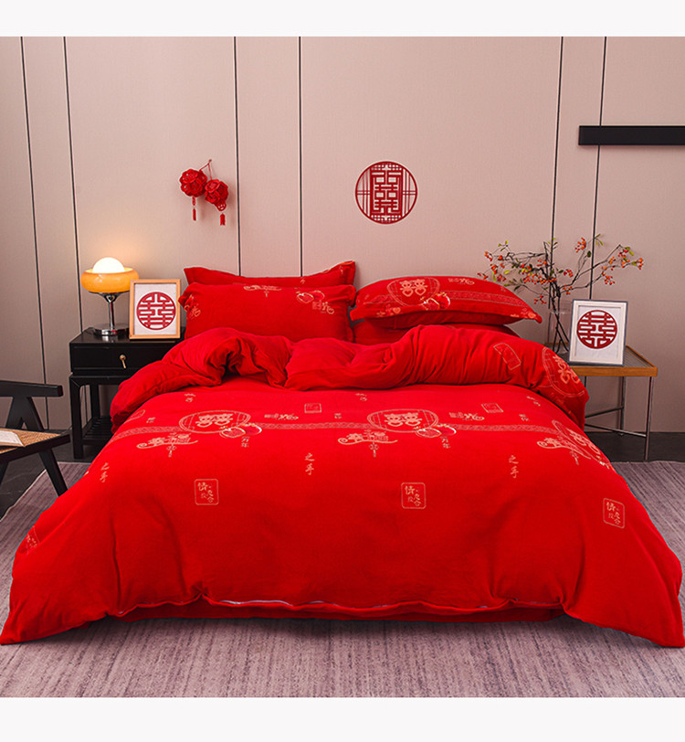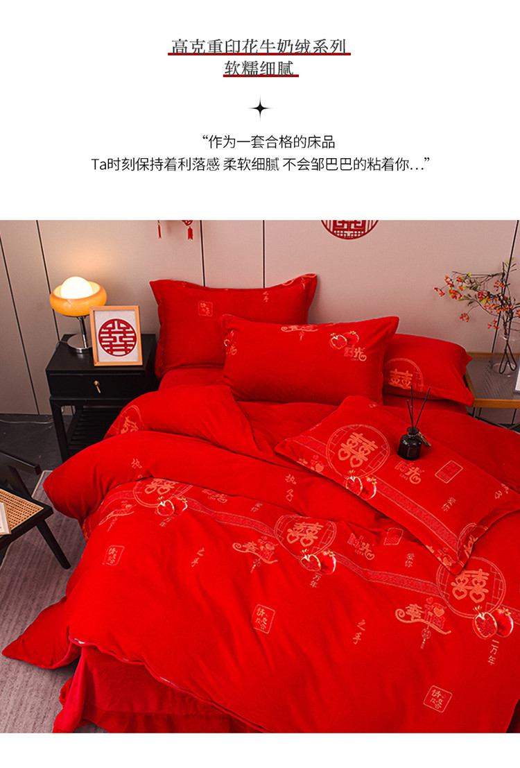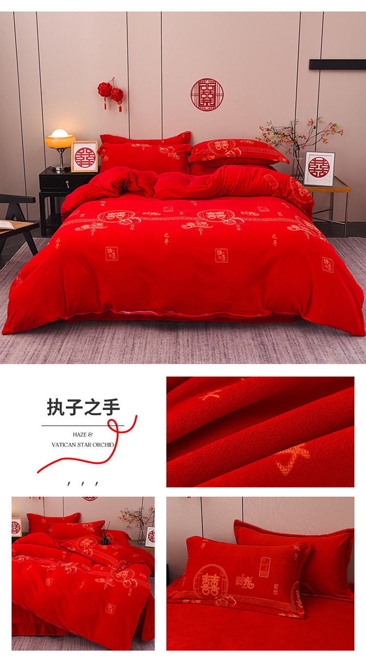 金麦家纺 新款婚庆牛奶绒印花婚庆被大红喜被四件套 执子之手