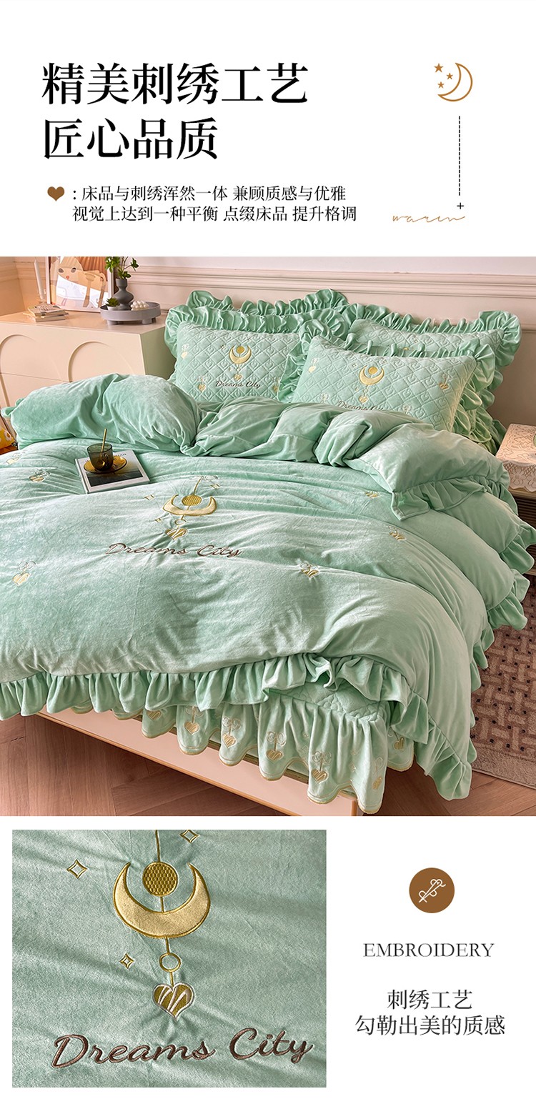 (总)宜凡家纺 2025新款牛奶绒雕花拼接刺绣床裙四件套,晨雾蔷薇,蝶恋花语,花野漫屿,蕾丝蝶音,洛可可影,雾蓝漫织,香槟漫月