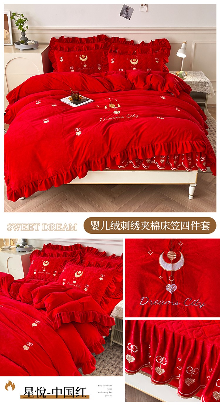 (总)宜凡家纺 2025新款婴儿绒压花全夹棉床裙四件套,韵雅-中国红,韵雅-黑天鹅