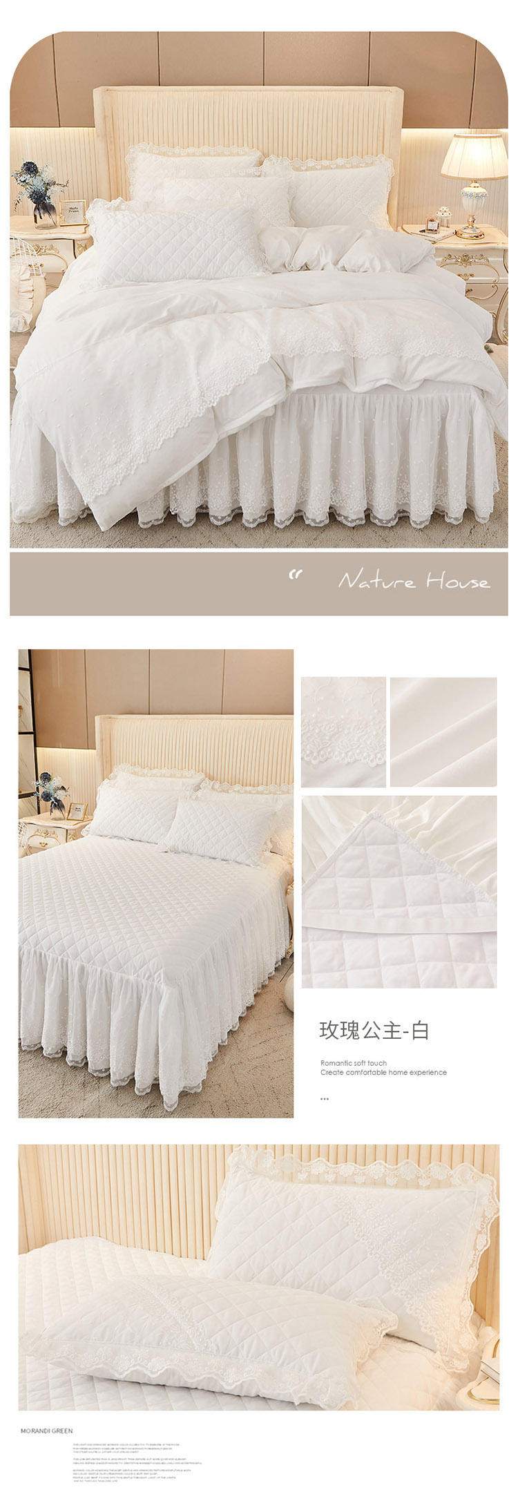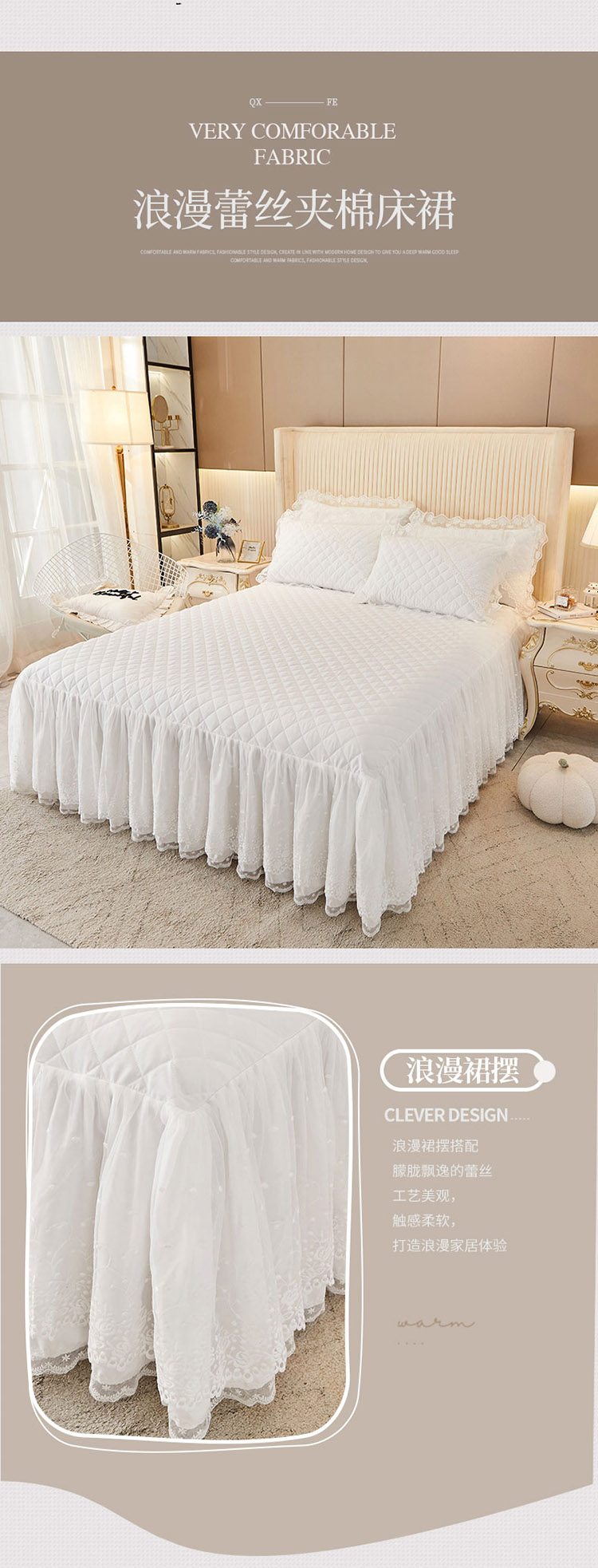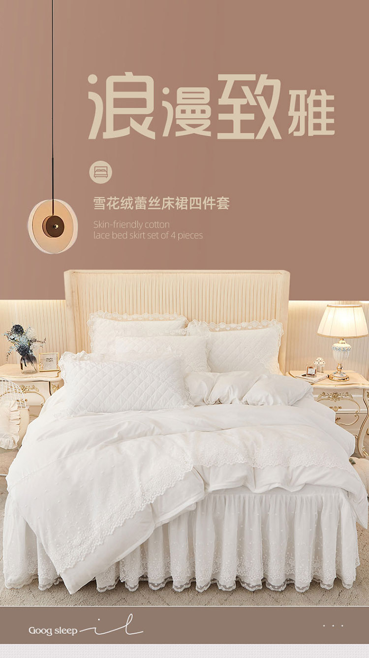 当前位置: 91家纺网 > 商品网购 > 床品套件 > 四件套 > 磨绒四件套 > 恋尚 2023新款纯色雪花绒夹棉蕾丝床裙四件套(四季款) 玫瑰公主-白