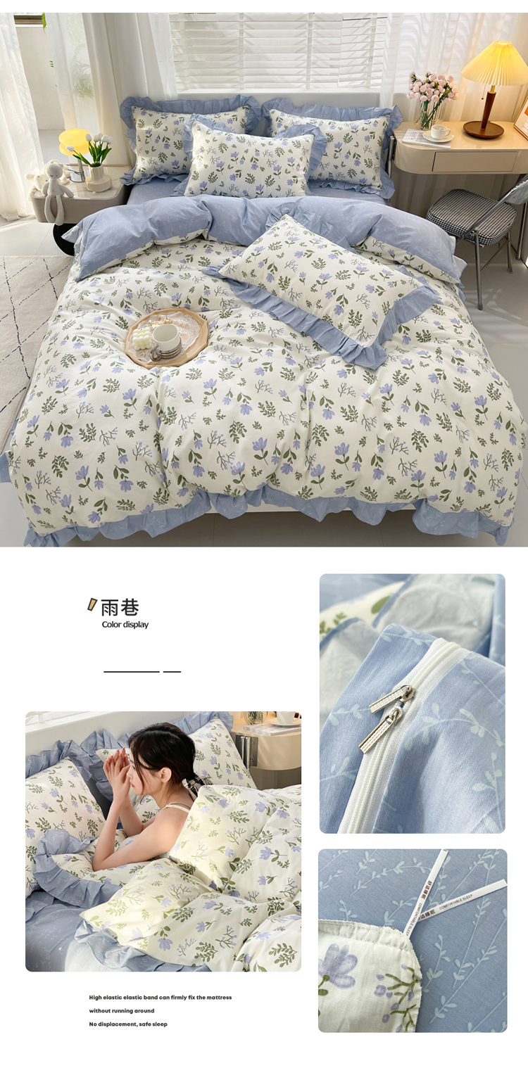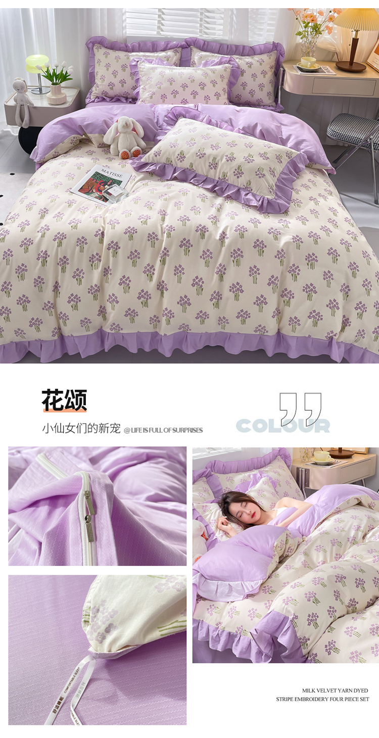 (总)简爱 2025新款水洗棉雪纺双层花边四件套,高级灰,告白玉,抹茶绿,奶油黄,夏日蓝,胭脂粉,优雅紫