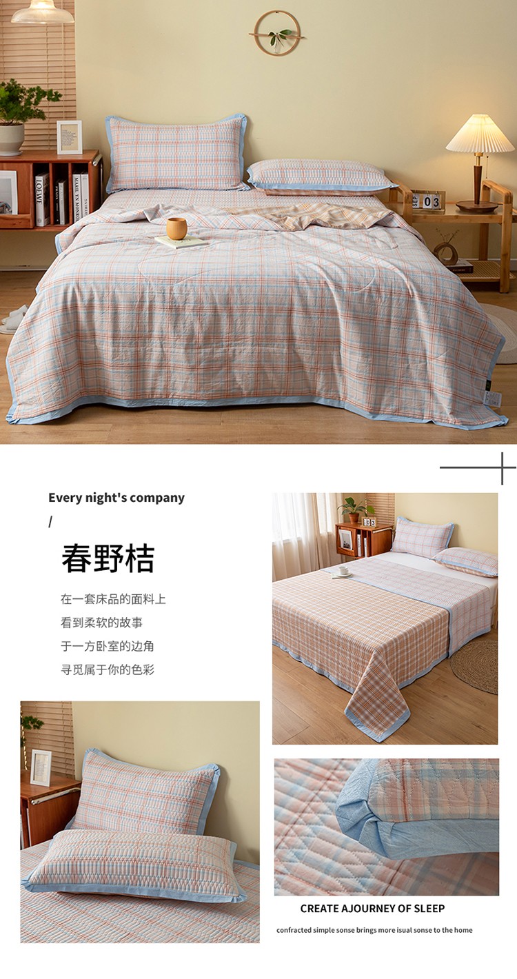 商品名称:上喜 热卖色织全棉水洗棉格纹款床盖三件套多功能被子四件套 春野桔