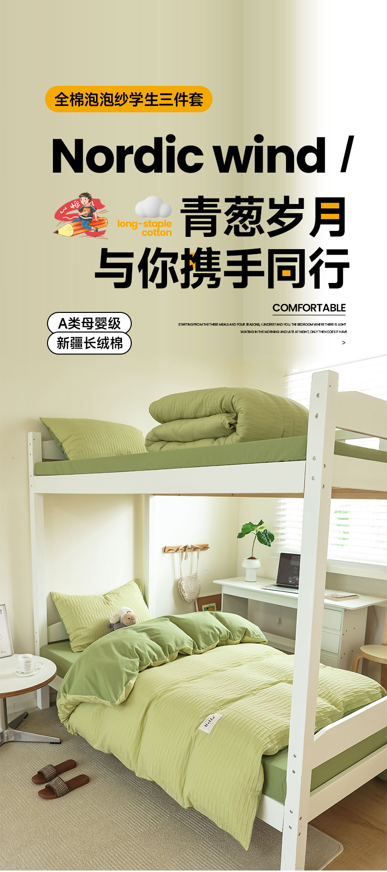 (总)寐眠 2023新款全棉泡泡纱学生三件套