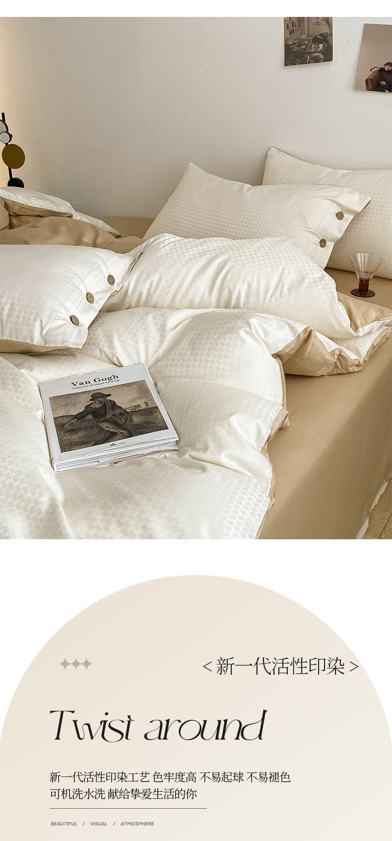 古吉梦 2023新款A类抗菌防螨纽扣提花四件套磨毛秋冬款 奶昔白+香槟金