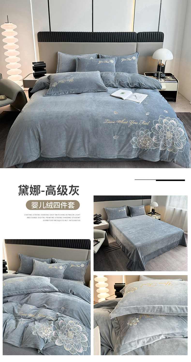 逸林家纺《原希尔顿逸林》 2023新款宝宝绒婴儿绒四件套刺绣花小香风黛娜-高级灰