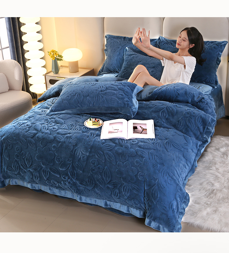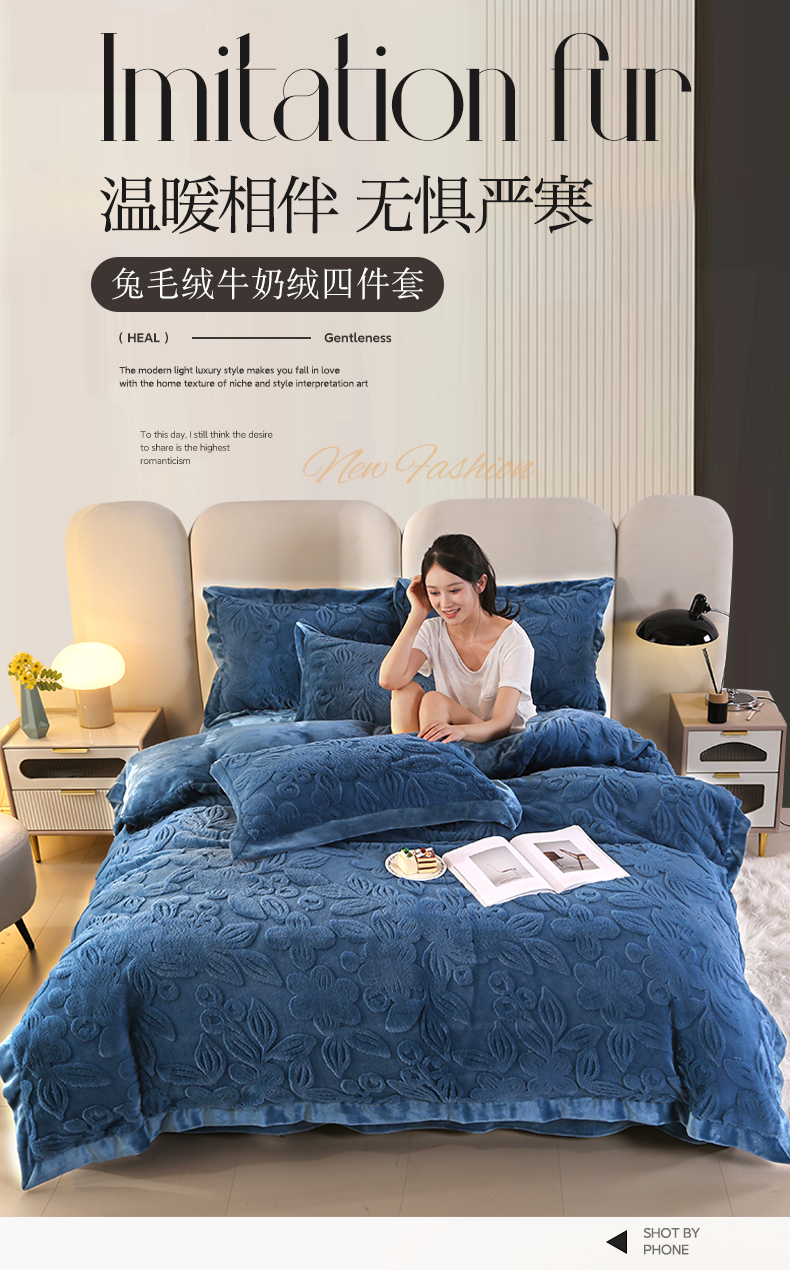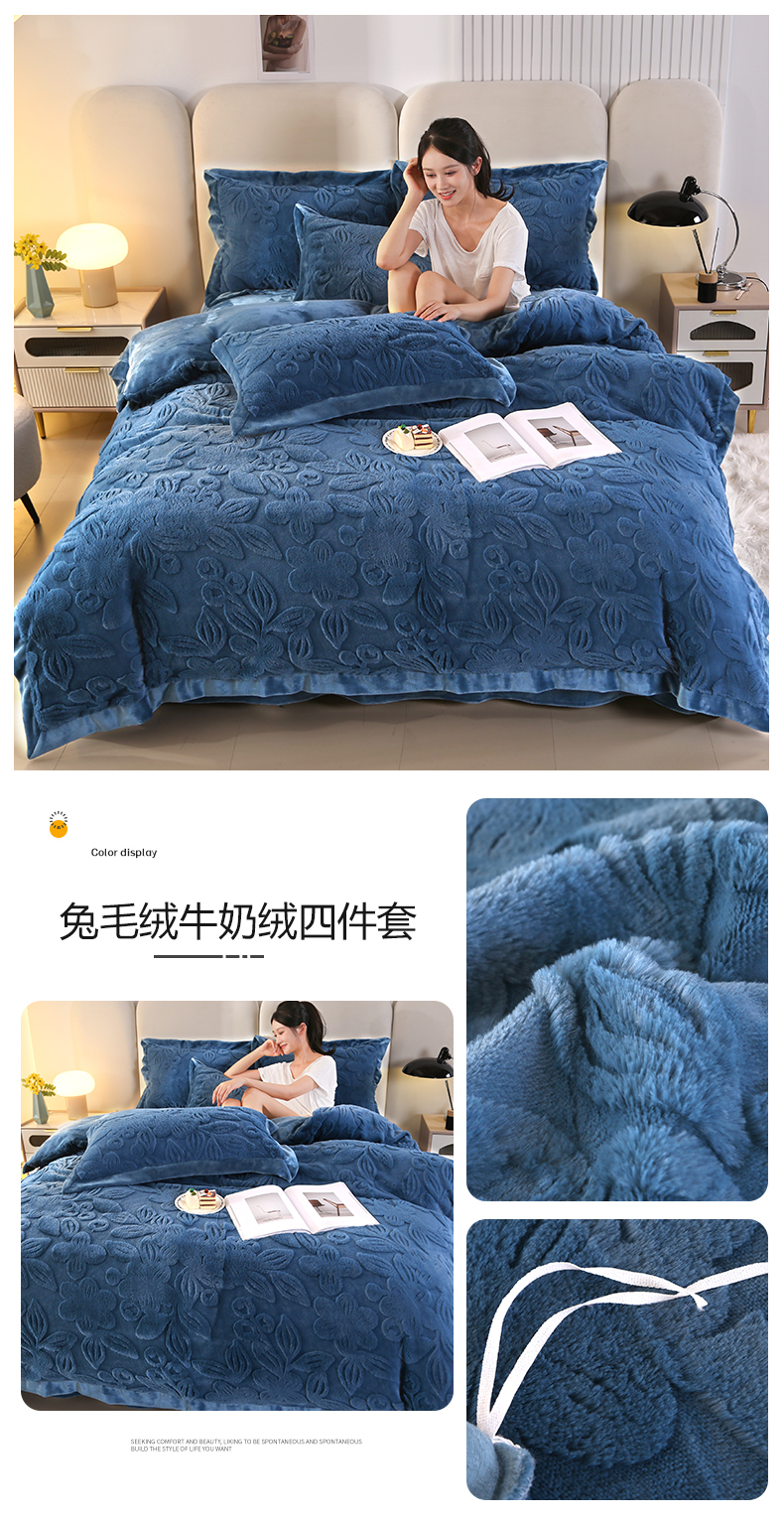 代芙 2024新款高克重电商直播爆款11斤提花兔毛绒牛奶绒四件套 清雅-蓝