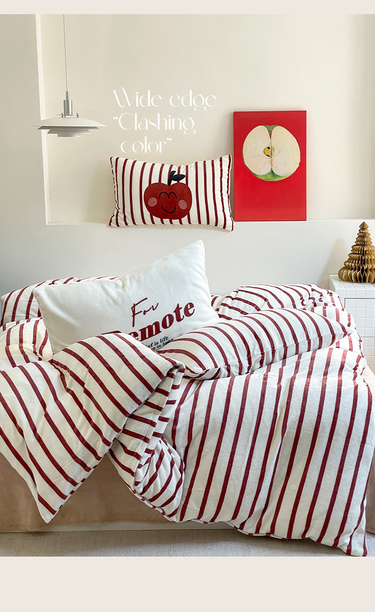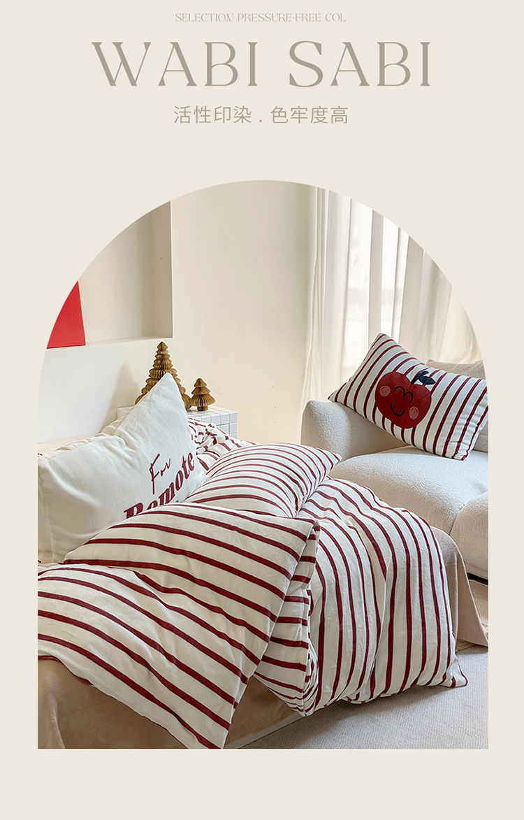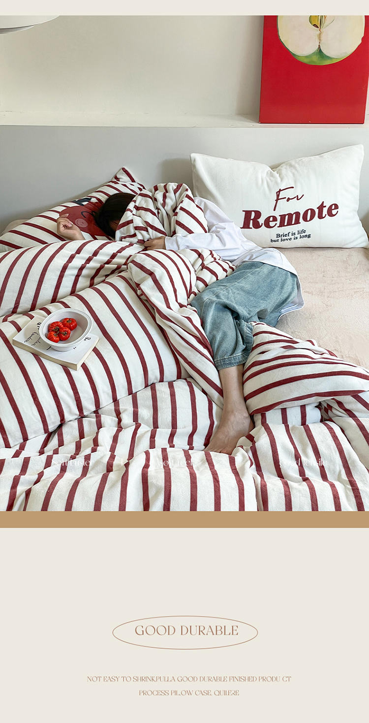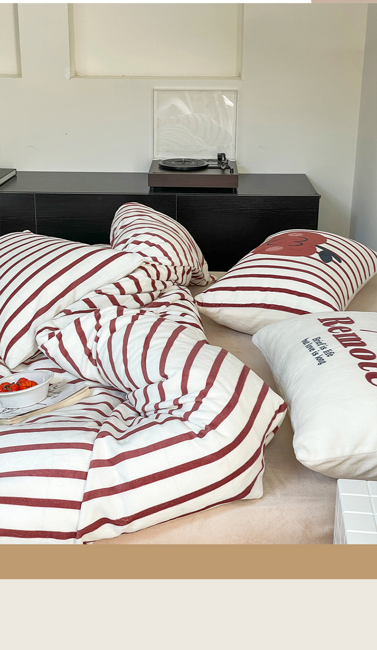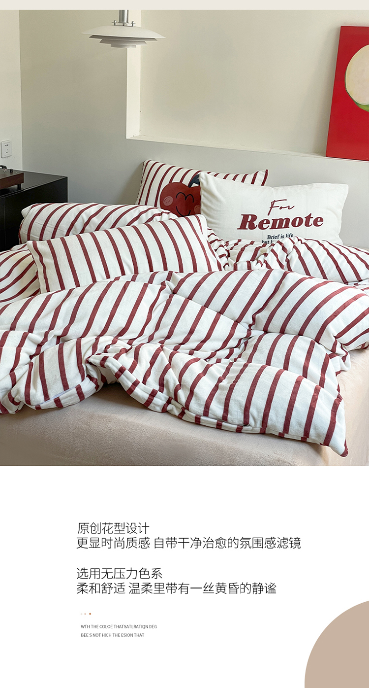 圆岛家纺 2023新款原创牛奶绒印花保暖四件套 枣红细条