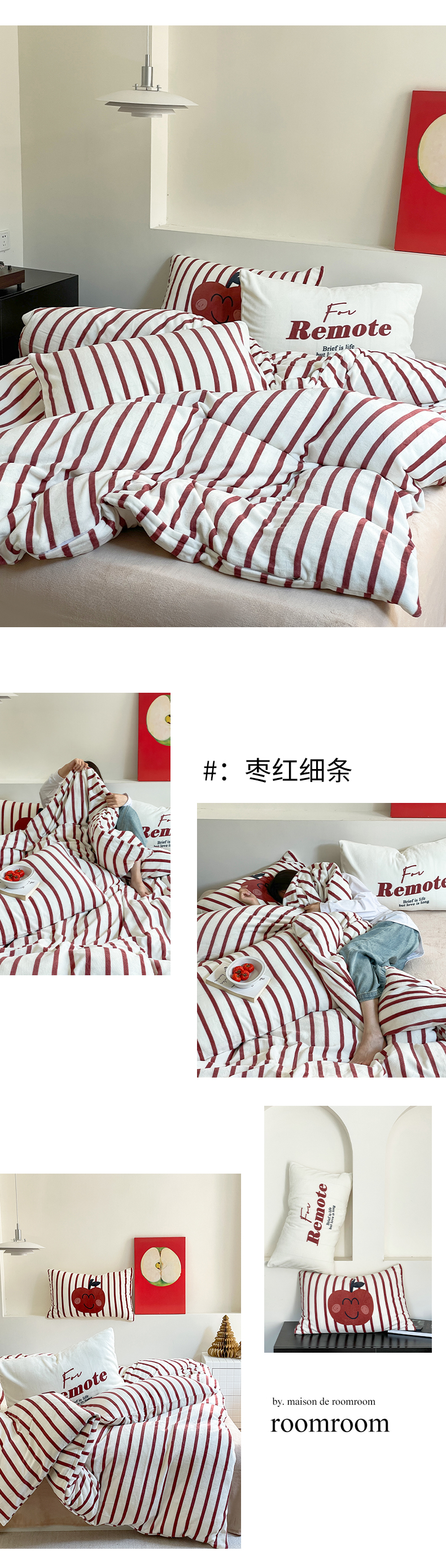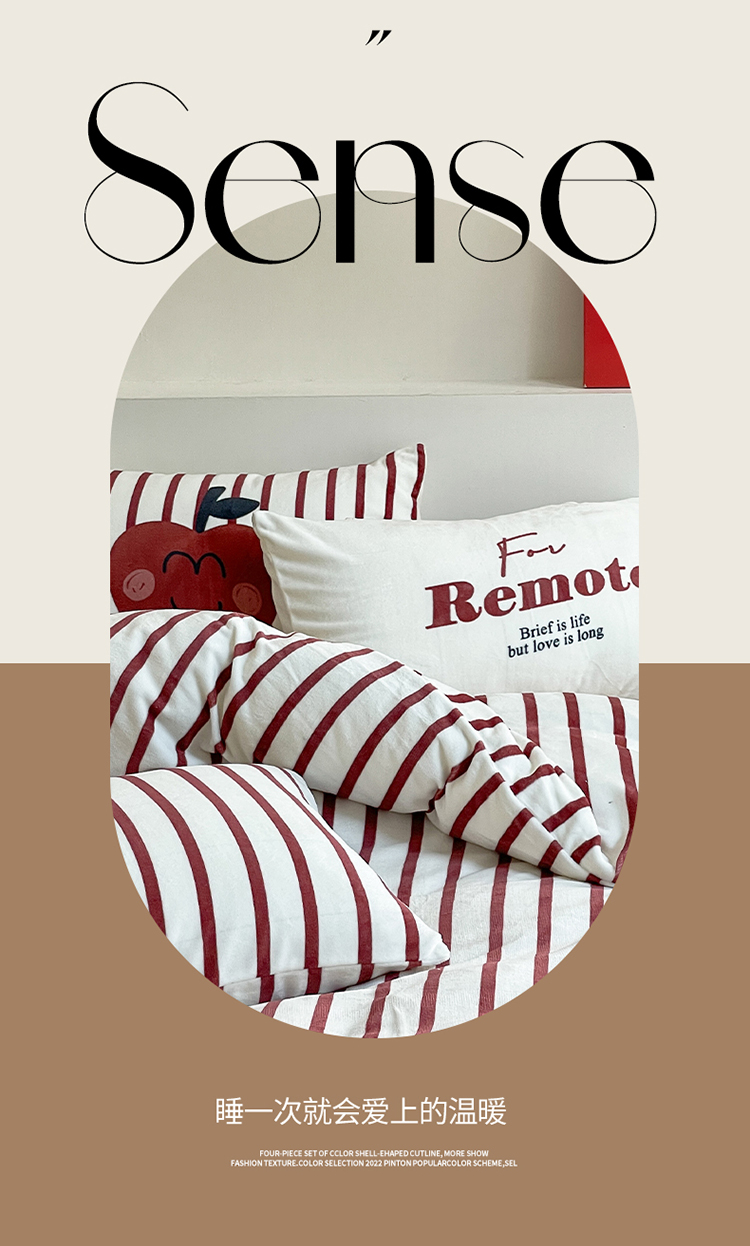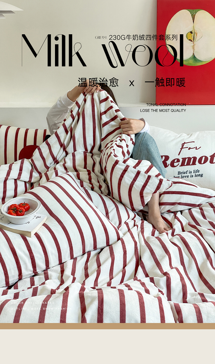 商品名称:圆岛家纺 2023新款原创牛奶绒印花保暖四件套 枣红细条