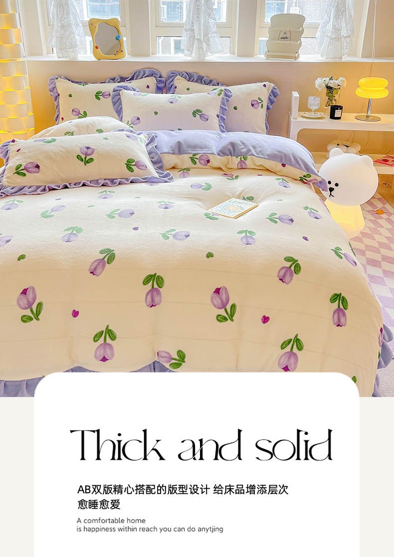 米莱 2023新款印花韩版牛奶绒四件套 郁金香紫