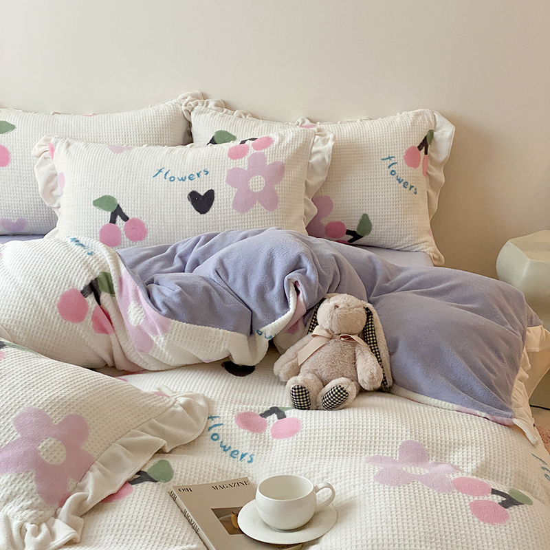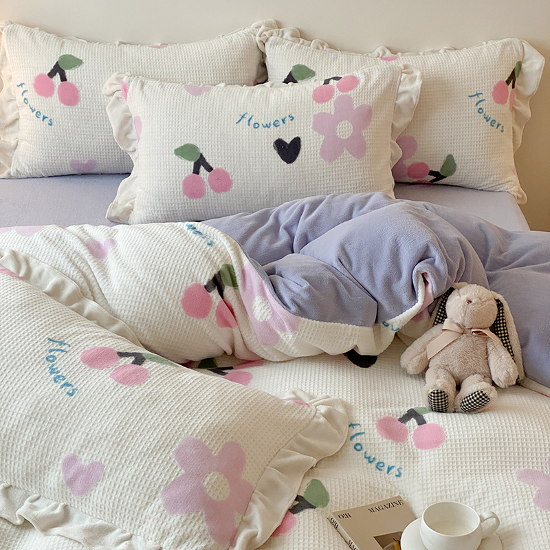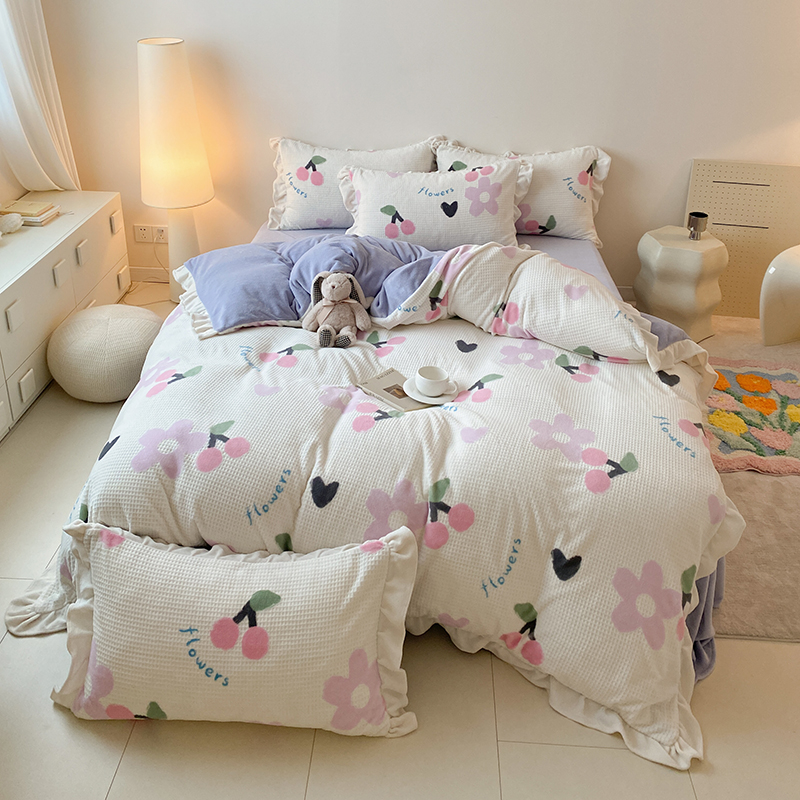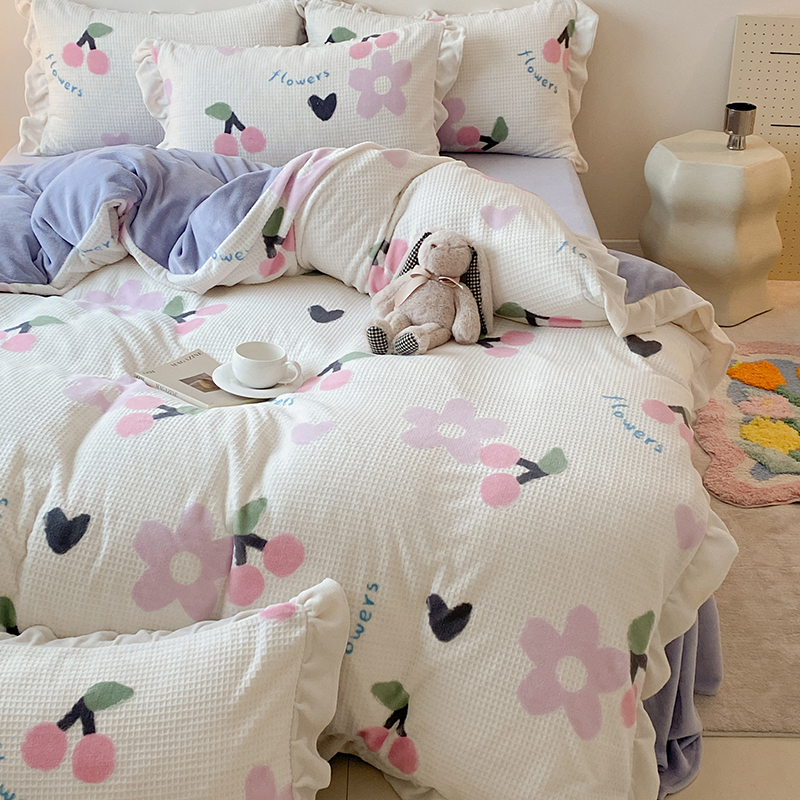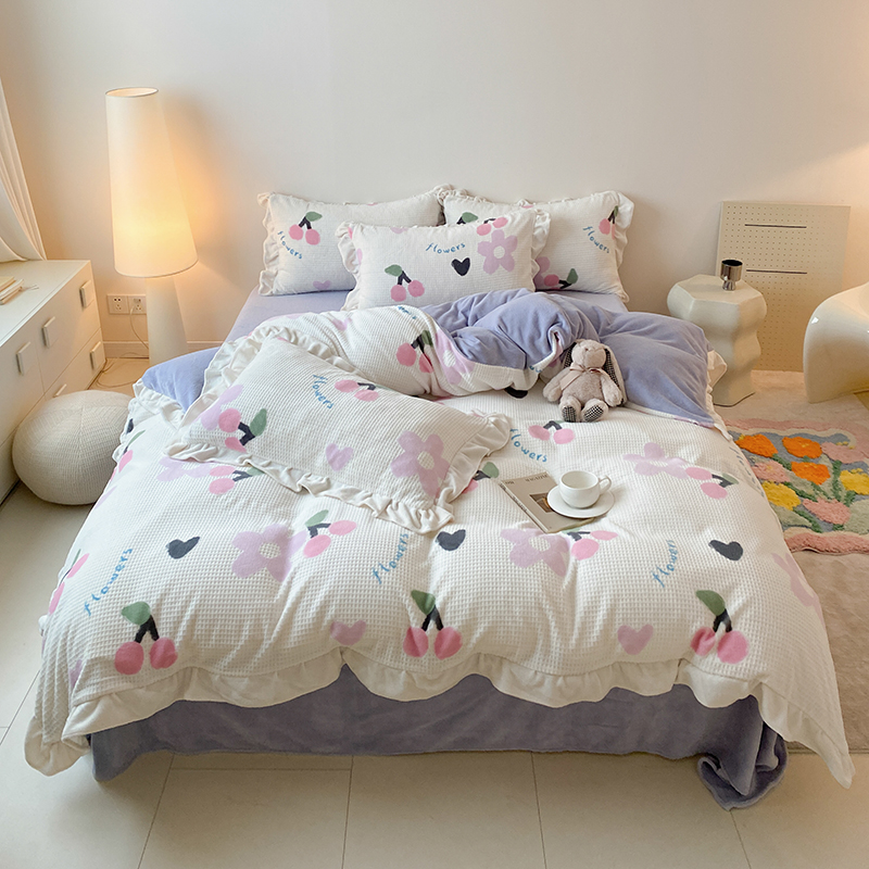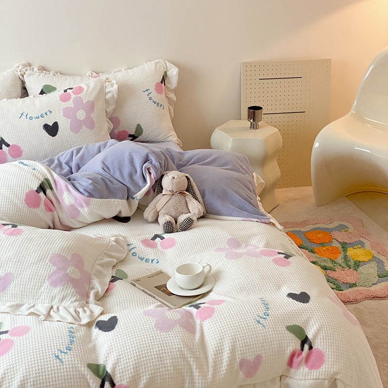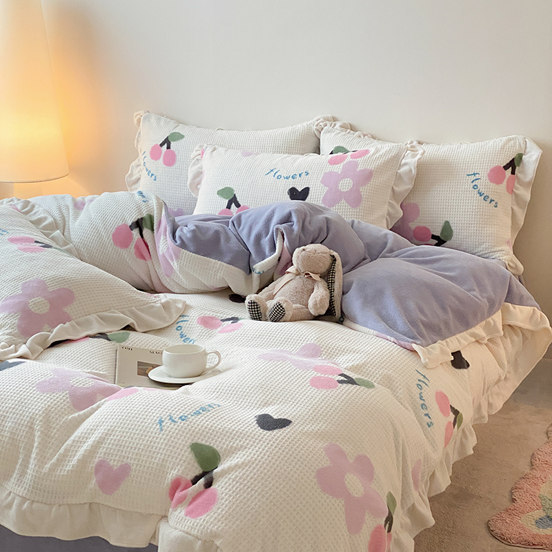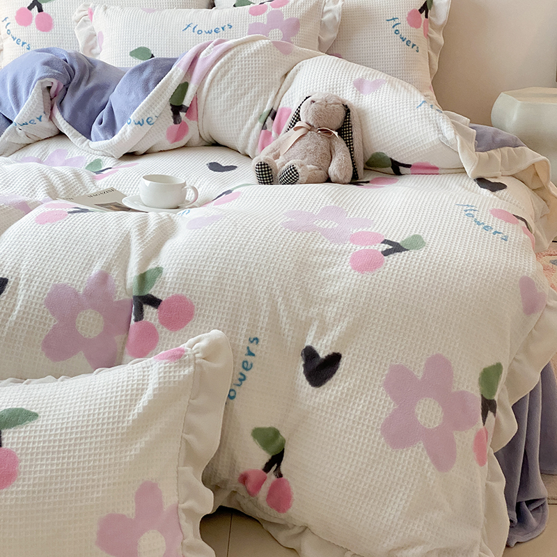 潘朵拉家纺 2023新款雕花韩式华夫格花边牛奶绒四件套 樱樱花语