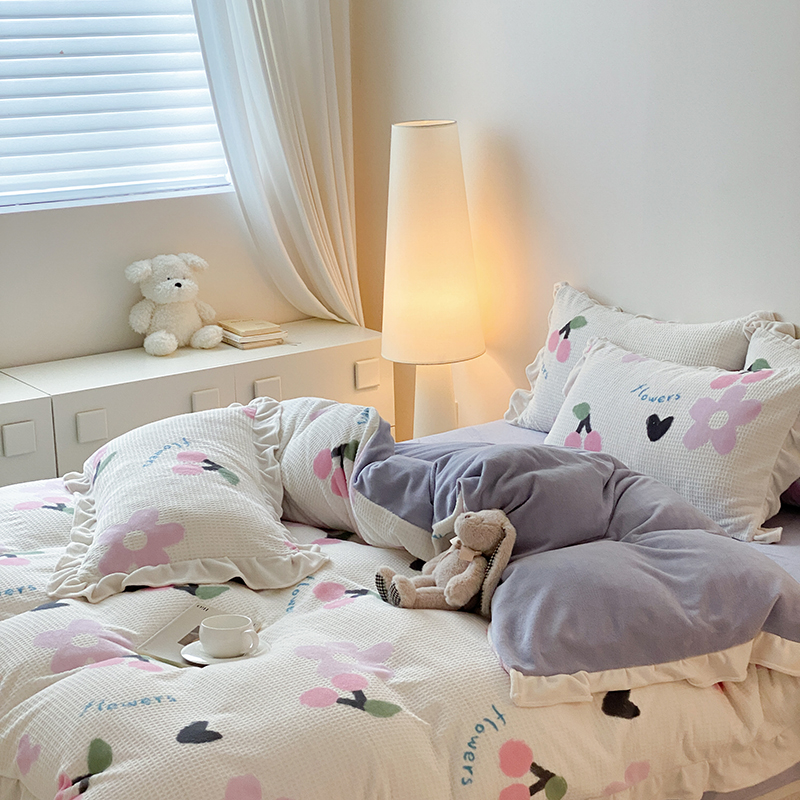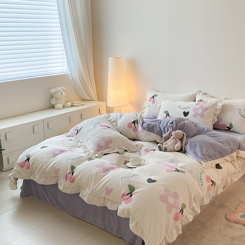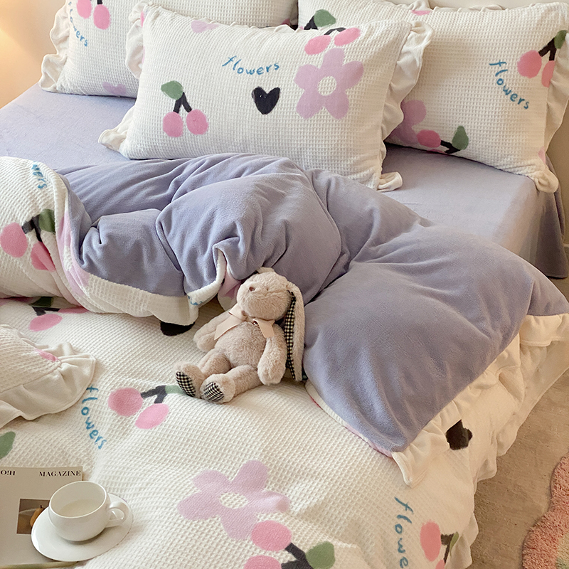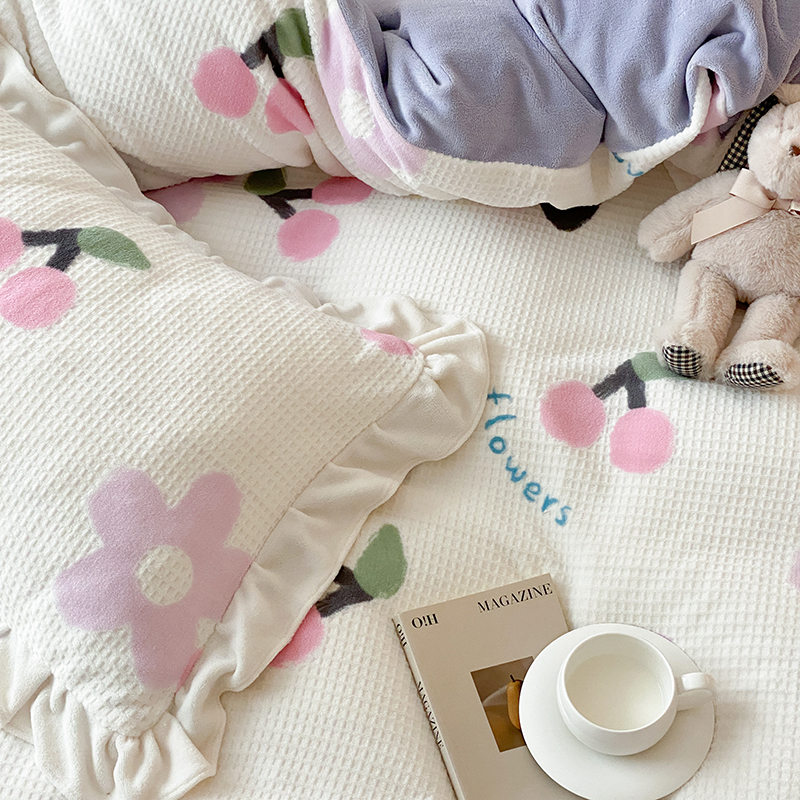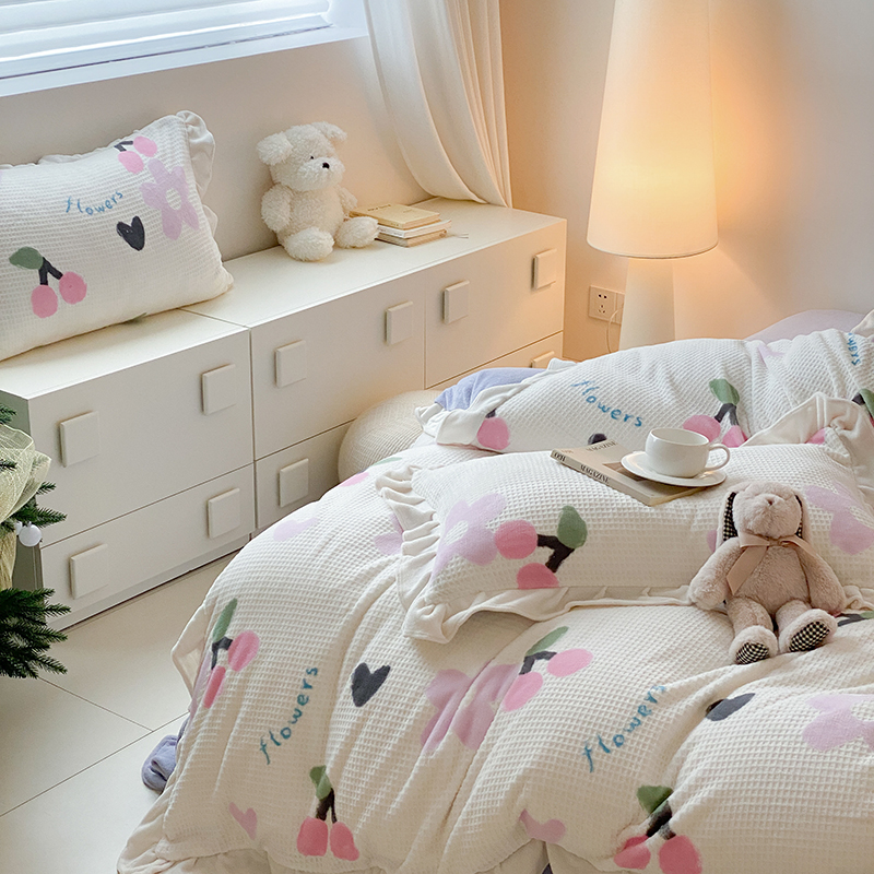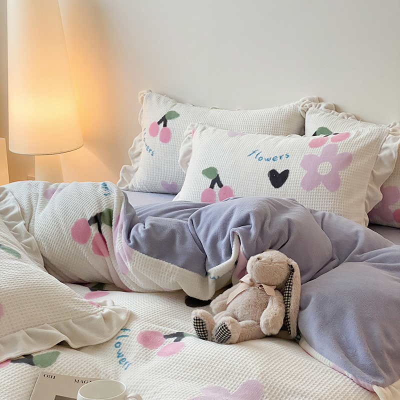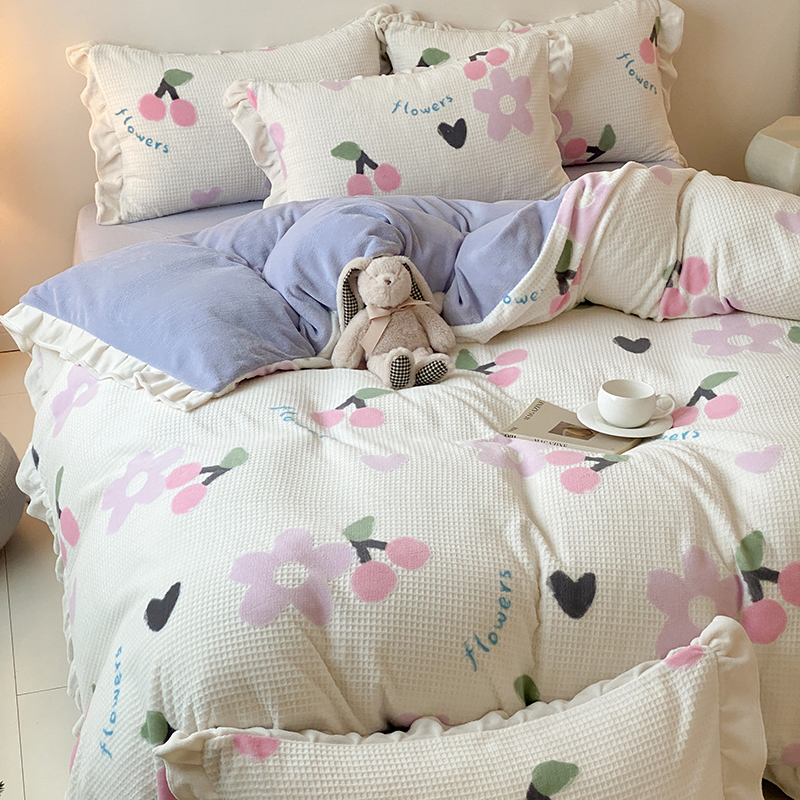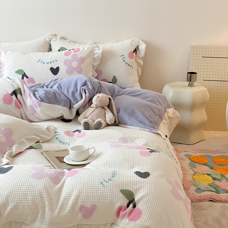 潘朵拉家纺 2023新款雕花韩式华夫格花边牛奶绒四件套 樱樱花语
