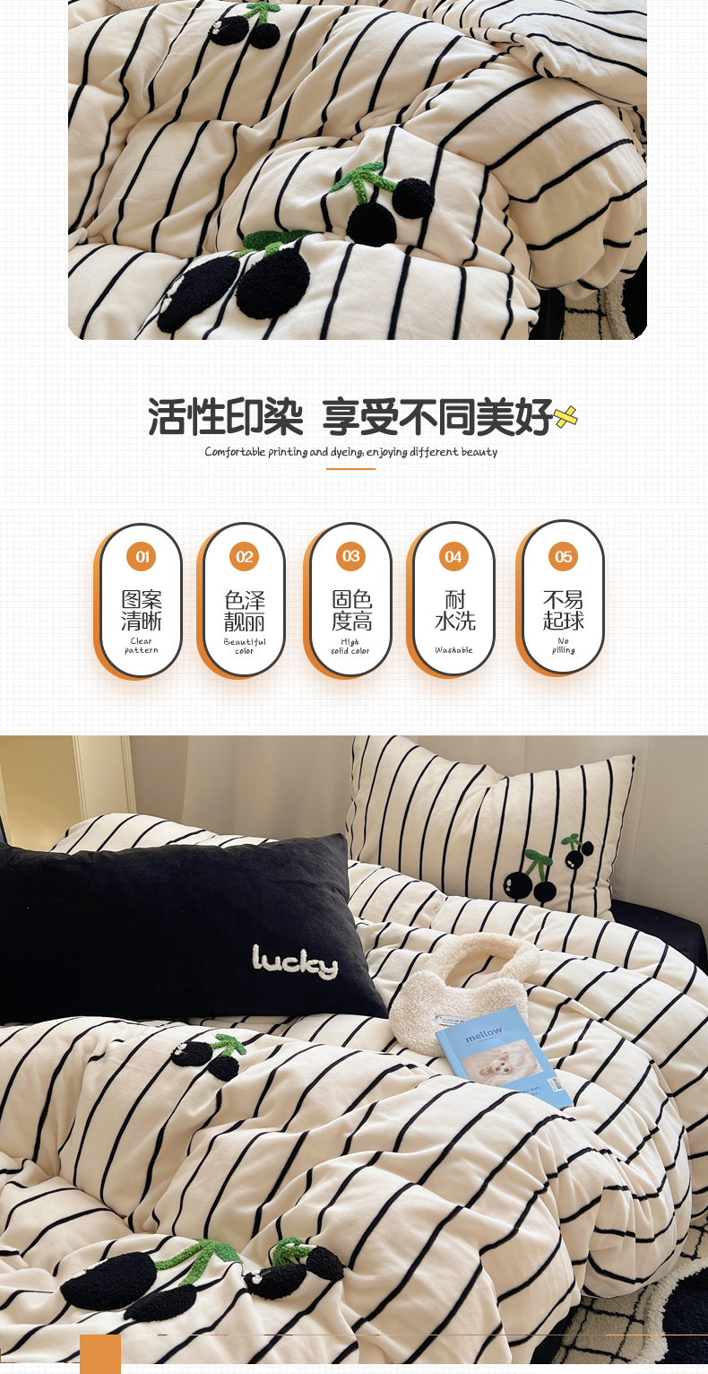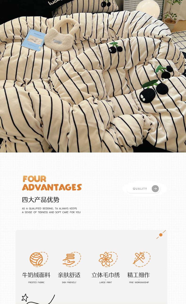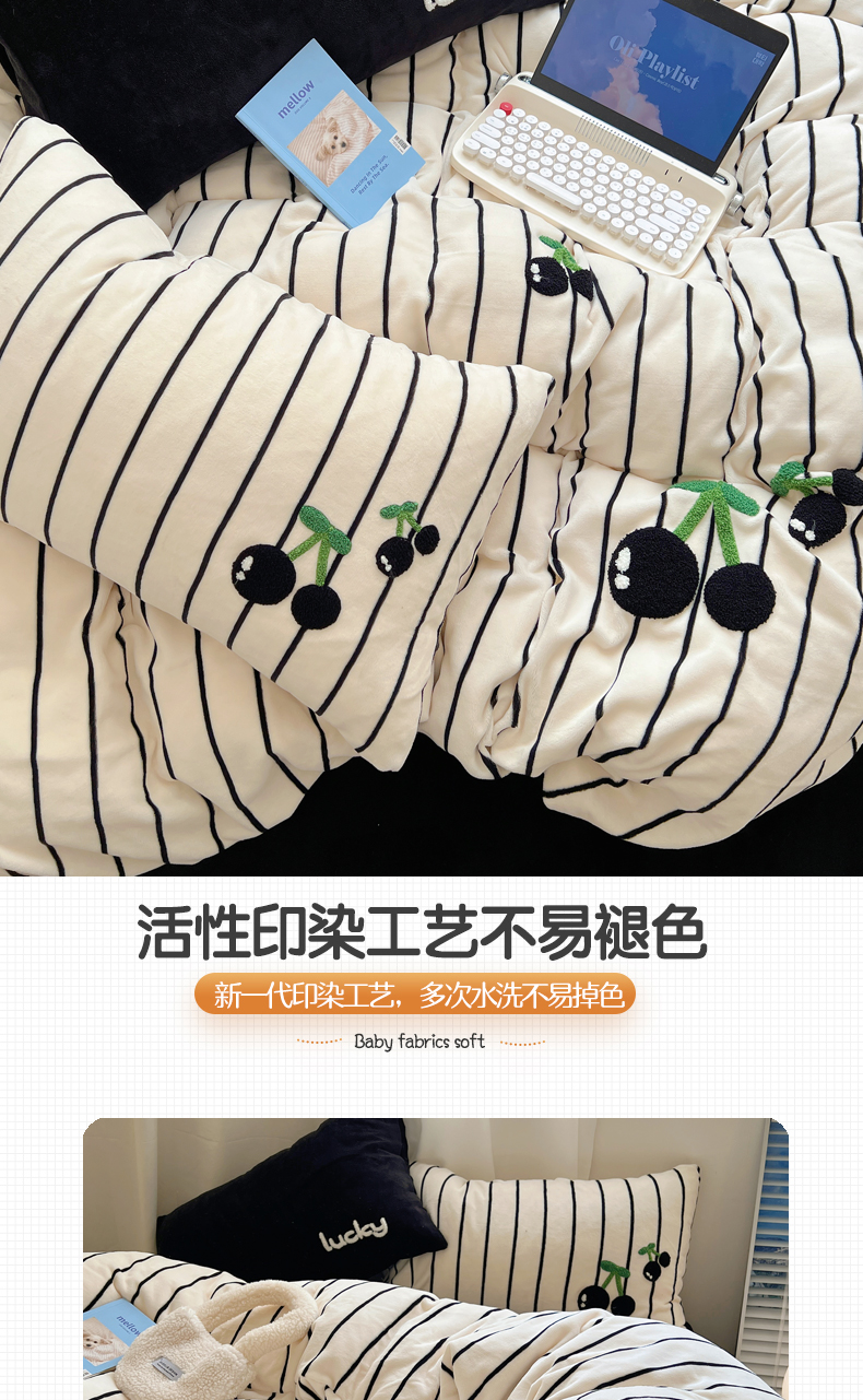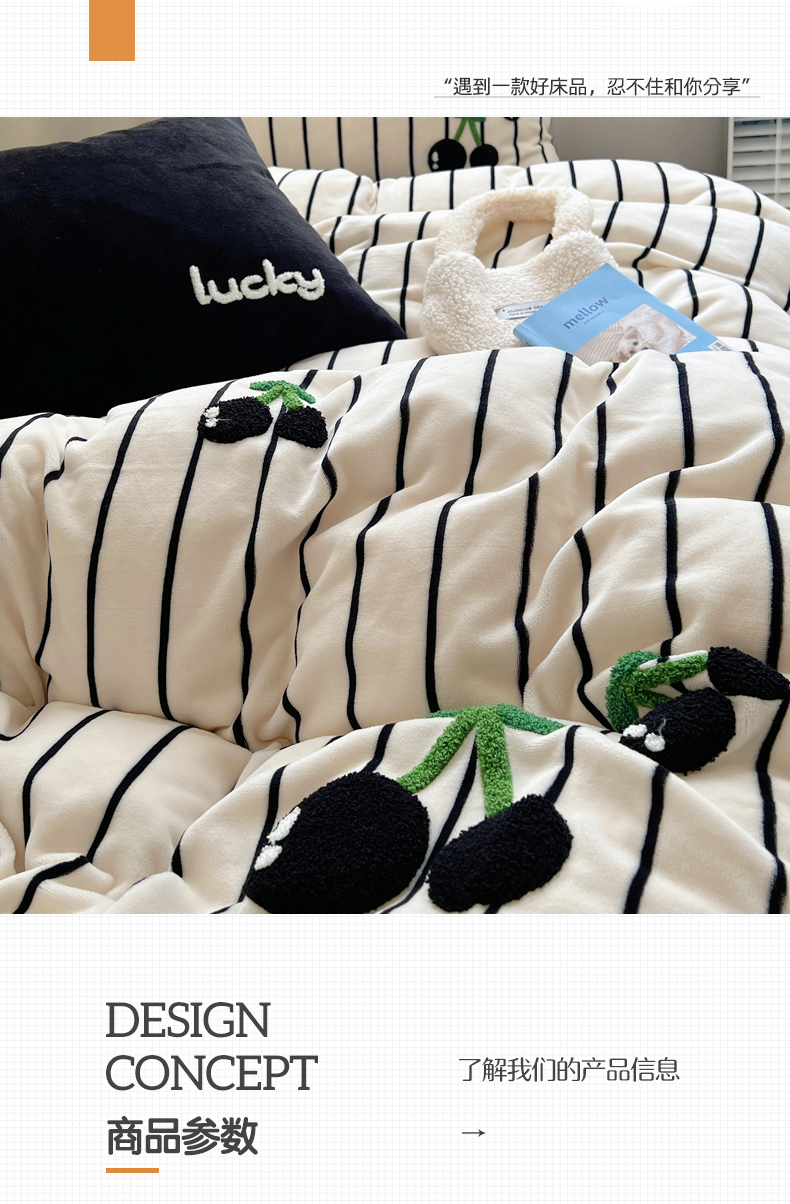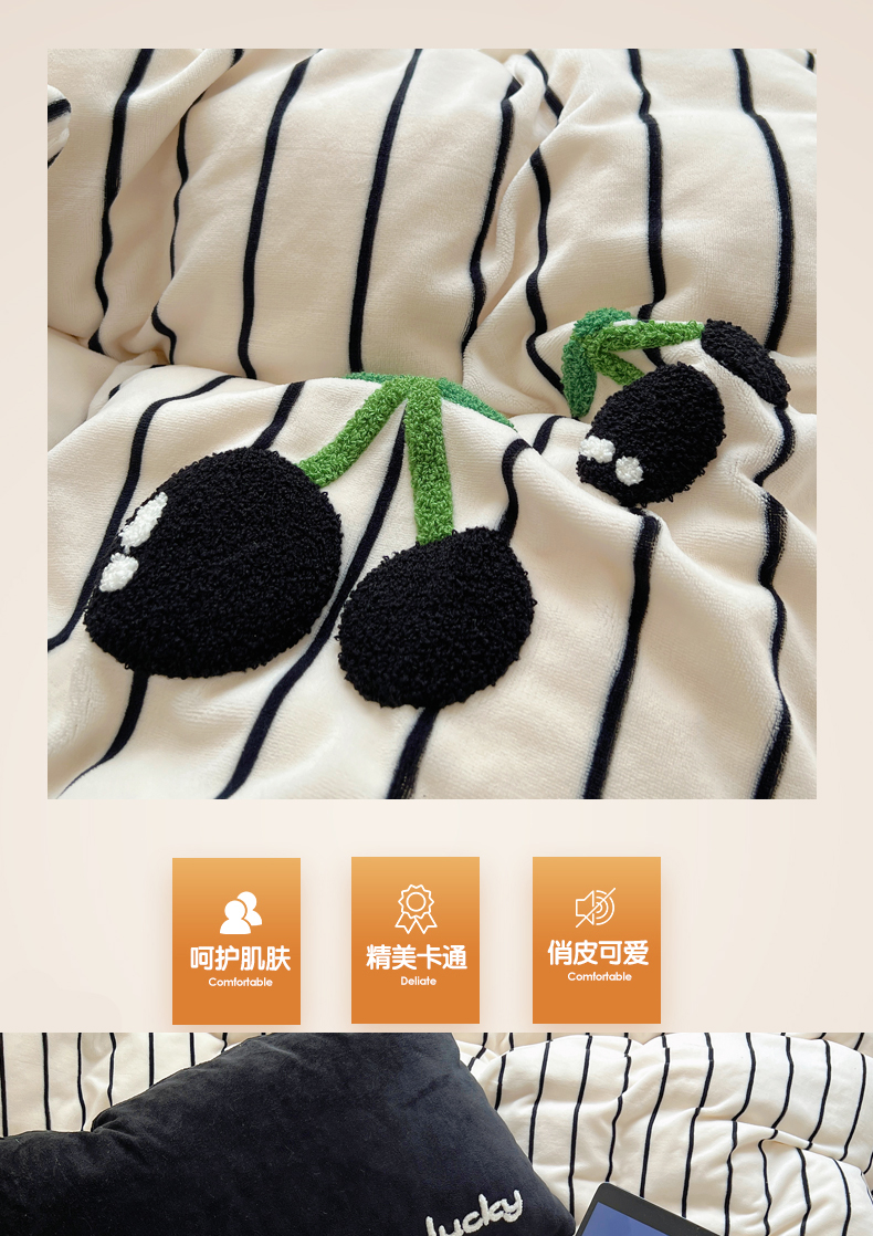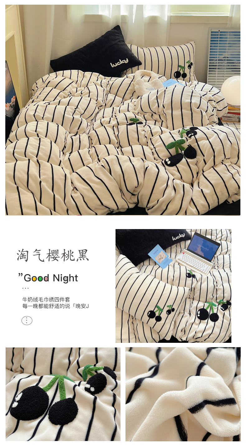 商品名称:三朵家纺 2023新款高克重牛奶绒毛巾绣绣花四件套 淘气樱桃黑
