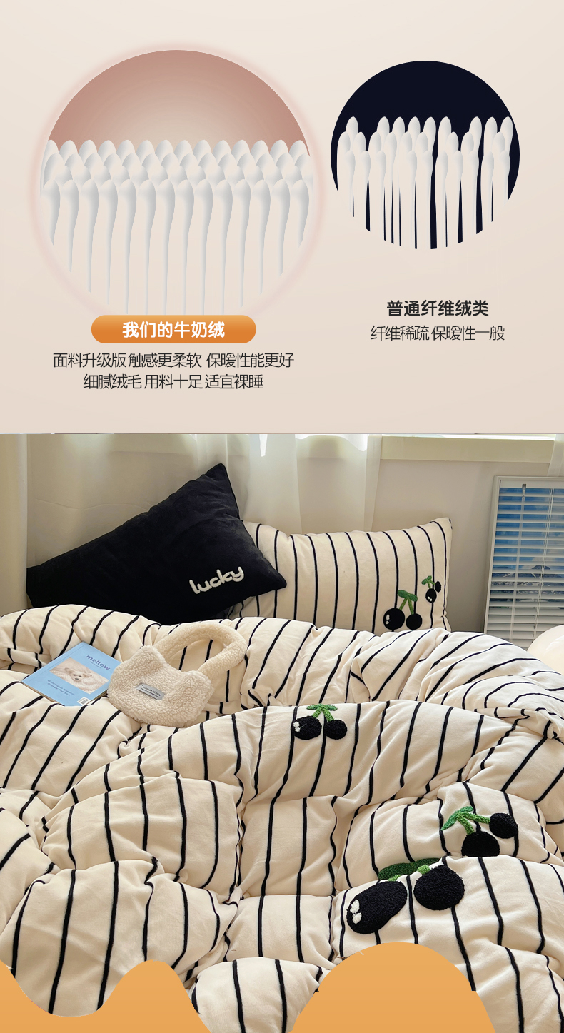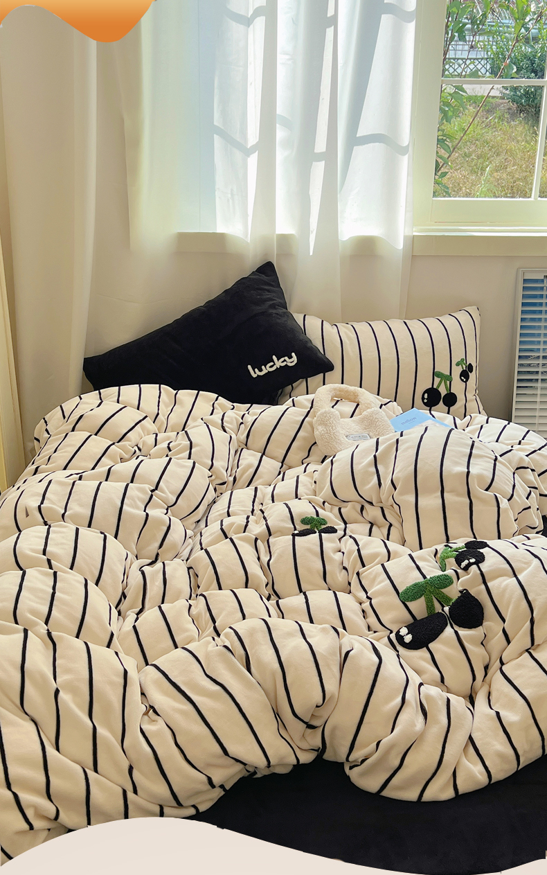 三朵家纺 2023新款高克重牛奶绒毛巾绣绣花四件套 淘气樱桃黑