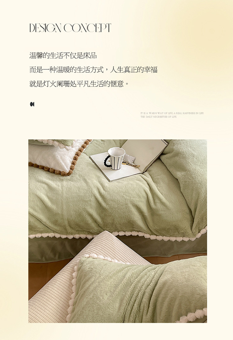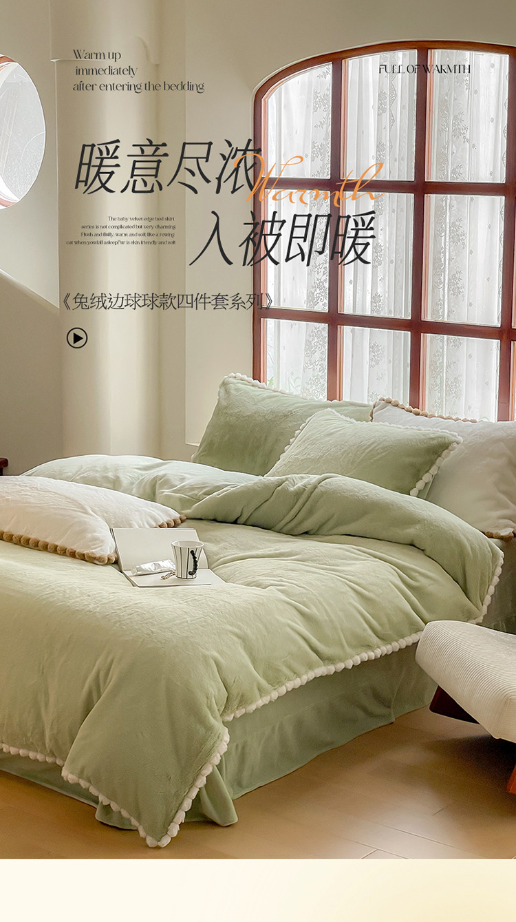 商品名称:名品优仓 2023新款兔绒边带球球款纯色系列四件套-兔绒球球 兔绒球球-青稞绿